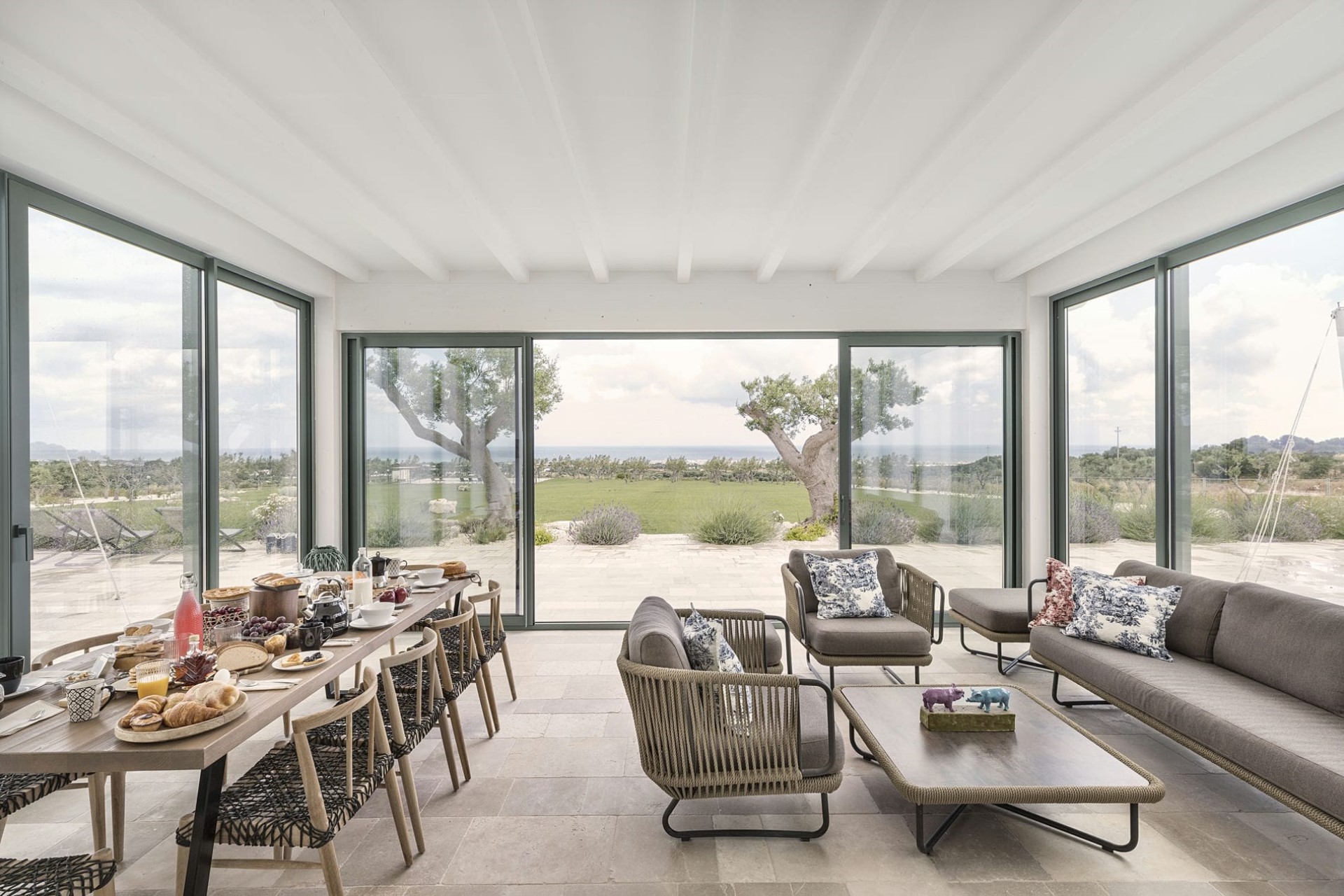 Seamlessly blending the outdoor and indoor spaces, guests are welcomed into the villa via a conservatory. With three walls featuring floor-to-ceiling windows and sliding glass doors, the space is flooded with natural light, making it ideal for enjoying a relaxed breakfast or sipping a morning coffee amid the changing light.
