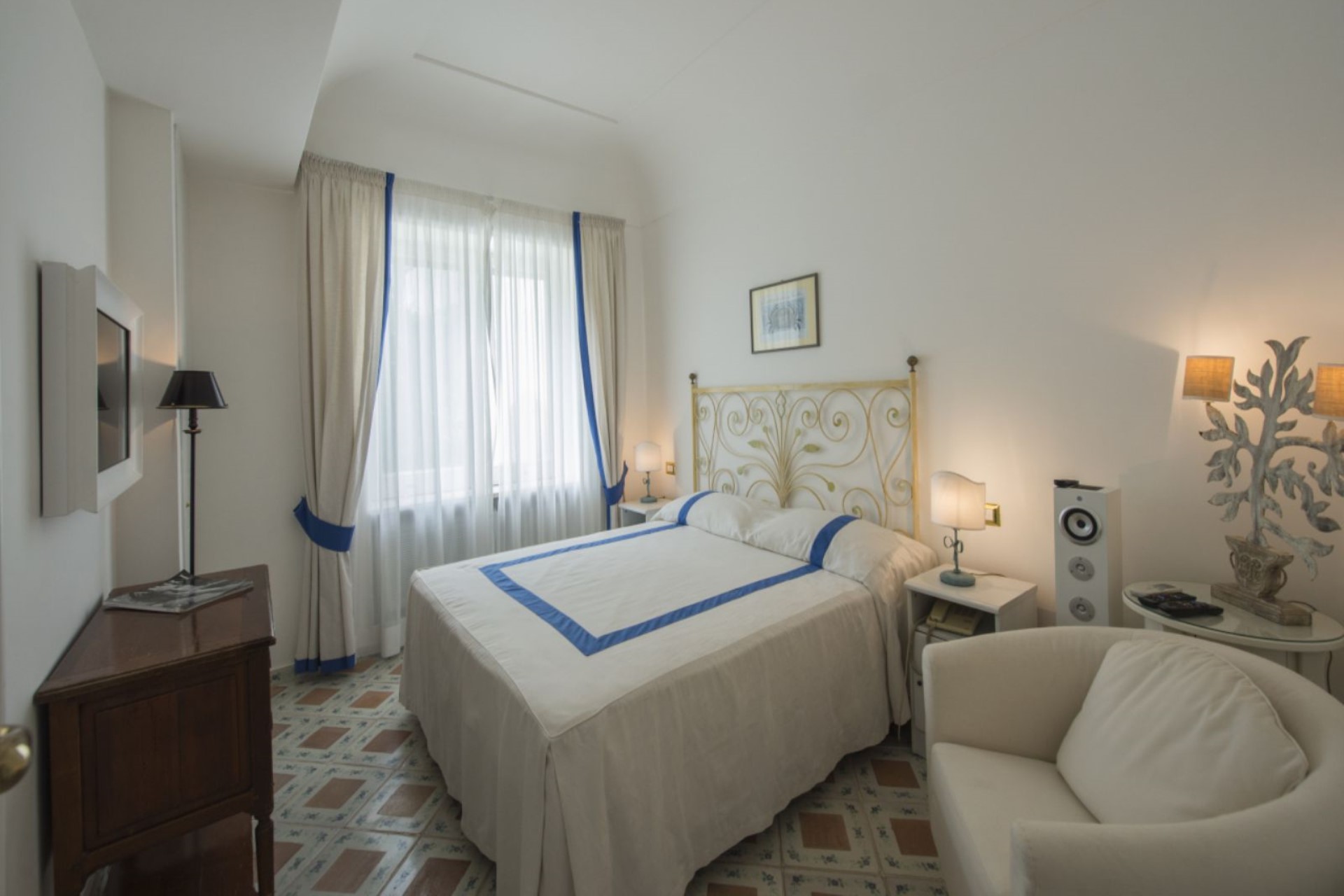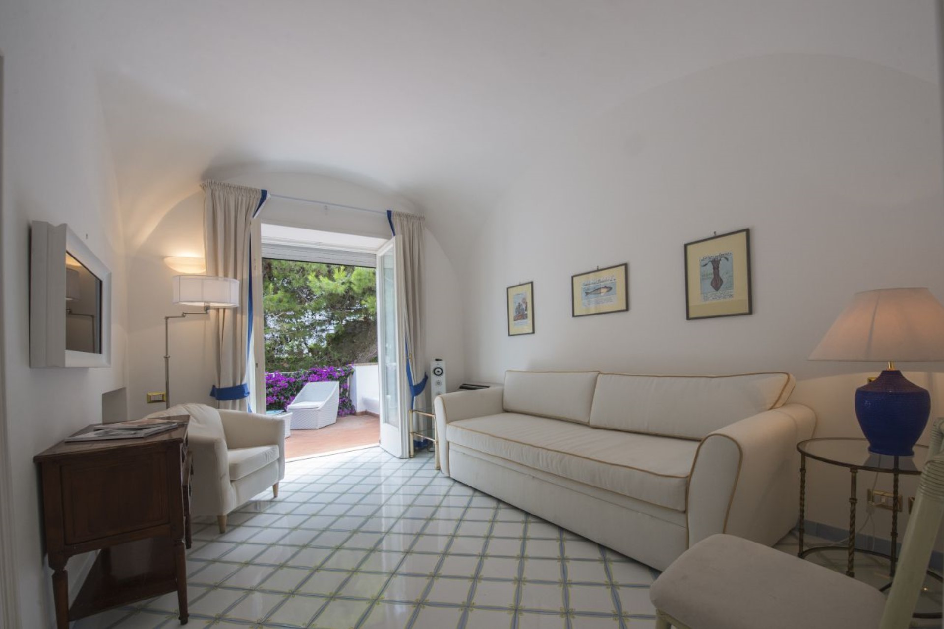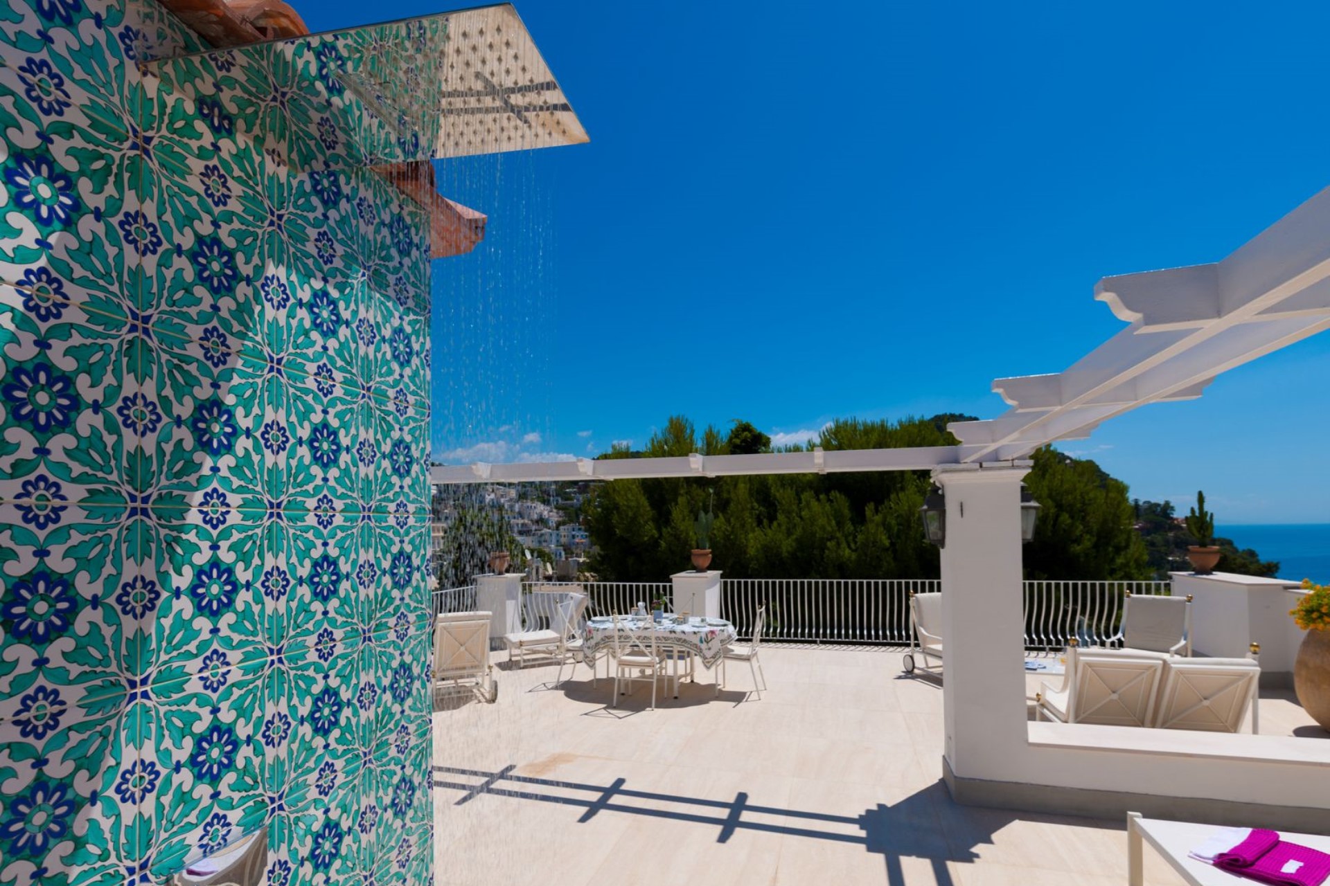 One of the highlights of the property is the rooftop terrace, situated up a flight of 20 steps from the second floor. Guests can take in the views of Capri and the Faraglioni rocks from the beautiful seating areas with lounge and sofa chairs, or dine al fresco.