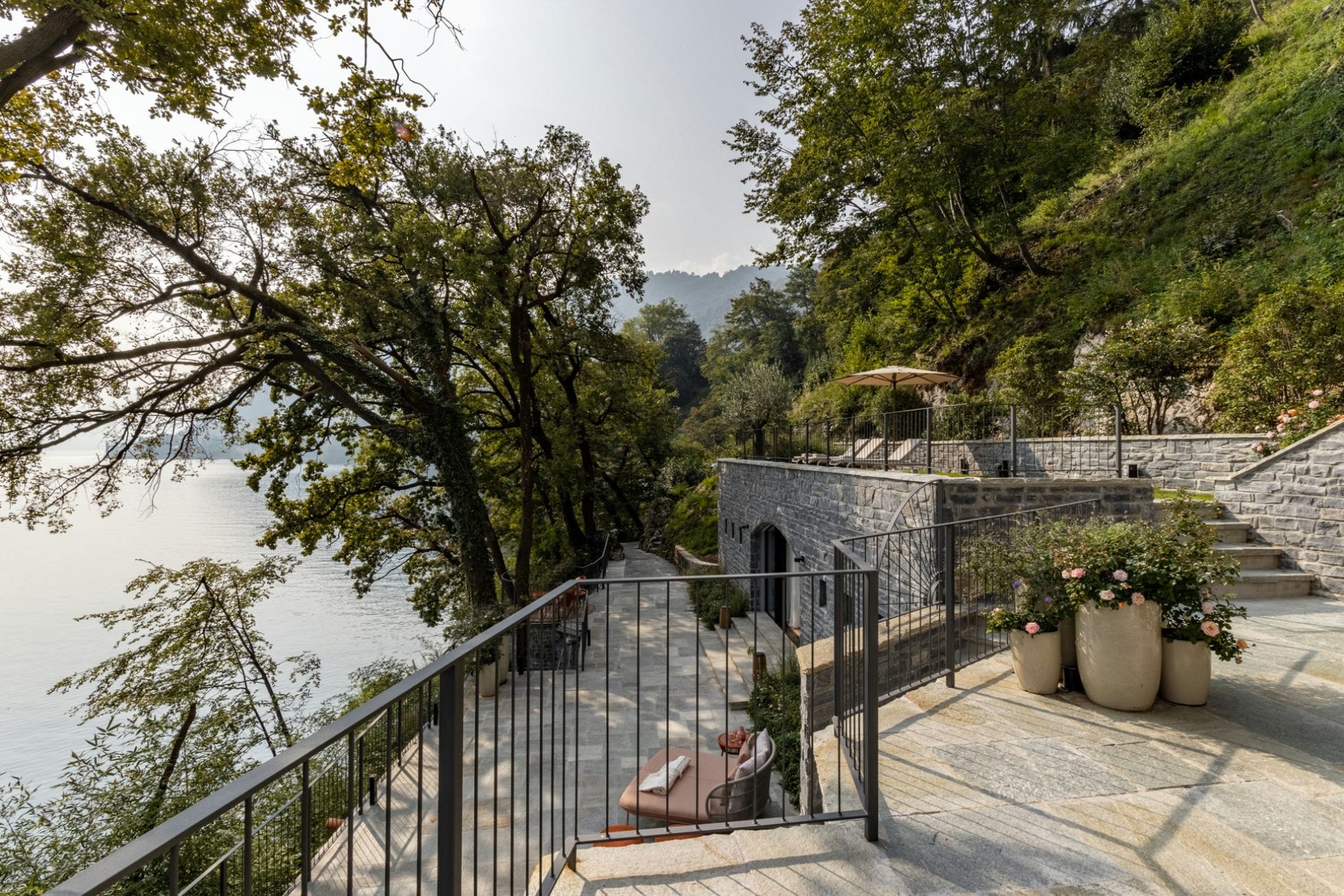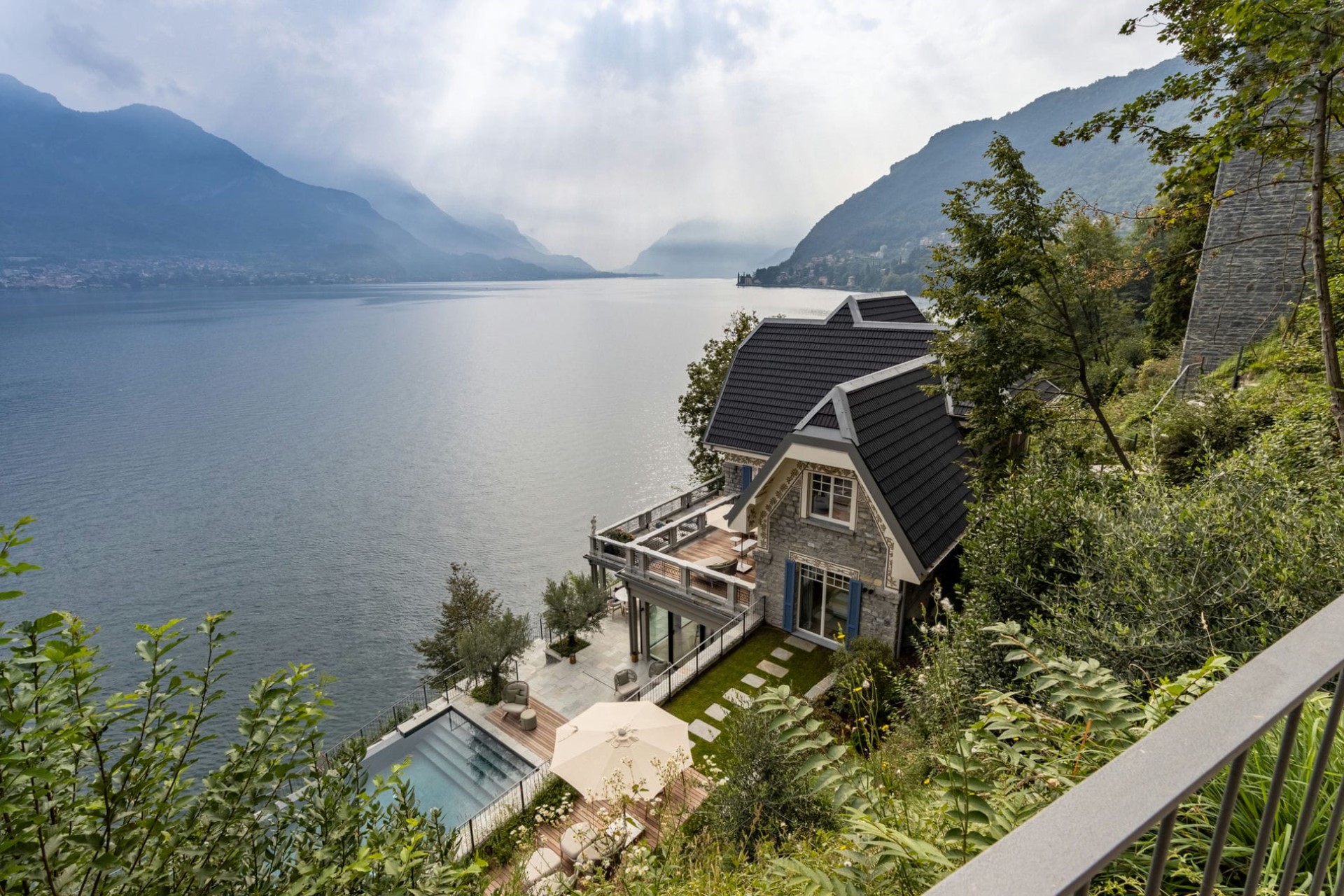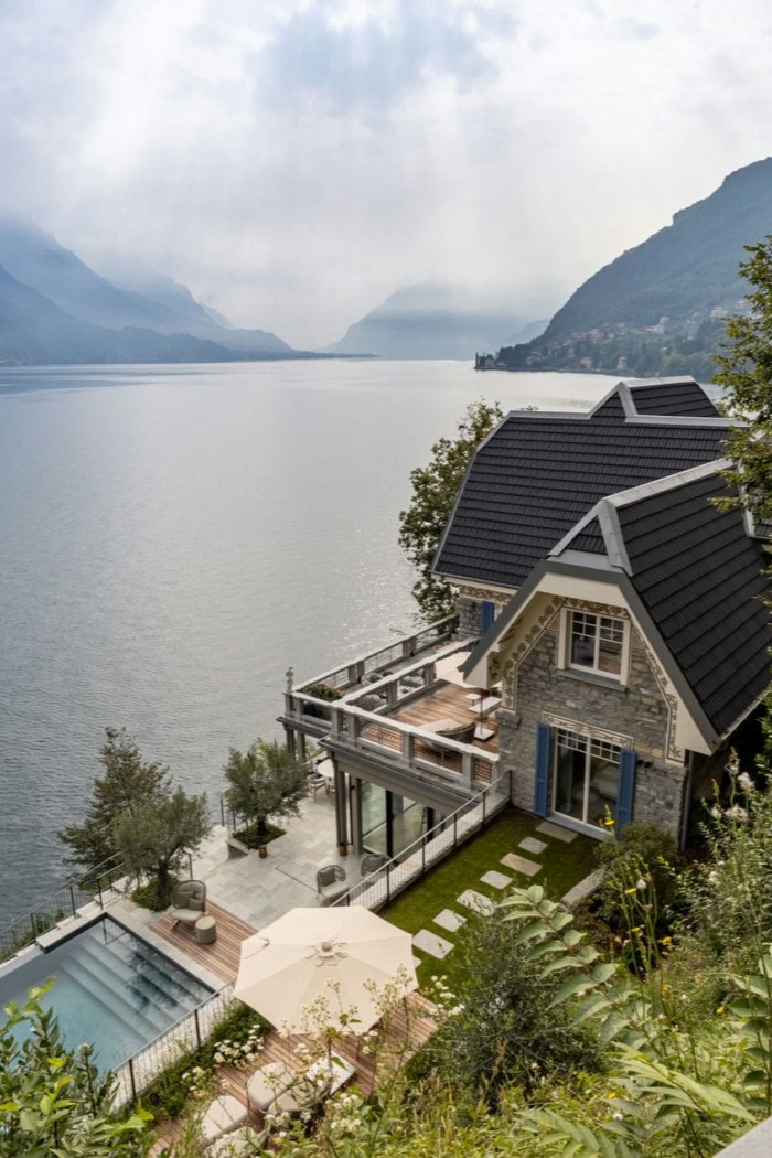 A beautifully-restored villa with sprawling terraces, a heated infinity pool, and direct lake access