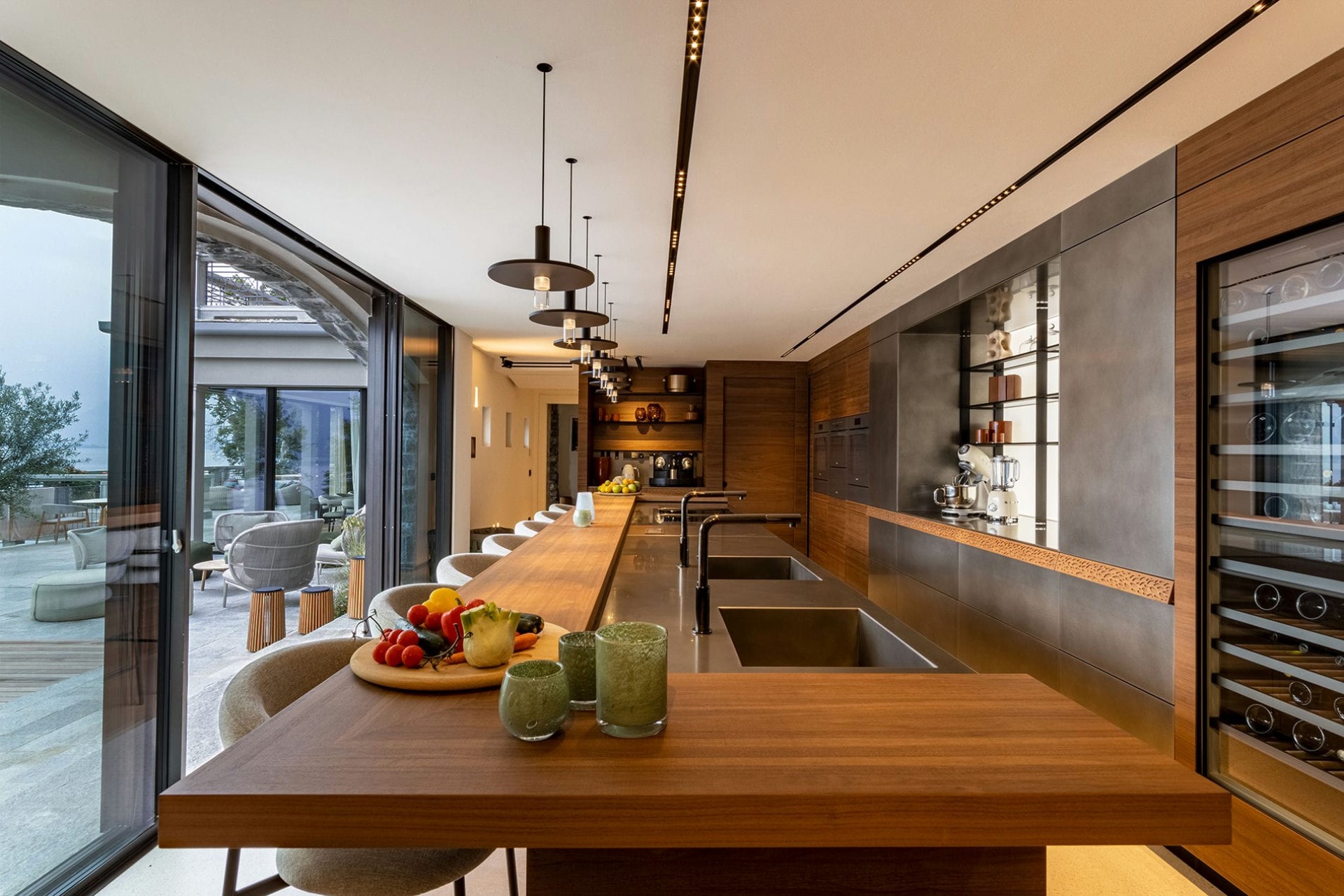 The stunning kitchen with a long breakfast bar is fitted with all the modern appliances needed to cook up delicious feasts. Guests can enjoy fresh espresso in the morning and select their favourite tipple from the wine fridge for the evening.