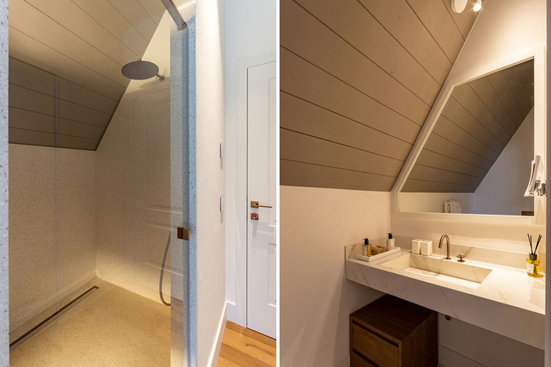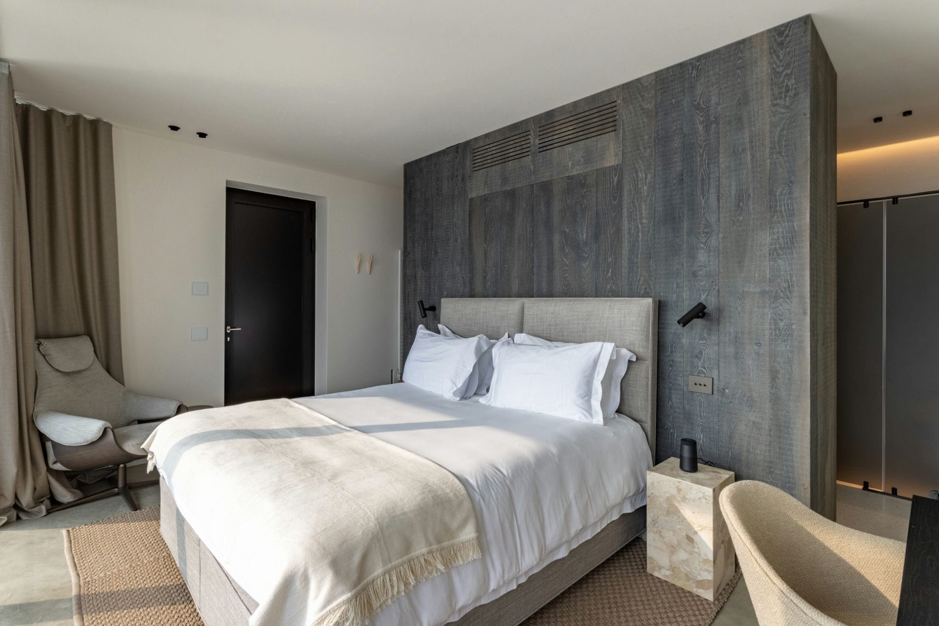 Suite 7 – king-size bed, en-suite bathroom with dual vanity & shower, terrace access, and lake views