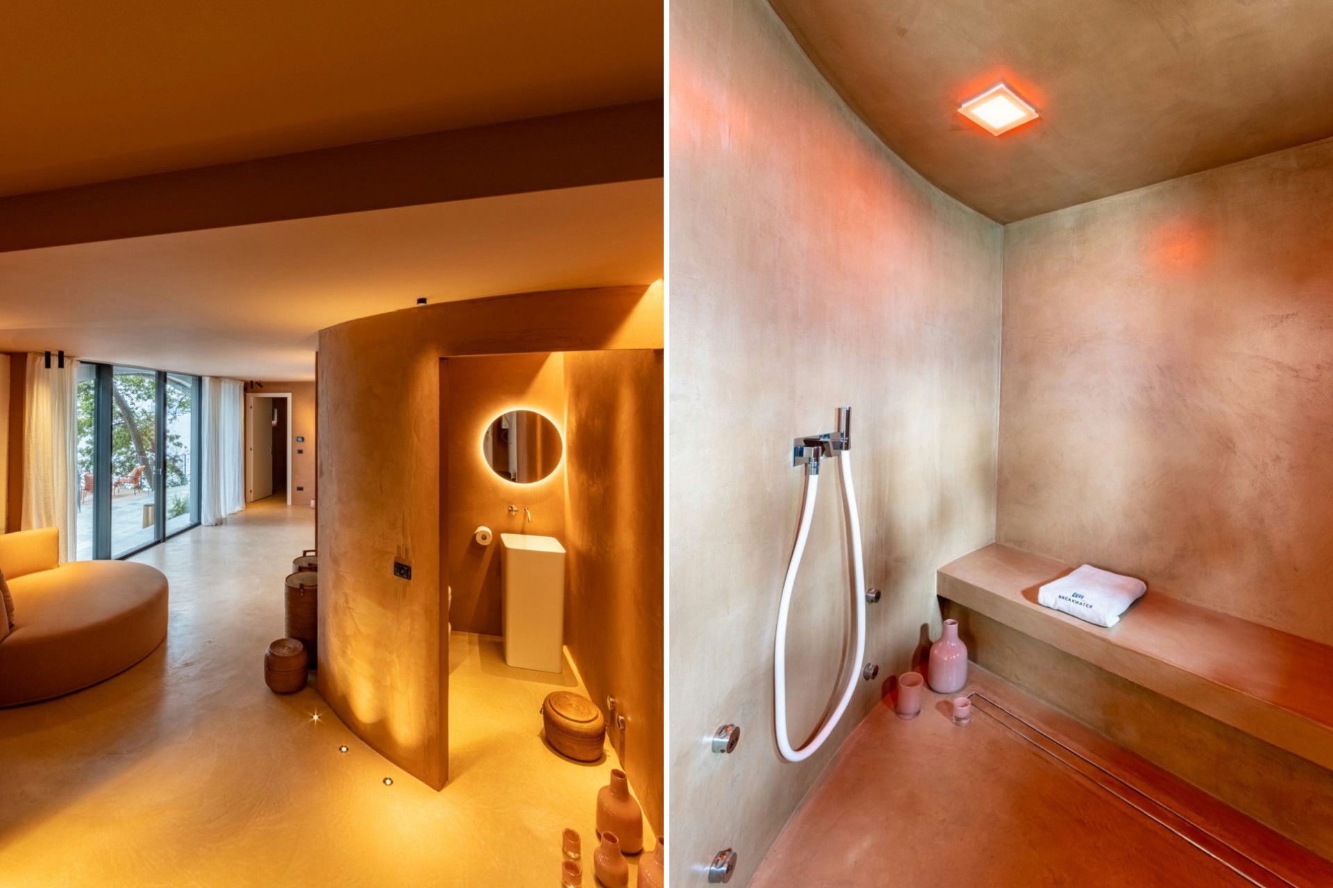 Master Suite – king-size bed, private living room with bathtub, en-suite bathroom with dual vanity and shower + outdoor shower, 2 x private balcony, terrace access, and lake views
