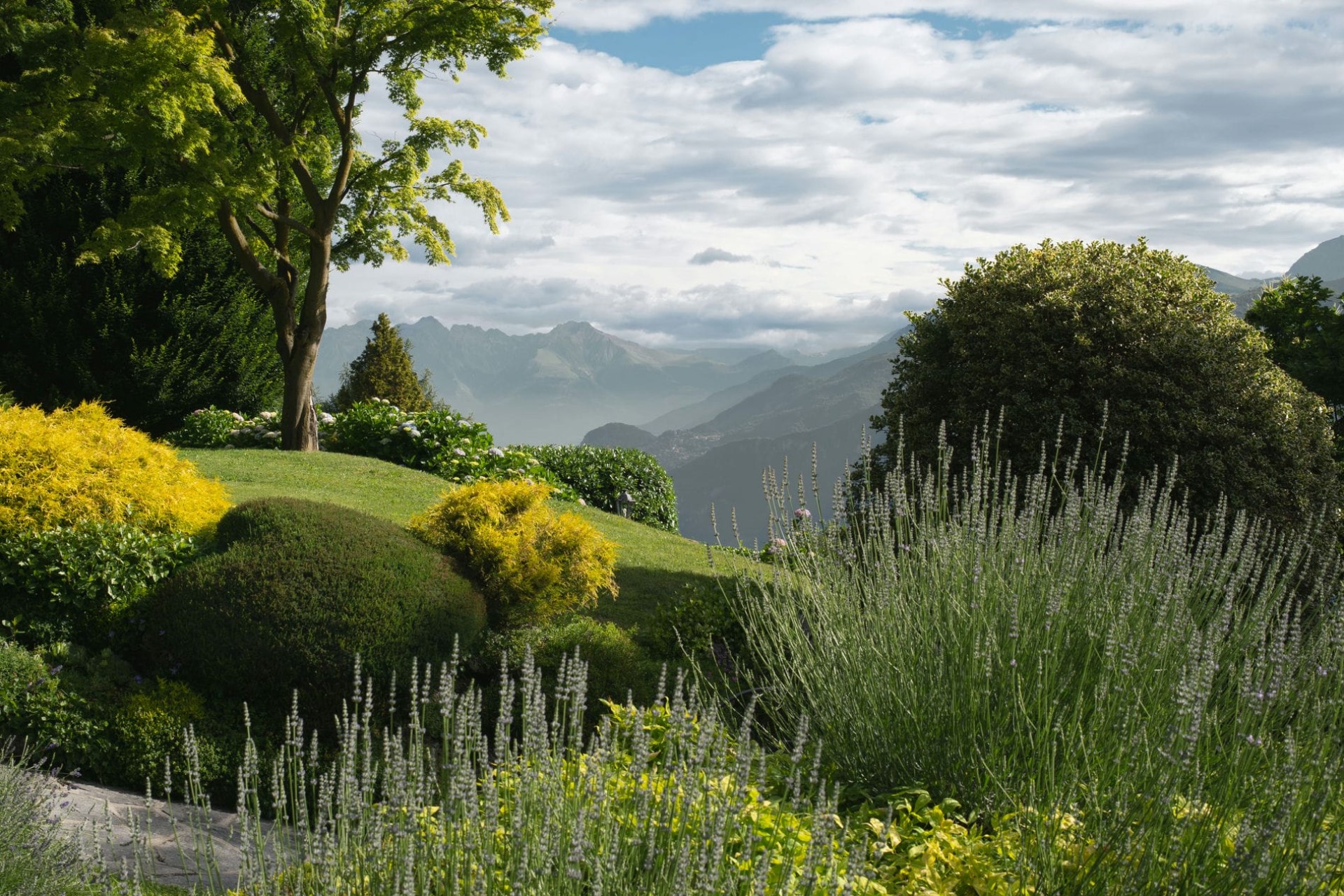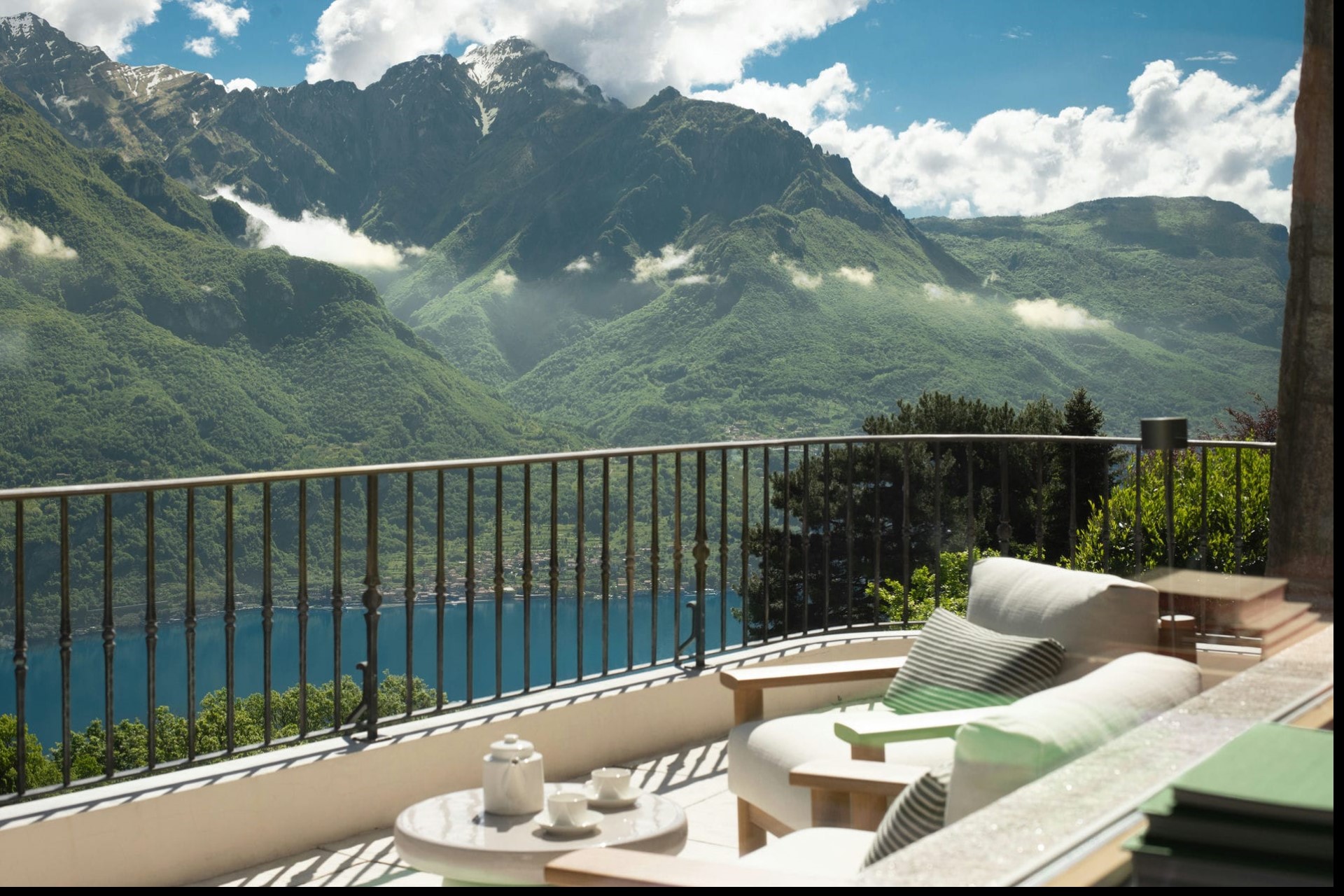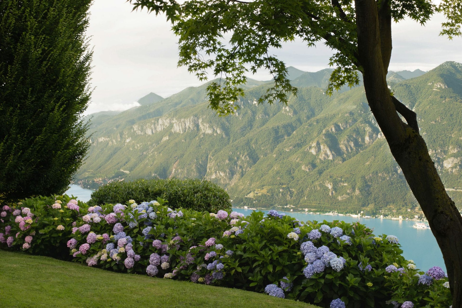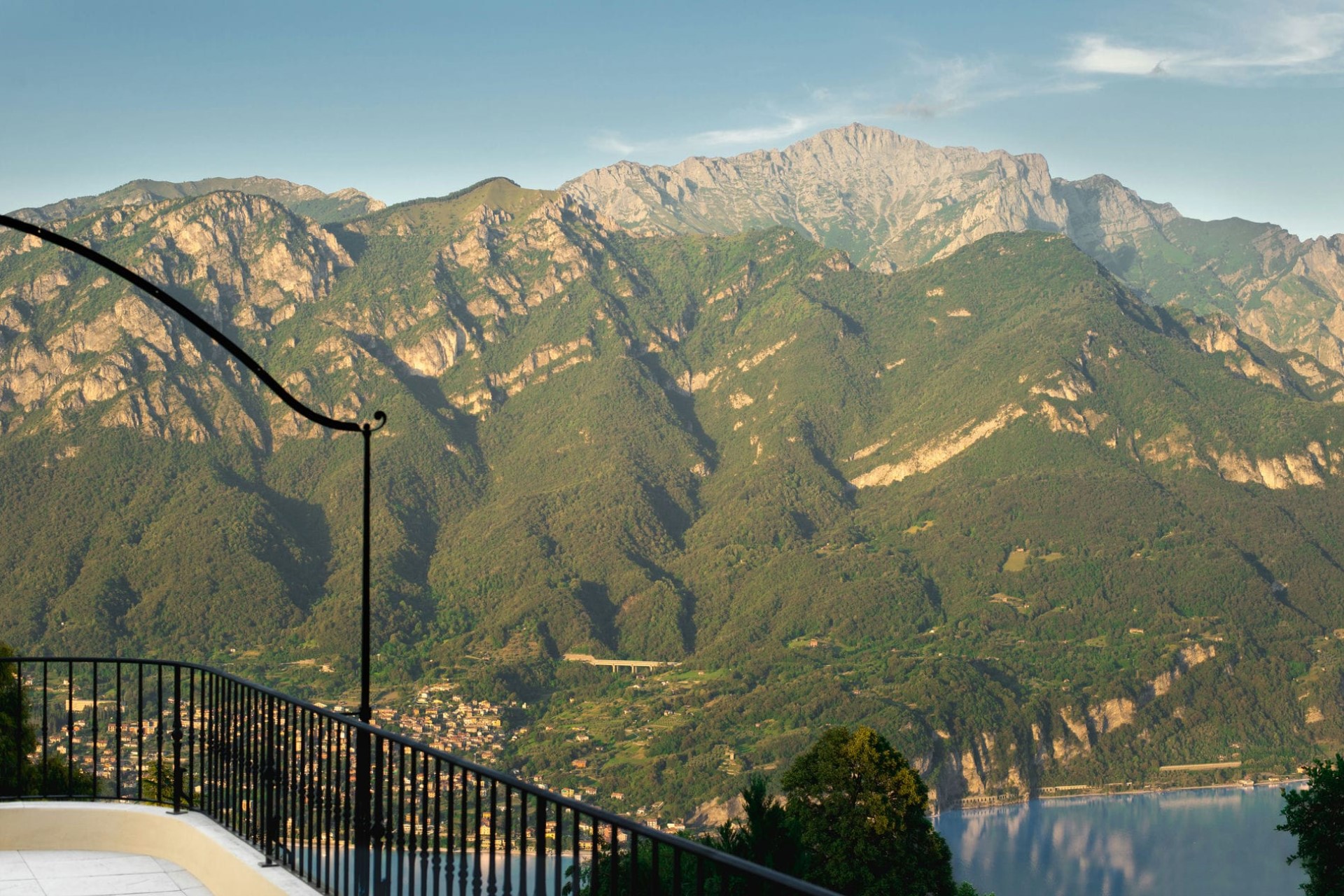 A luxurious villa with sprawling gardens perched on the mountainside above Lake Como