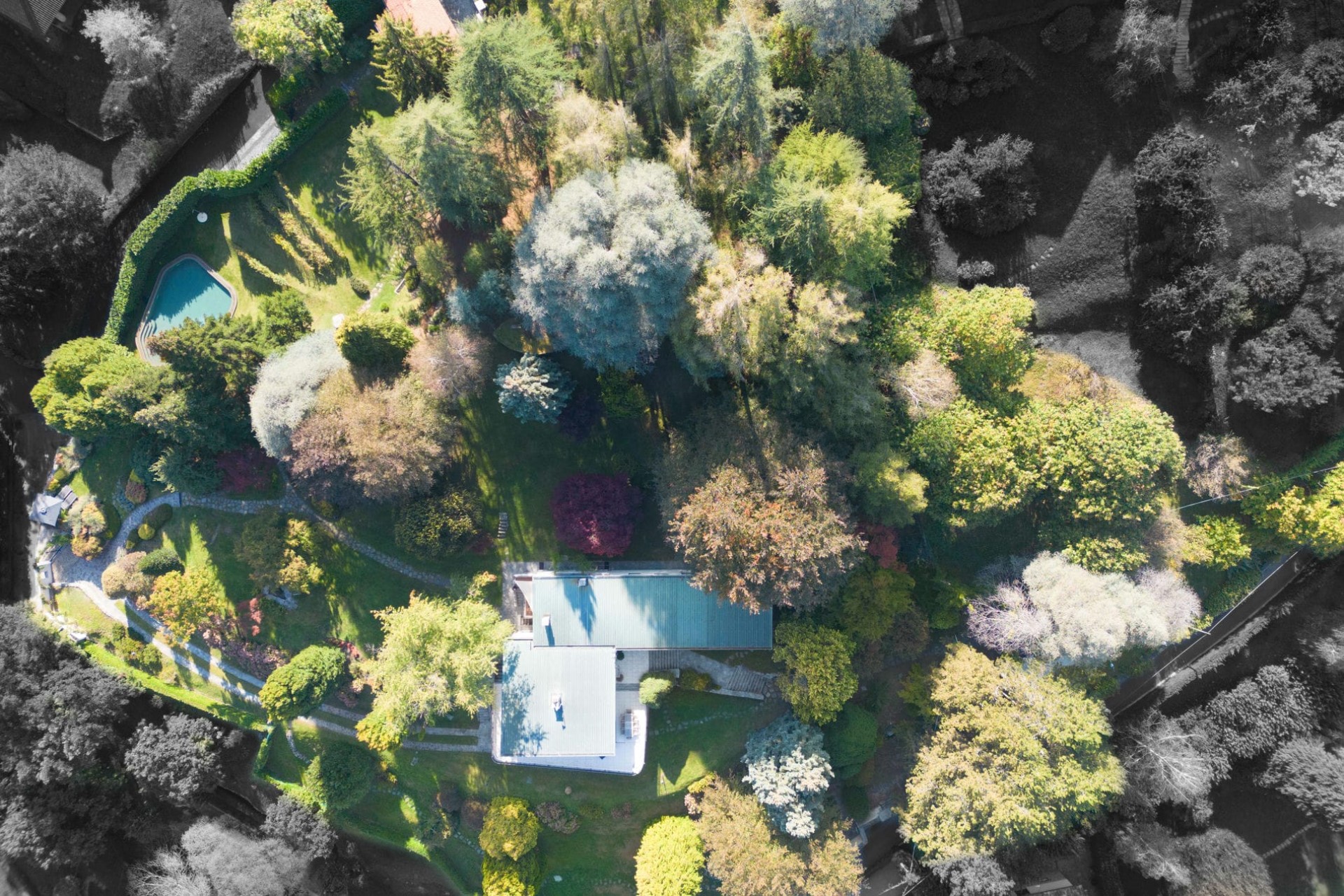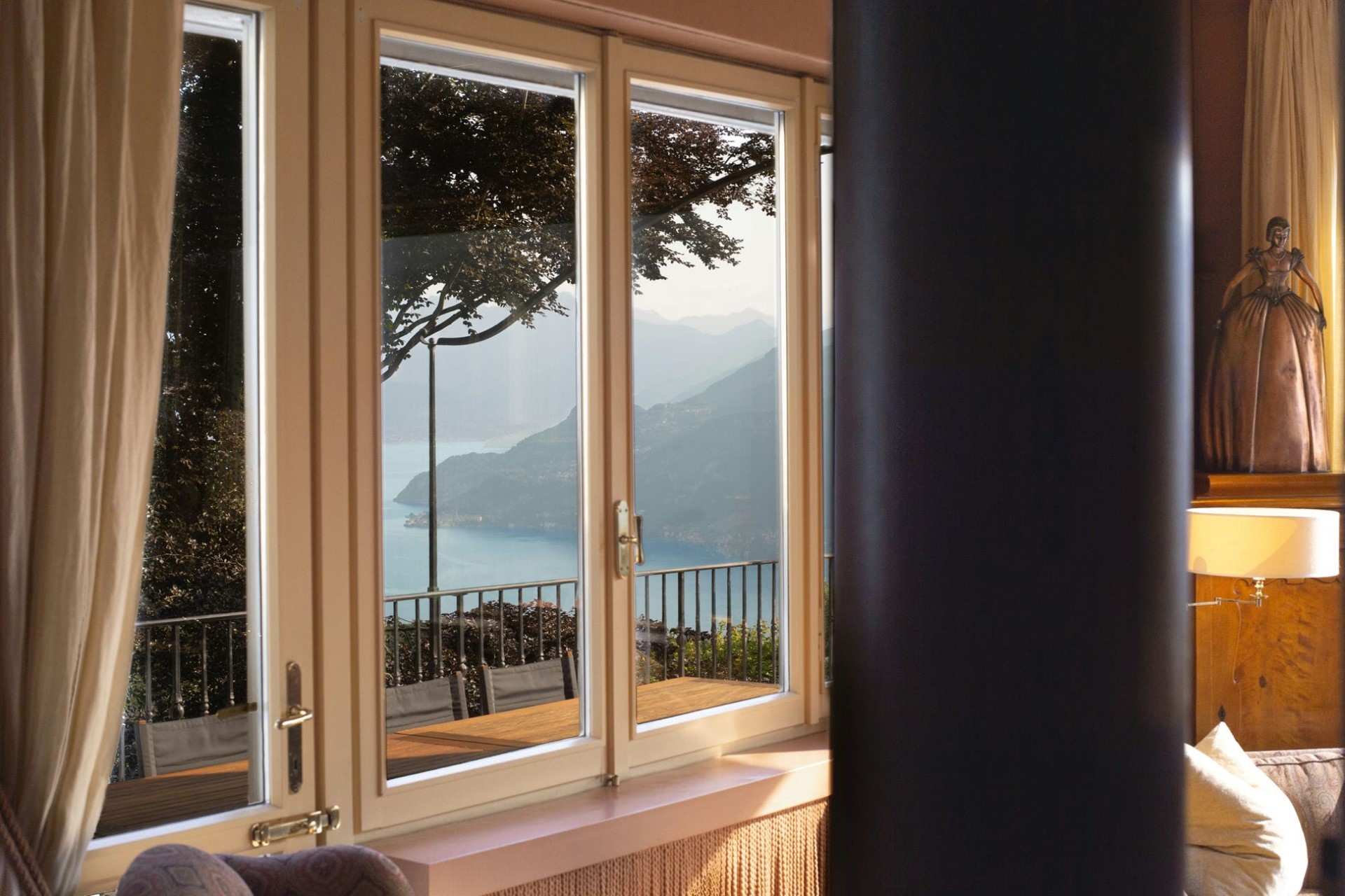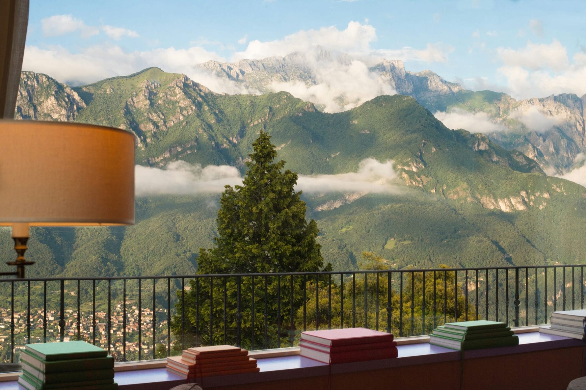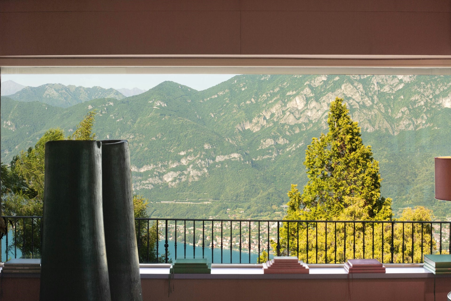 A luxurious villa with sprawling gardens perched on the mountainside above Lake Como