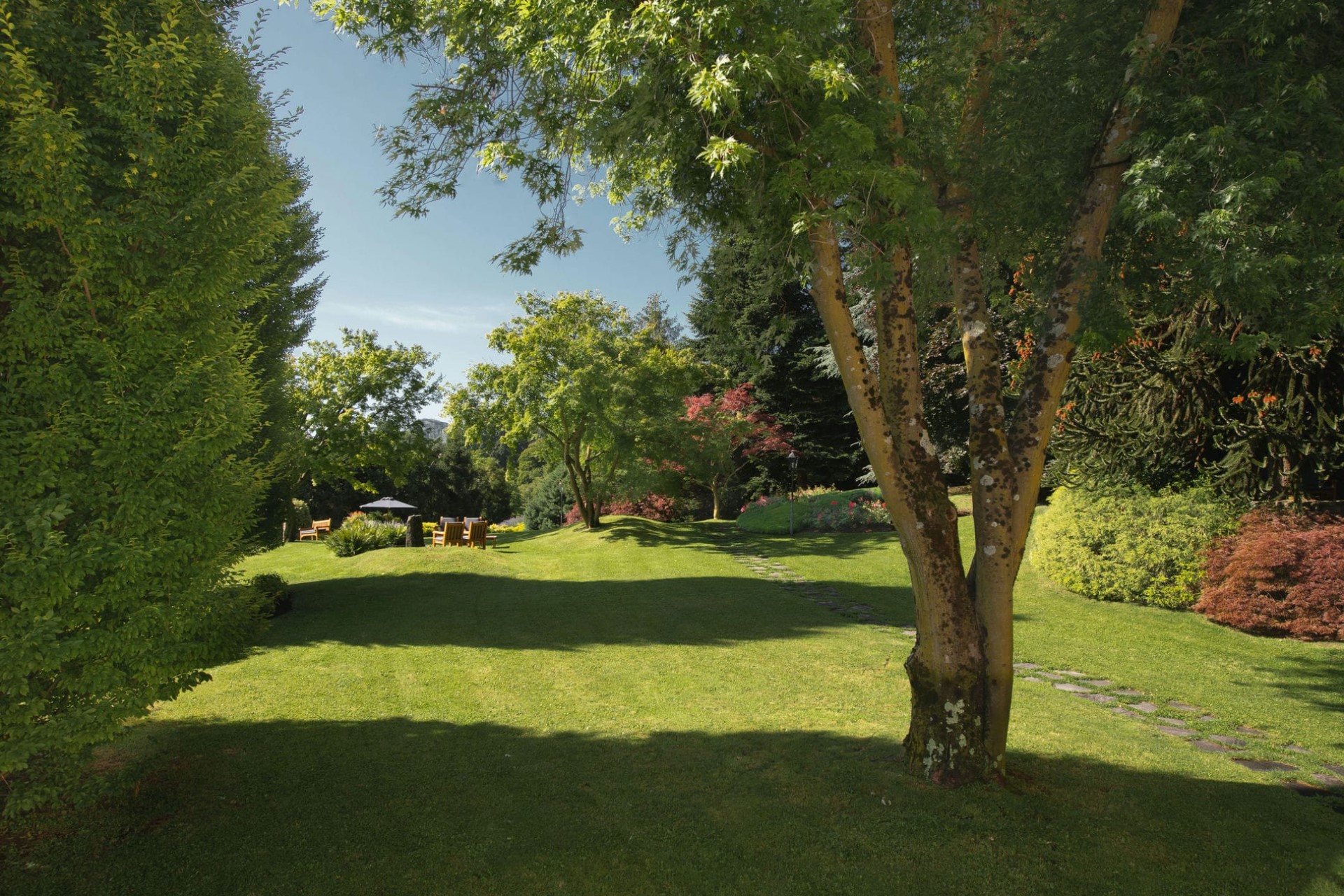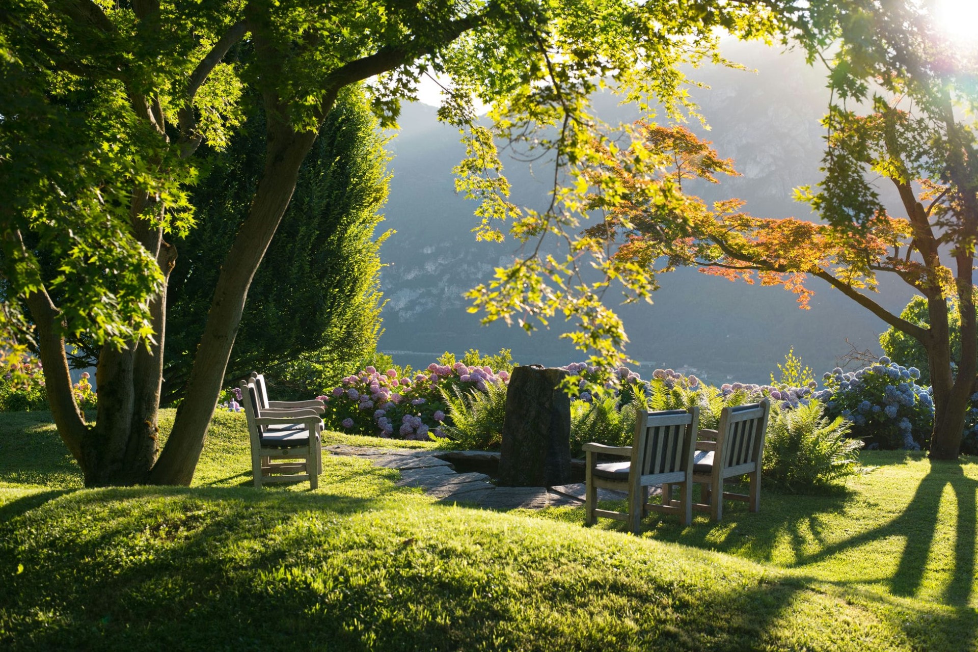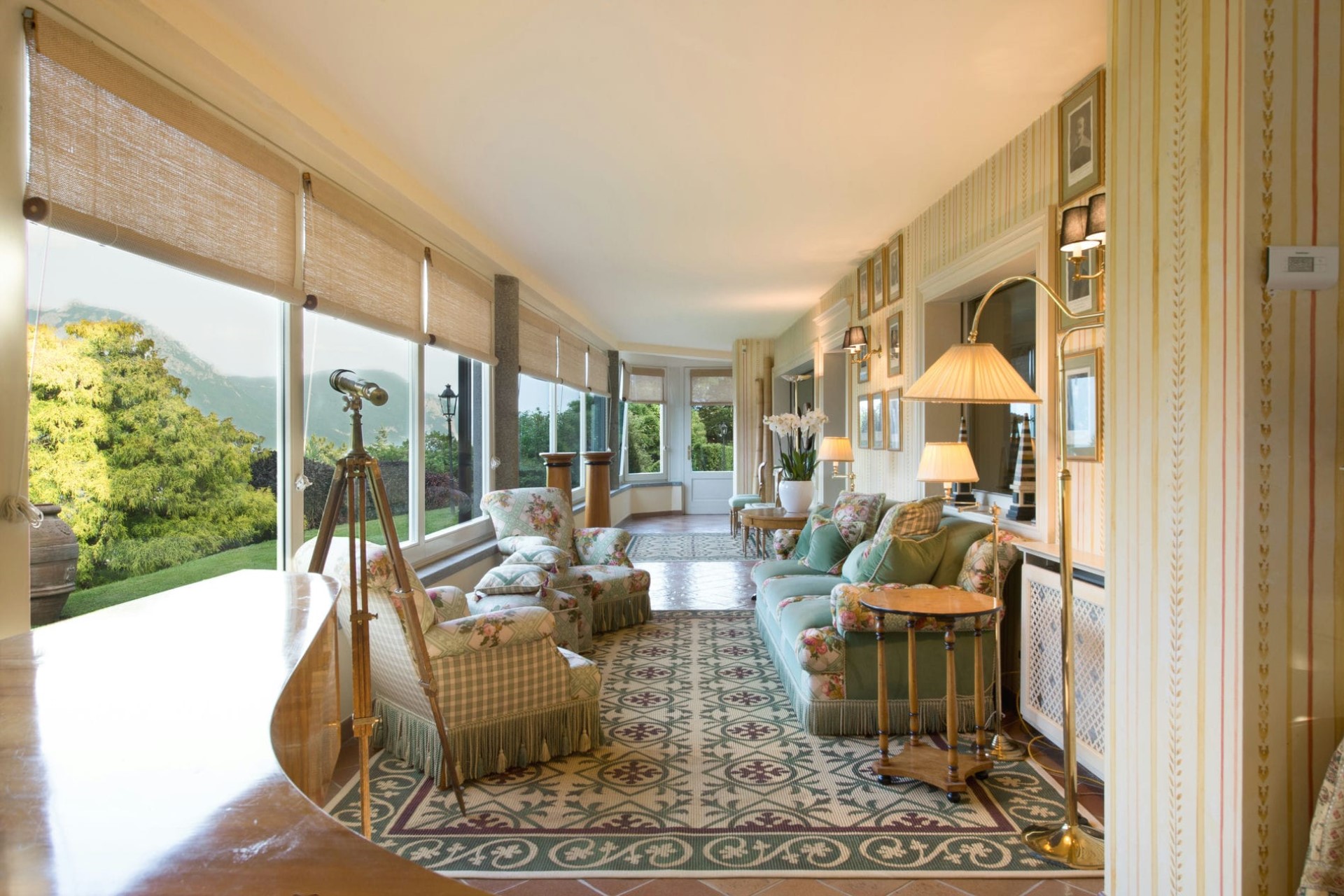 Set on 12,000 square metres, the villa offers guests total privacy in the most peaceful of surroundings. The lush gardens are filled with hundreds of plant species and dotted with pretty statues and water features, creating a true nature’s paradise. An observation deck with a mounted telescope is the perfect place to take in the incredible lake views.