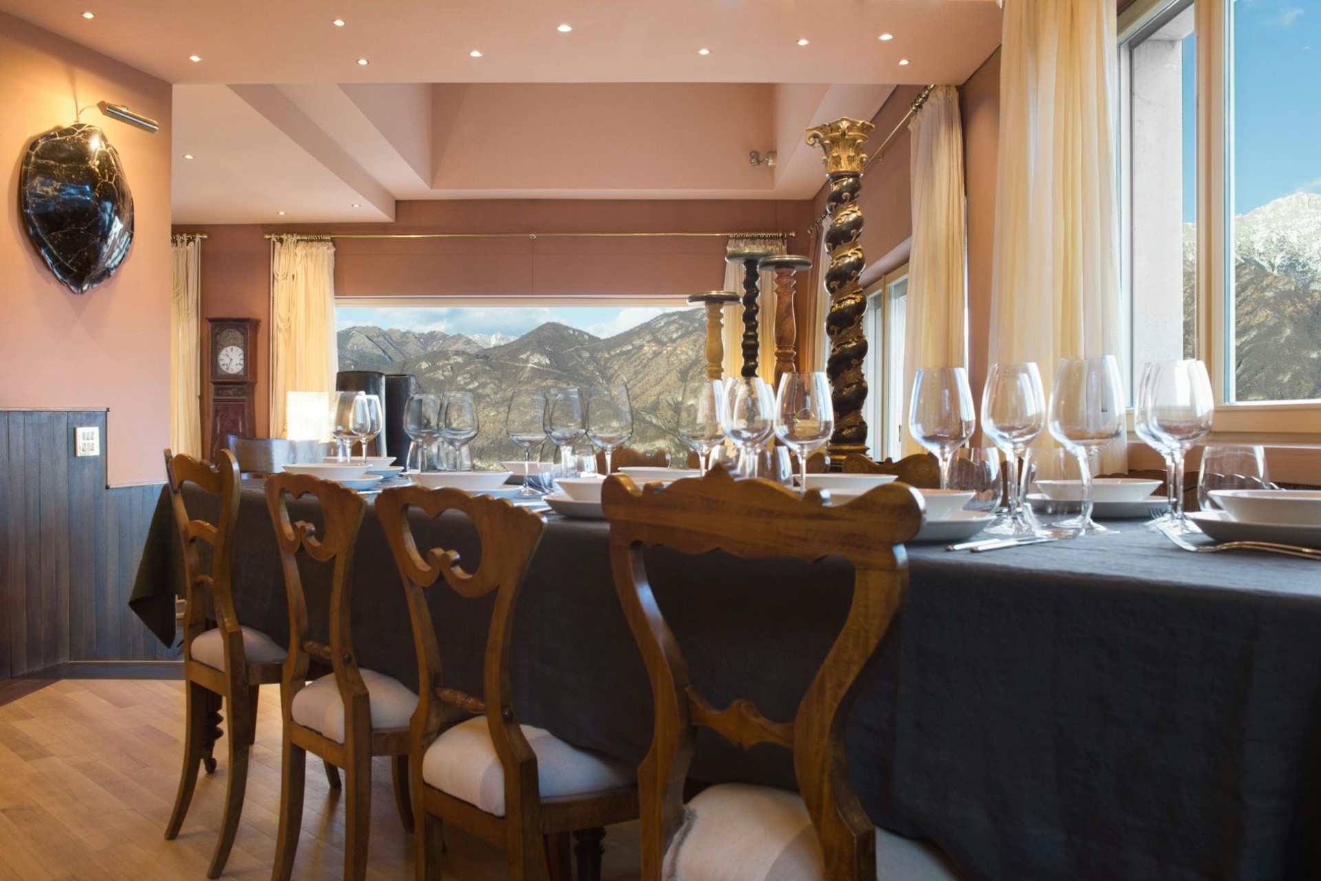 A state-of-the-art kitchen is fully equipped with modern appliances, perfect for preparing delicious feasts. The kitchen features a breakfast table for casual meals, whilst elegant dinner parties can be enjoyed in the formal dining room with a spectacular mountain backdrop.