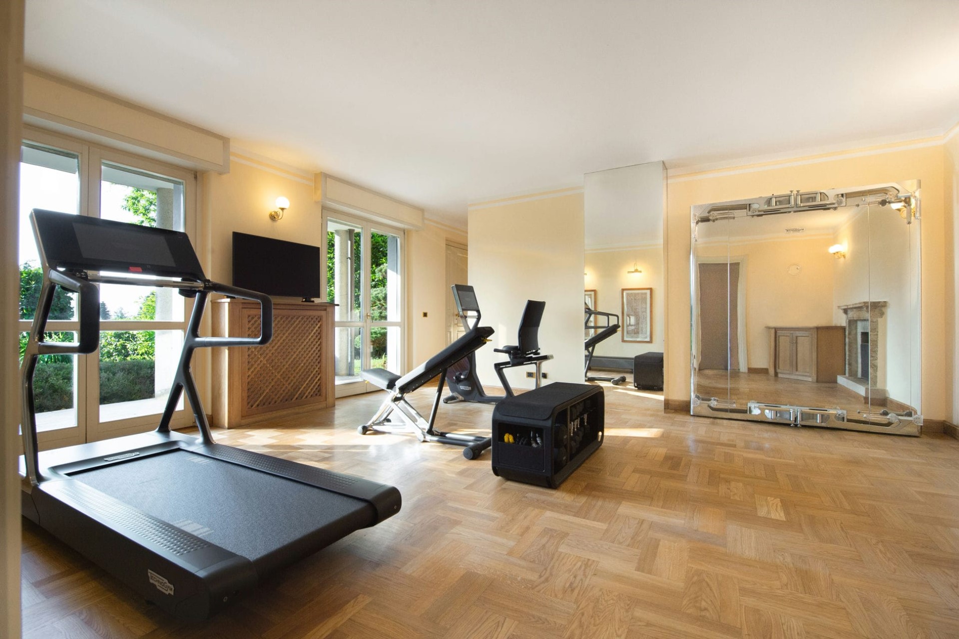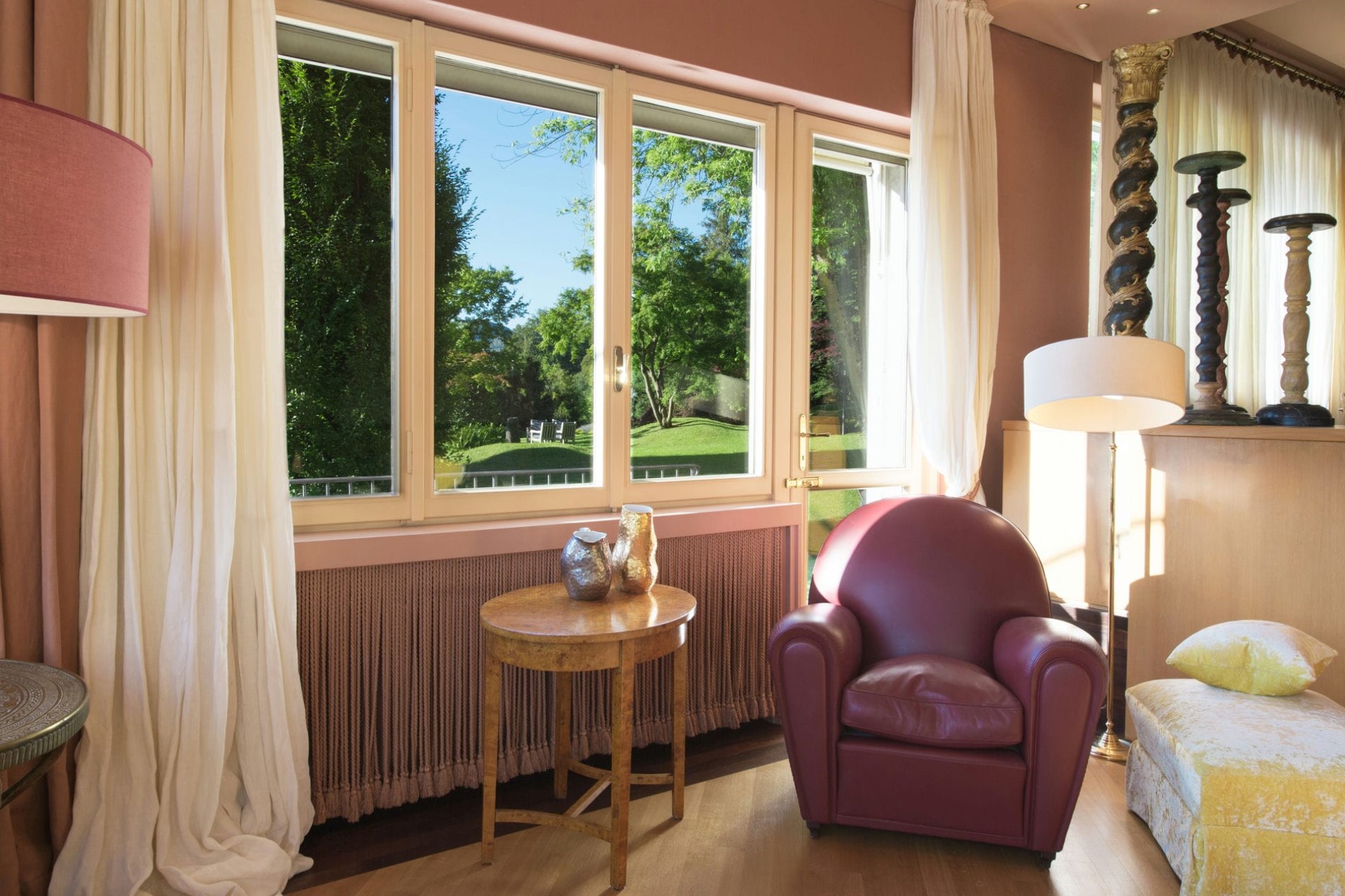 Perfectly blending the outdoors and in, the villa’s ground floor features a bright sunroom with panoramic windows. Overlooking the lush lawns and the lake beyond, it’s the ideal place to enjoy the surrounding nature in the cooler months.