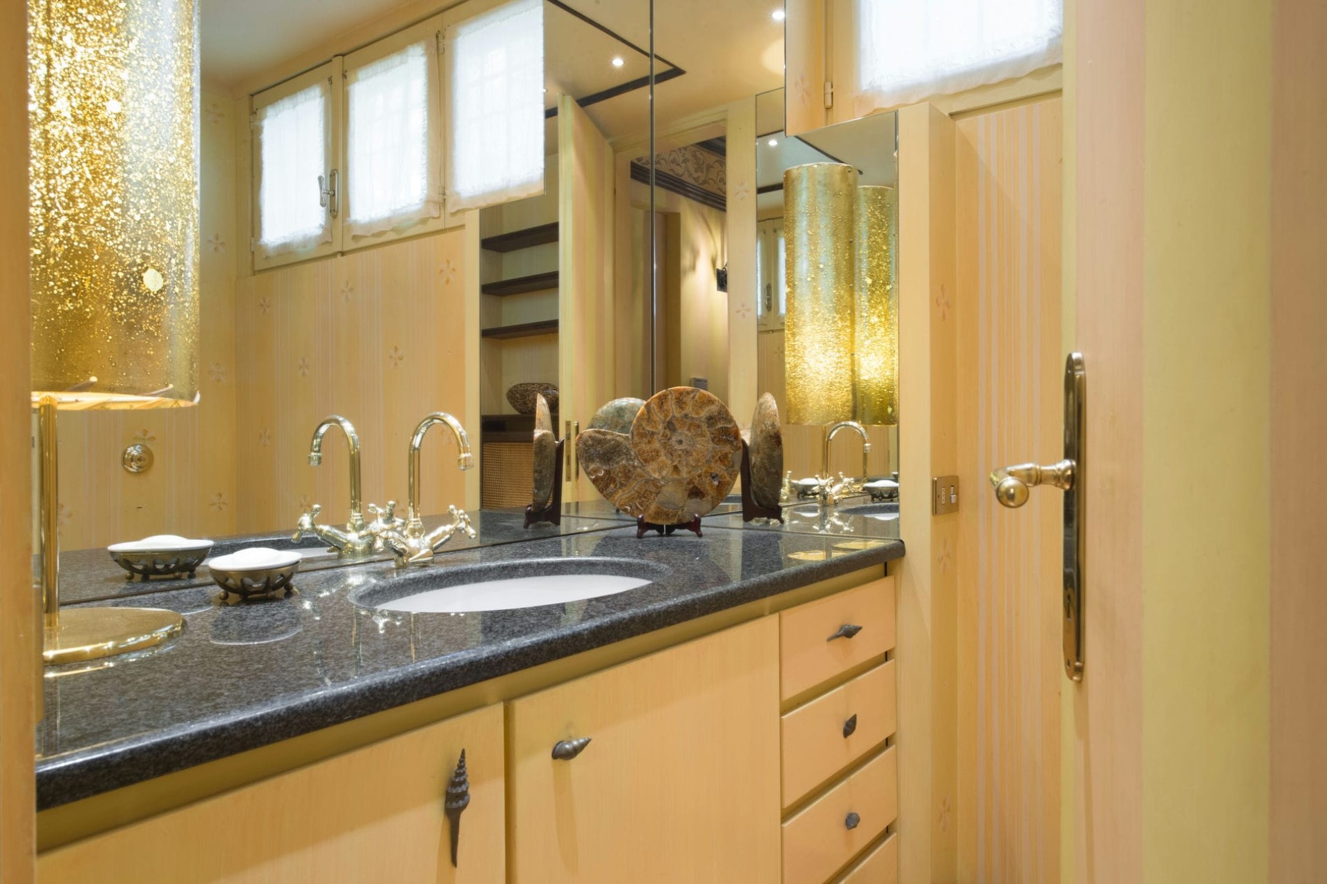 On the first floor is the main living room with beautiful wooden floors, plenty of plush seating, and more large windows making the most of the views. There are numerous custom-made furniture pieces, luxurious soft furnishings, and carefully curated artefacts throughout, creating a warm yet opulent home-from-home feel.