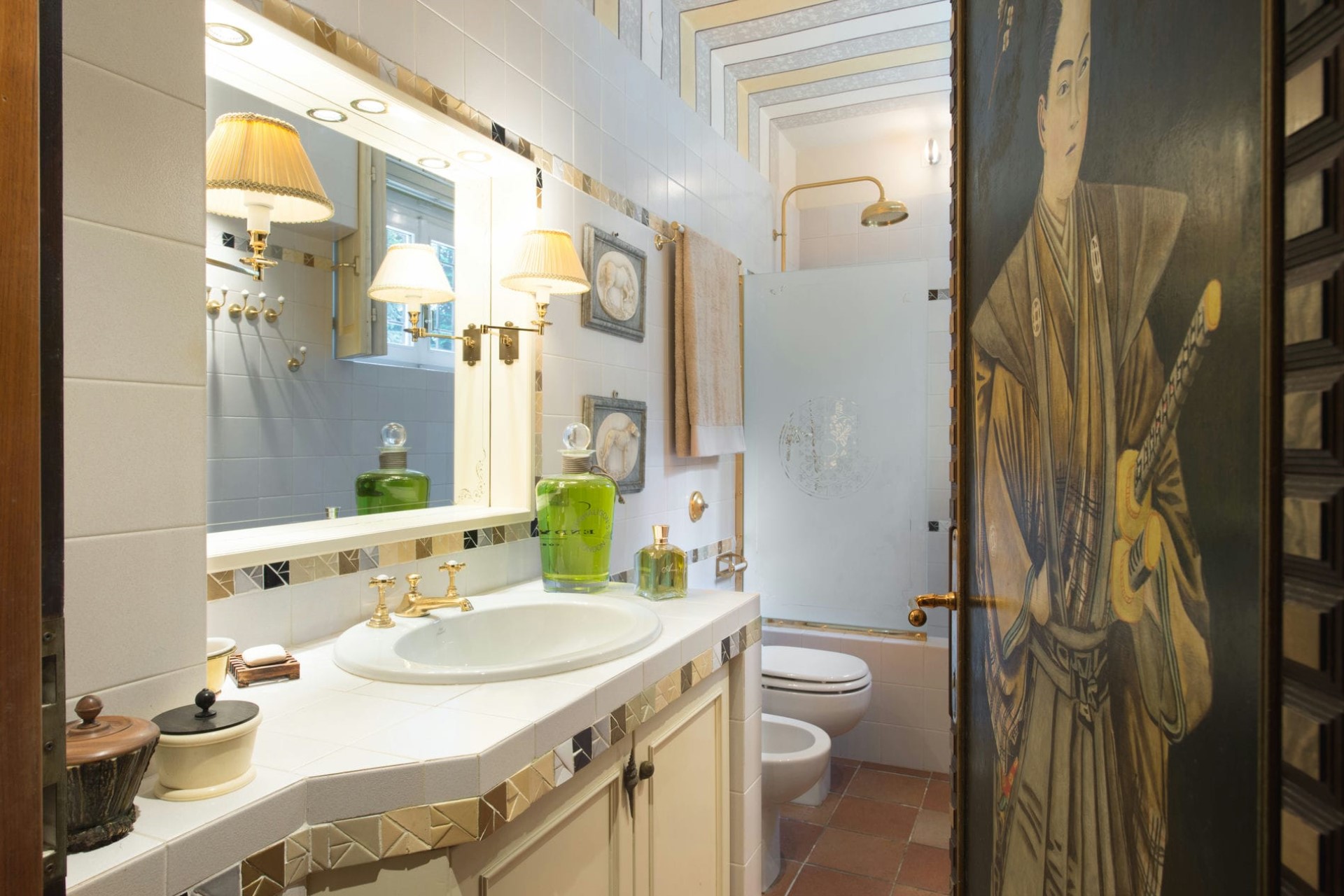 Bedroom 7 – king-size bed, shared bathroom with bathtub/shower, and private terrace with garden views