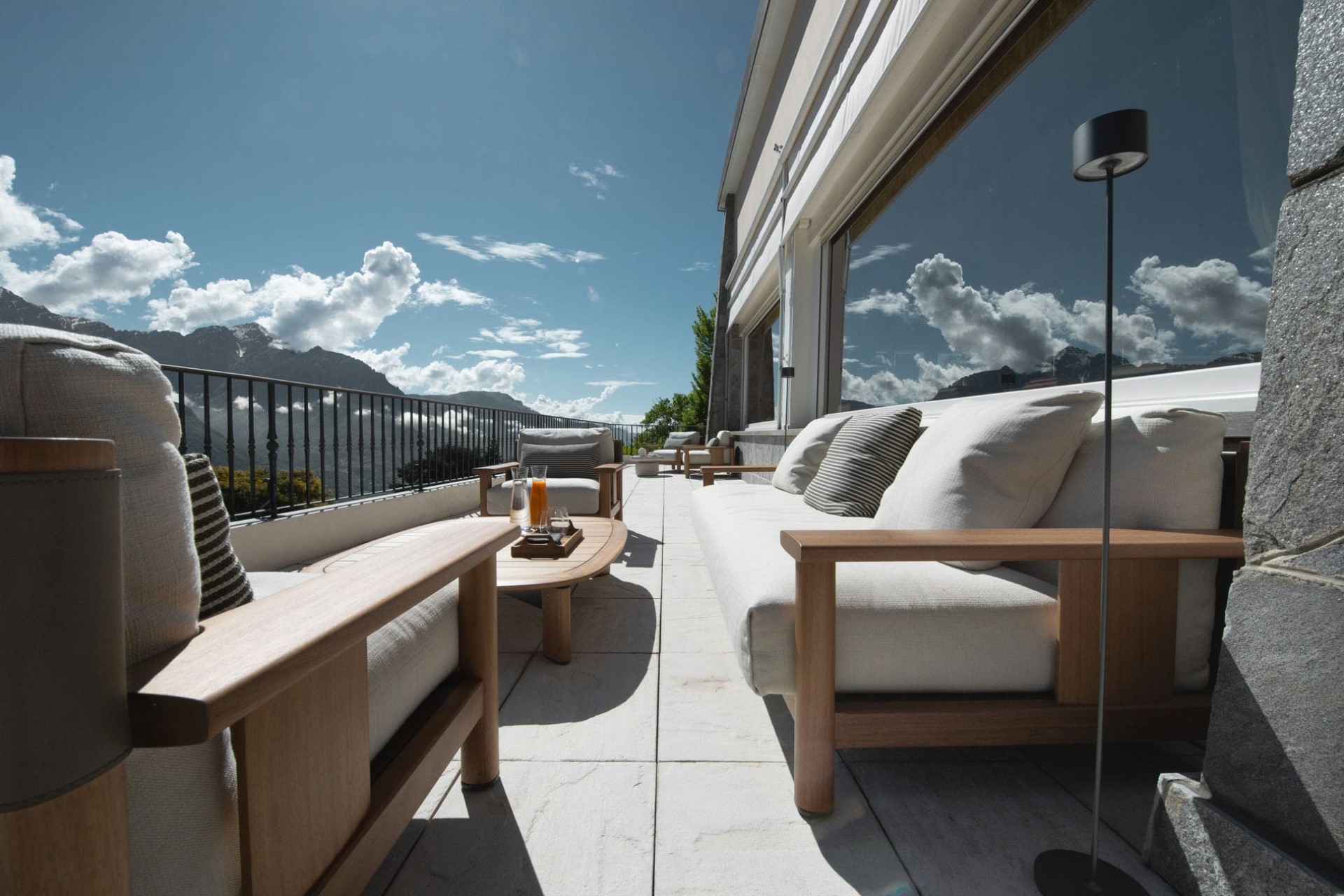 A sprawling 120-square-metre terrace spreads along one side of the villa, offering endless lake and mountain views. Guests can relax with their morning coffee in the outdoor lounge area, enjoy al fresco meals overlooking the lake, or take in spectacular sunsets with a glass of bubbly in hand.