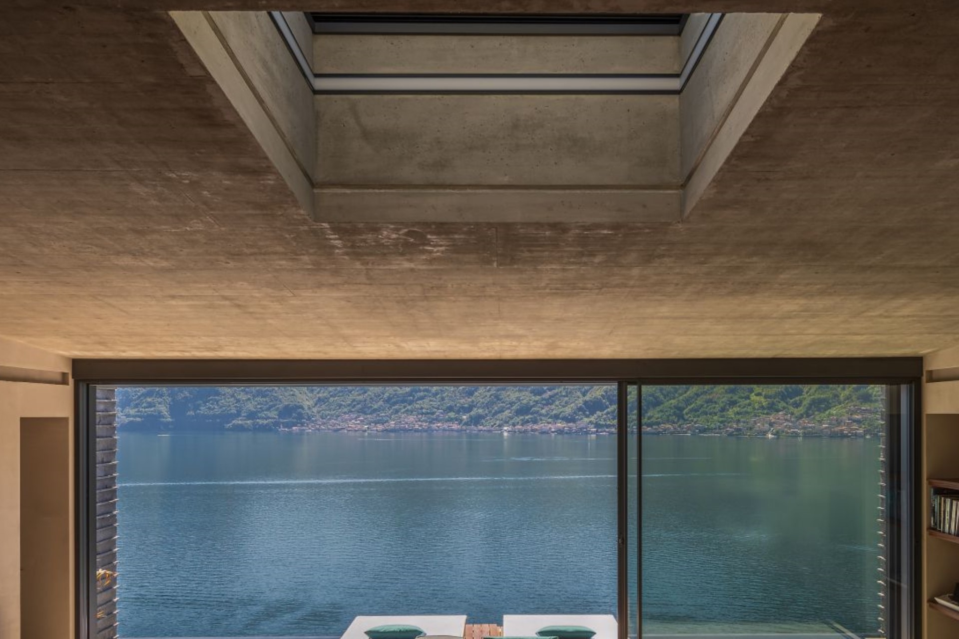 The main terrace leads indoors through floor-to-ceiling windows into the open-plan living and dining area looking out over the lake and the surrounding mountains. The lounge area features a modern fireplace, large flat screen TV and comfortable sofas ideal for enjoying a film or simply admiring the expansive views.