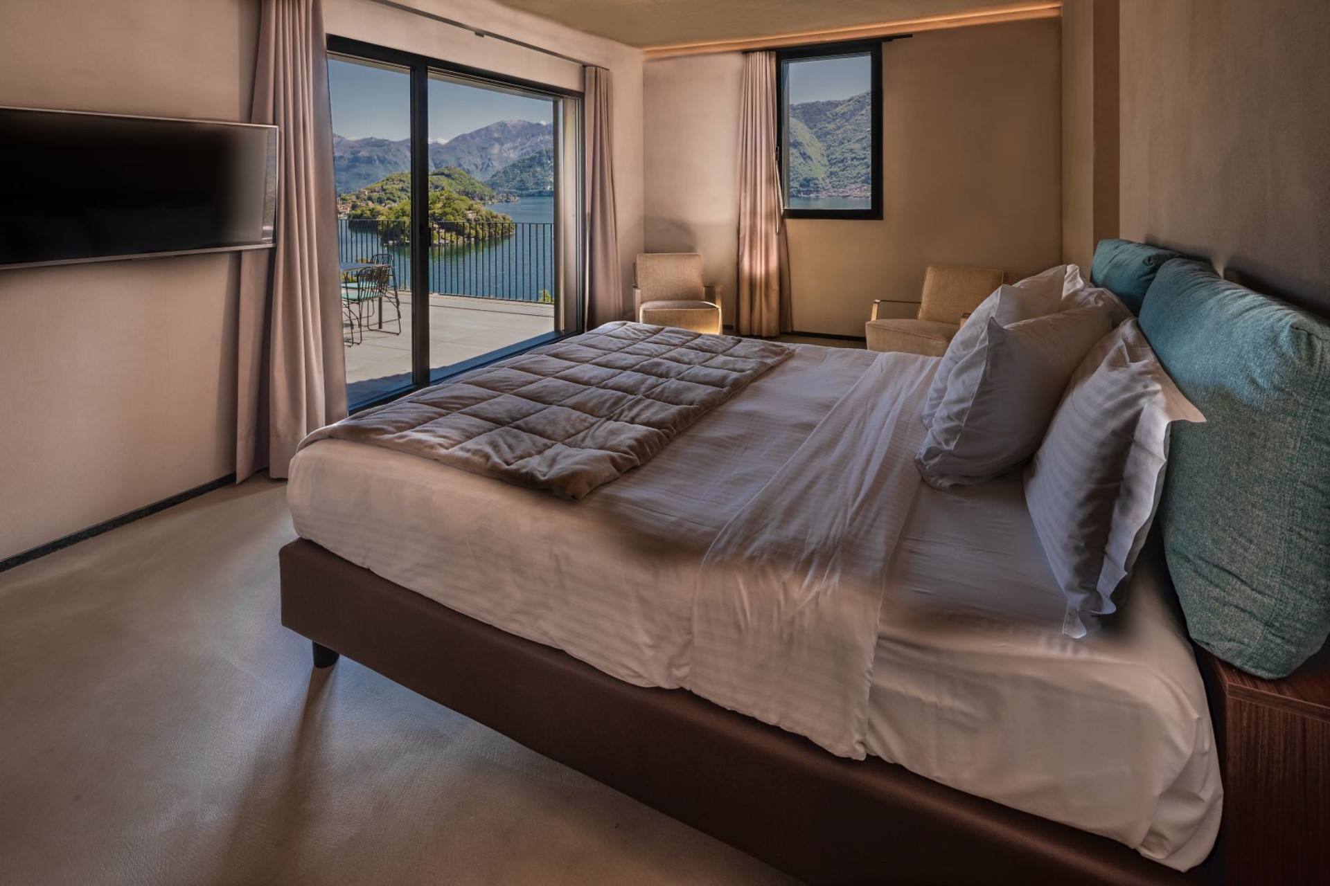 Bedroom 4 (Master) – king-size bed (converted to twins on request), in-room shower + en-suite WC, and terrace access with lake views