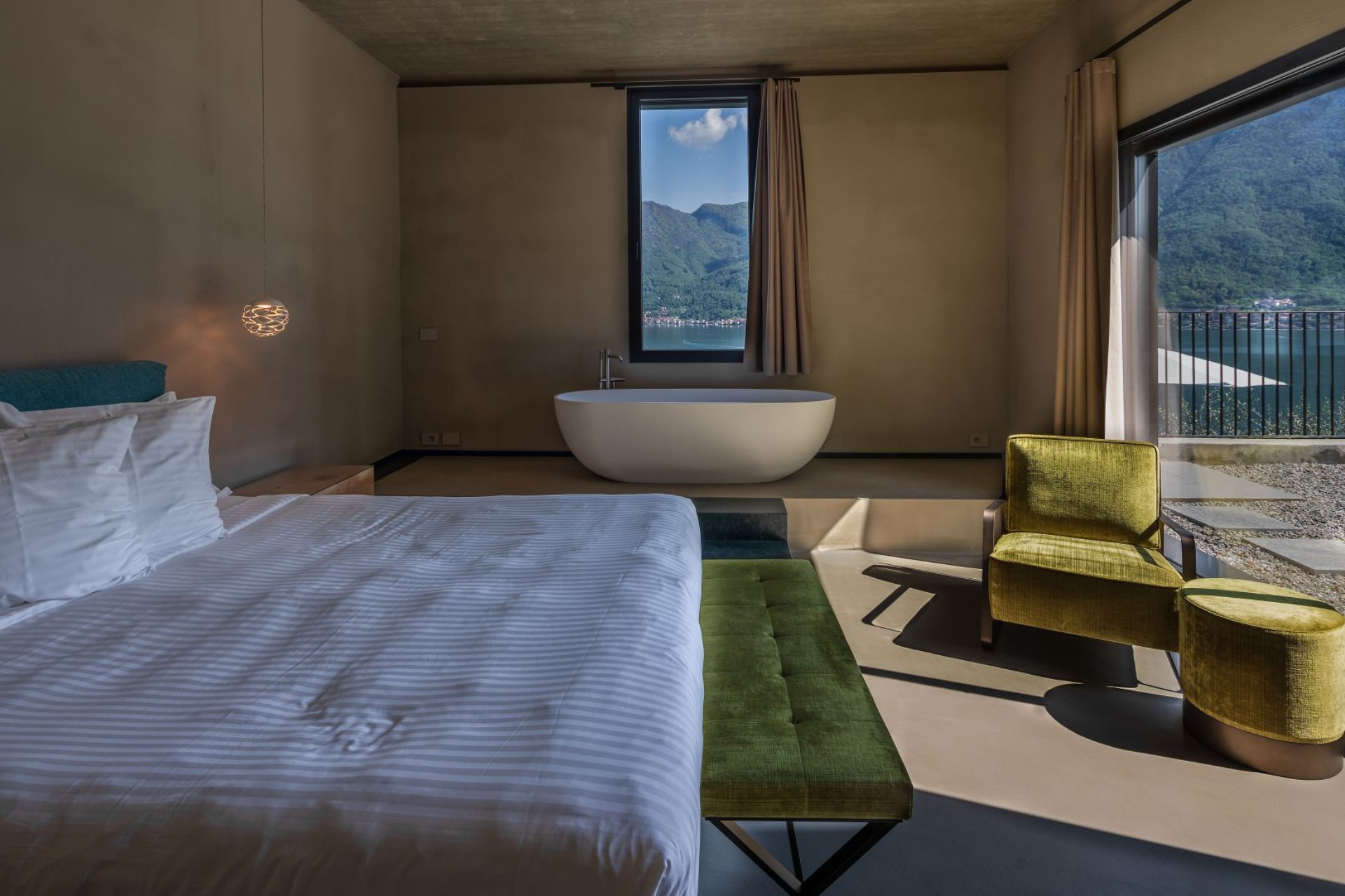 Bedroom 2 (Master) – king-size bed (converted to twins on request), in-room bathtub + en-suite WC, and private terrace with lake views