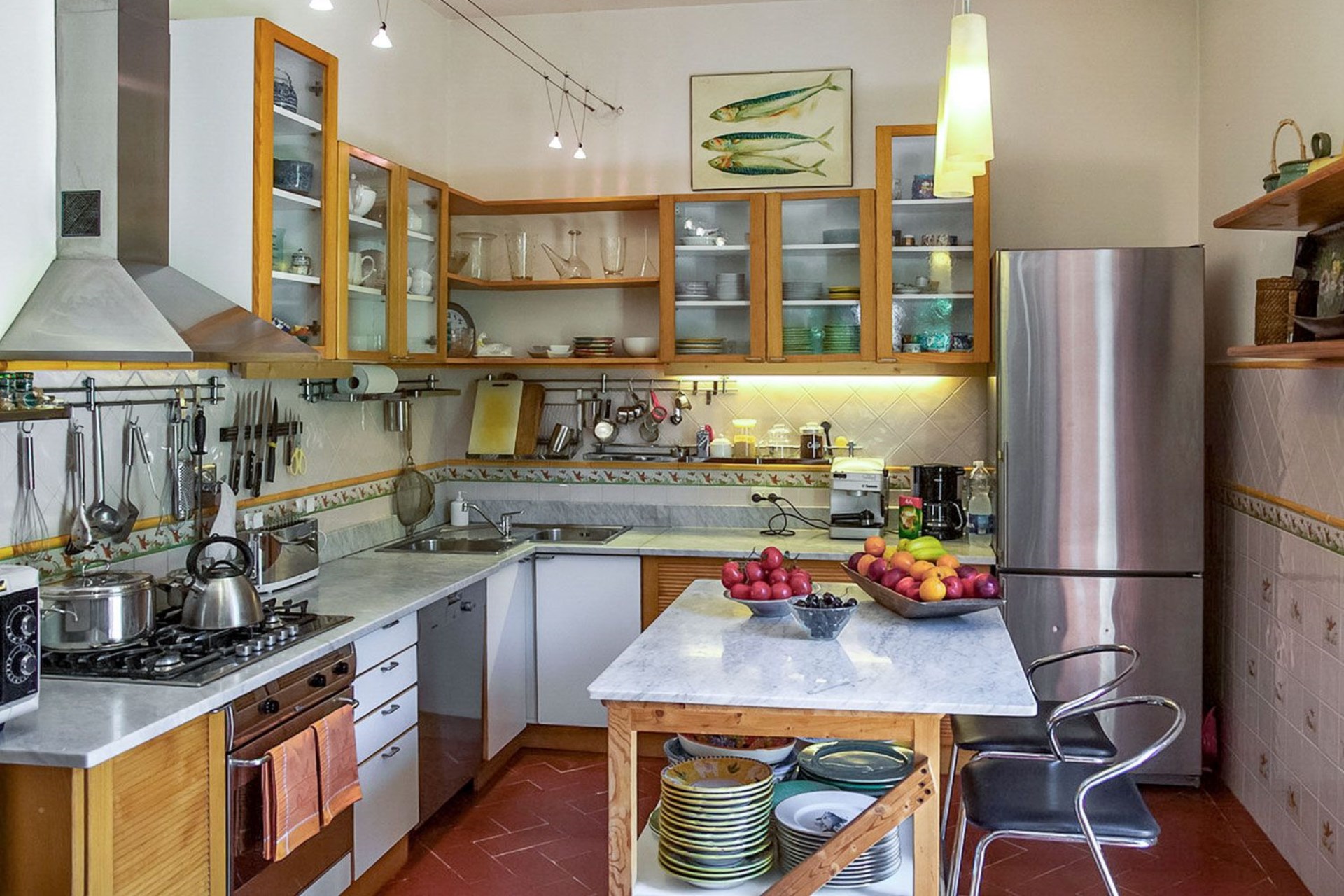 The living room features a traditional fireplace along with the terracotta floors offer an atmosphere of rustic charm, nicely contrasting the neutral colour palette of the rugs and upholstery. The dining room features a large wooden table with garden views, and the fully-equipped kitchen boasts a dishwasher, table top grill and cheery tile backsplash, as well as two bar stools at the marble counter for informal eating.