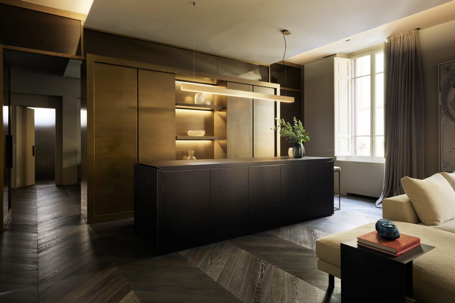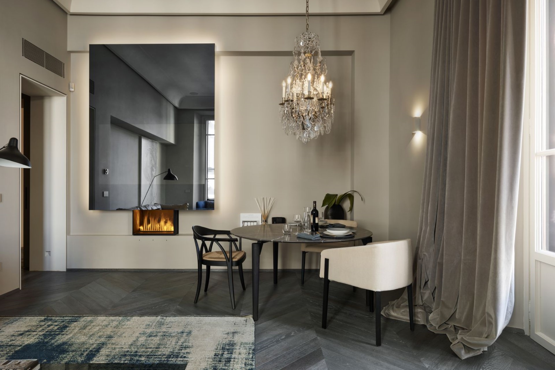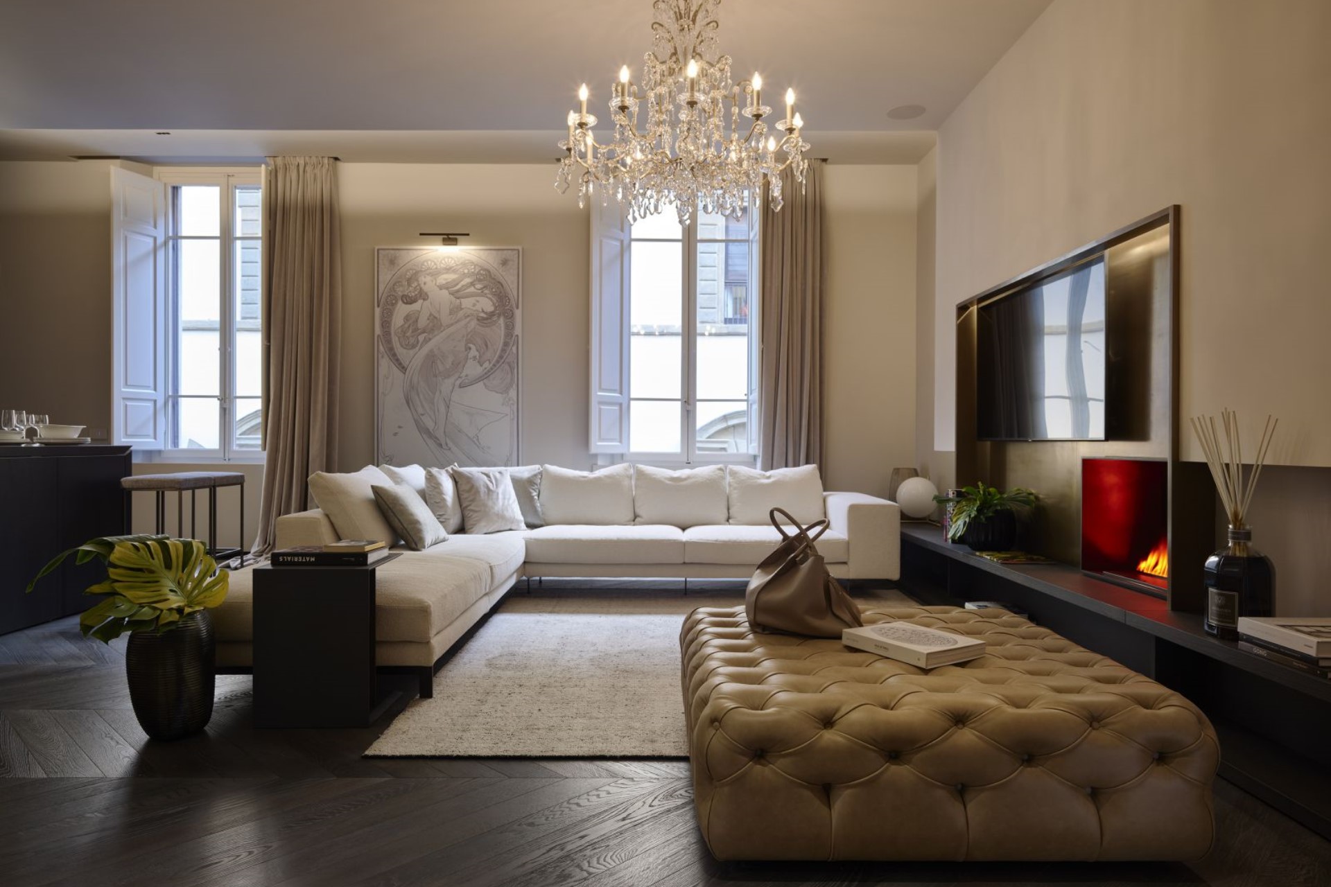 Throughout the residence, the high ceilings, parquet flooring, neutral-toned walls, warm lighting, and subtle fragrances create a warm and inviting, yet elegant atmosphere. Moreover, modern design features and contemporary furnishings combined with atmospheric crystal chandeliers and Nouveau-inspired décor, perfectly blend the old with the new.