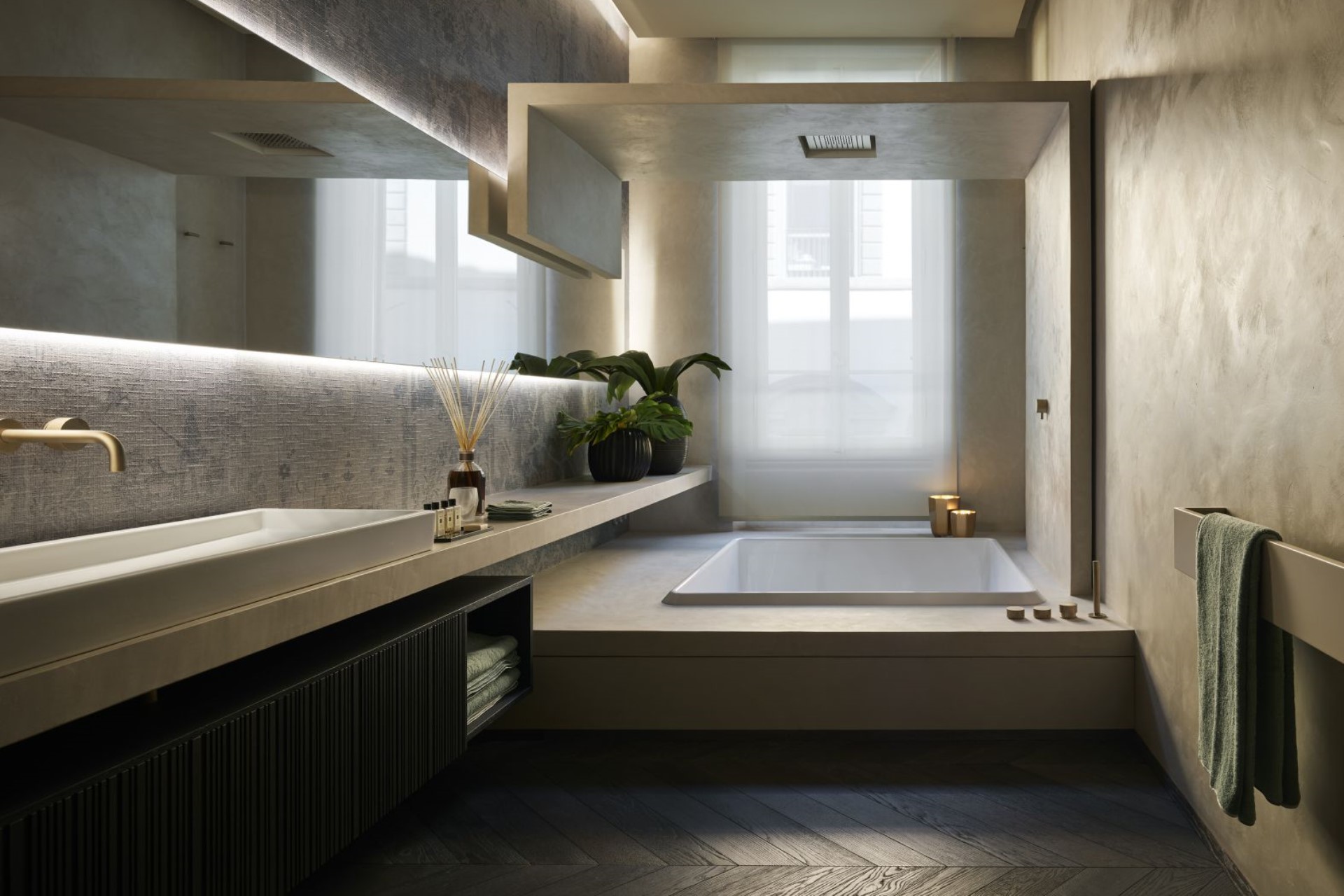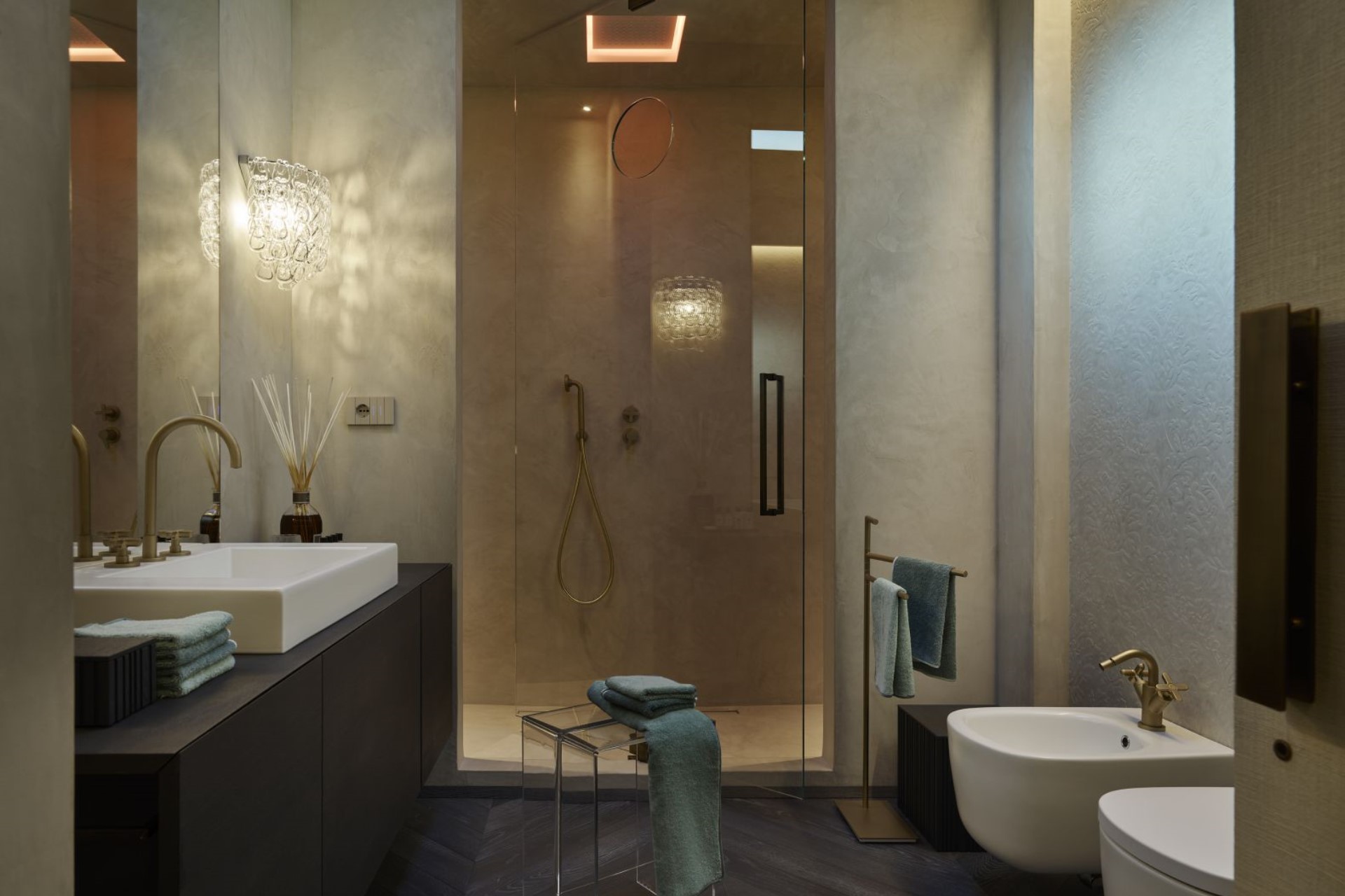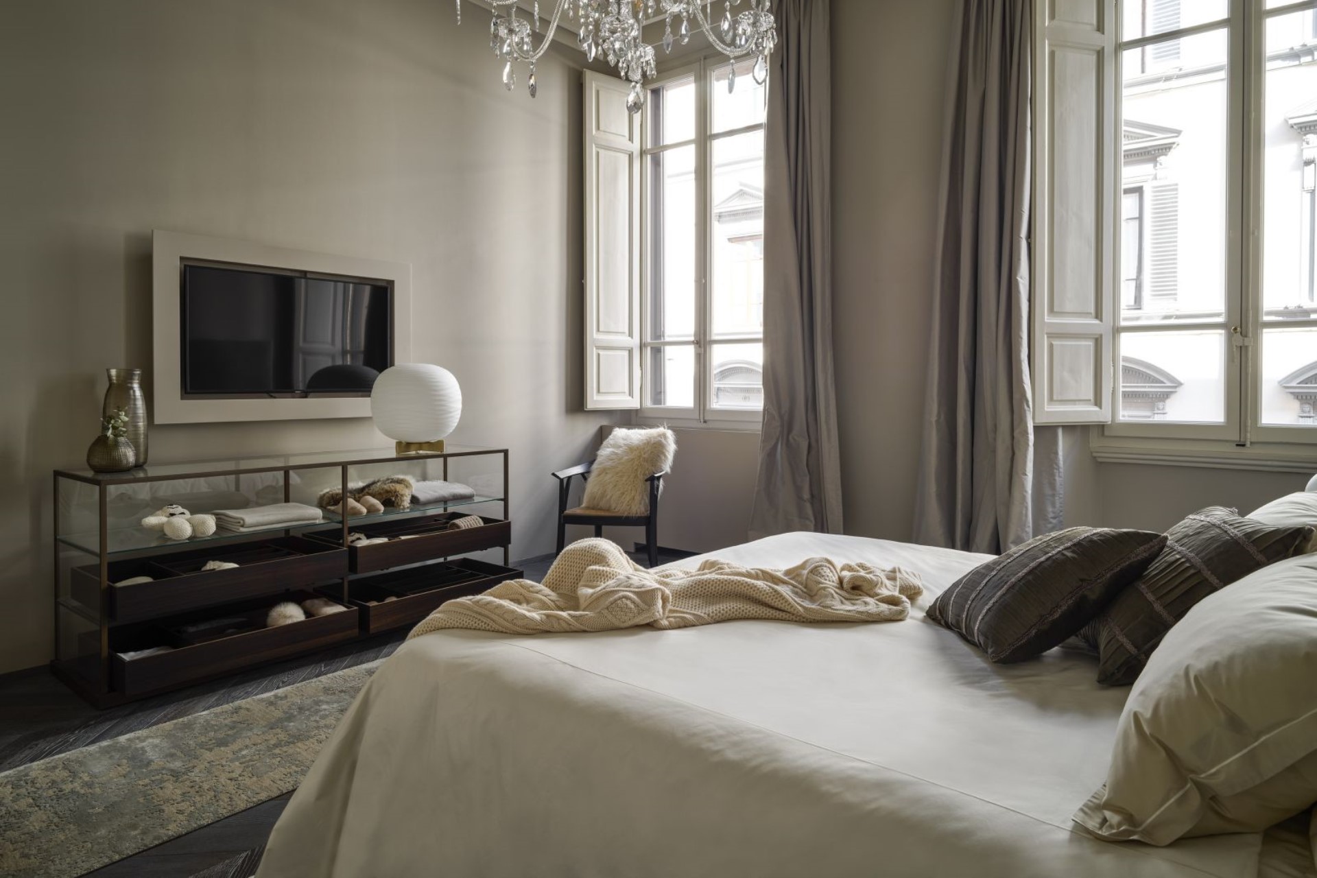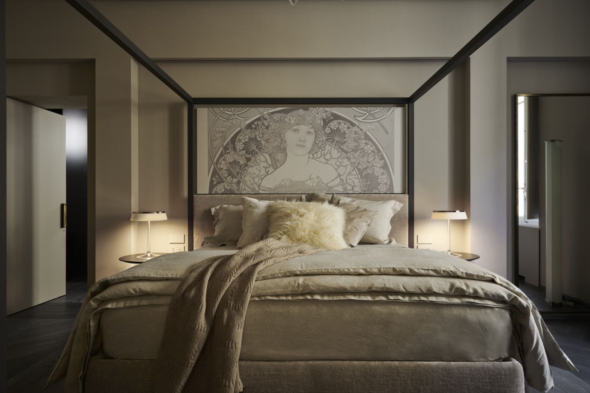 Throughout the residence, the high ceilings, parquet flooring, neutral-toned walls, warm lighting, and subtle fragrances create a warm and inviting, yet elegant atmosphere. Moreover, modern design features and contemporary furnishings combined with atmospheric crystal chandeliers and Nouveau-inspired décor, perfectly blend the old with the new.