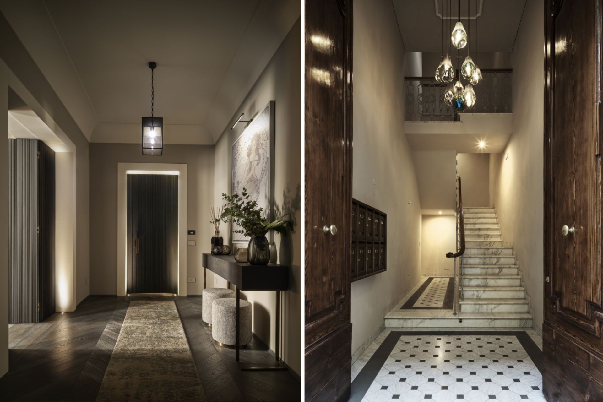 A grand entranceway leads up to the first-floor apartment via the stunning marble staircase or the lift. Guests are then welcomed into the elegant hallway of the contemporary apartment.