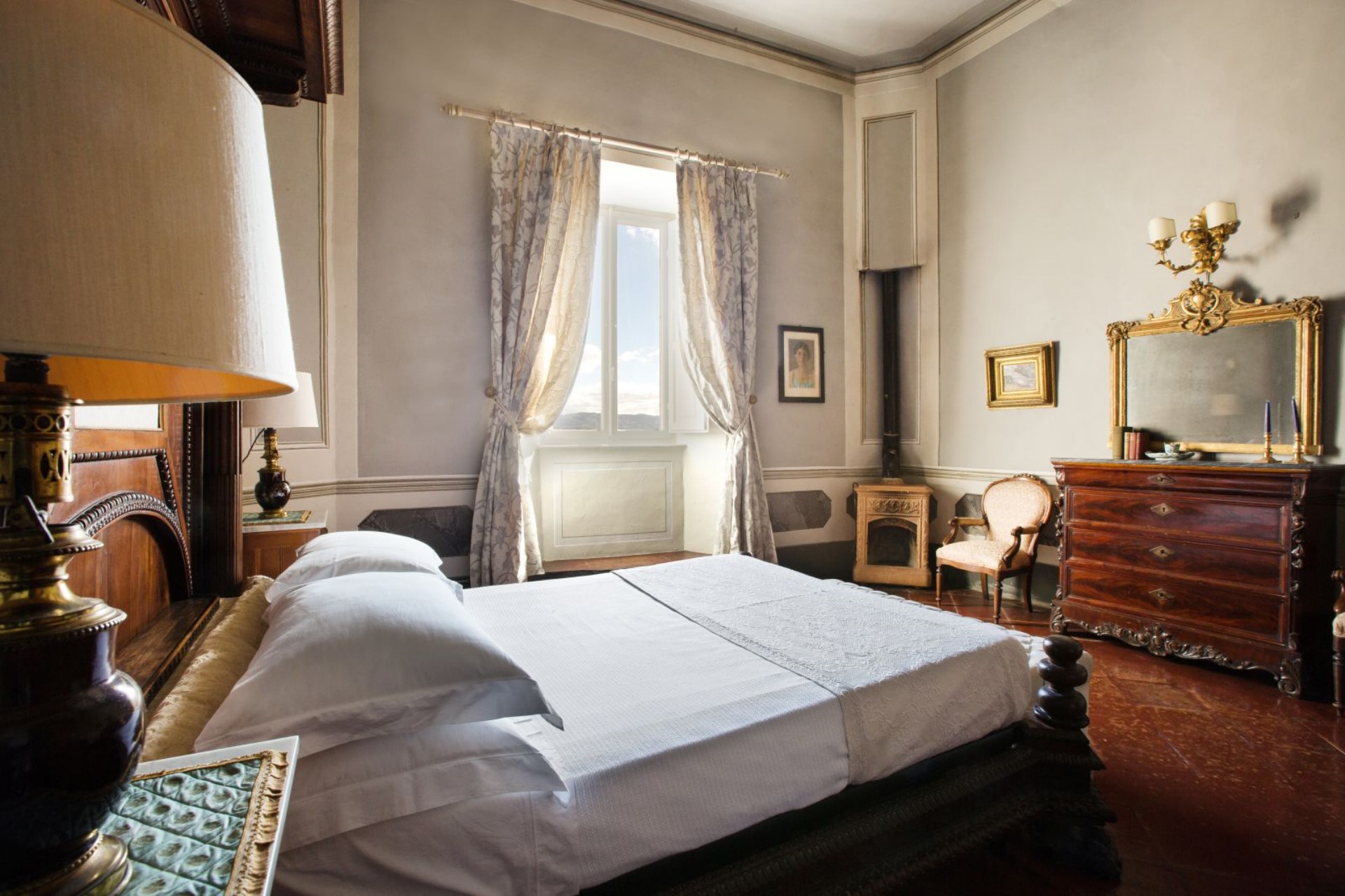 Upon entering the castle, guests are welcomed into an entrance hall with a stone fireplace, beamed ceilings and a reception throne that dates back to the 1500s. There are several lounge and living rooms with frescoed ceilings and comfortable seating, along with a dining room with antique fireplace and a large table that can accommodate up to 16 guests. Delicious feasts can be cooked up in the fully-equipped, country-style kitchen.