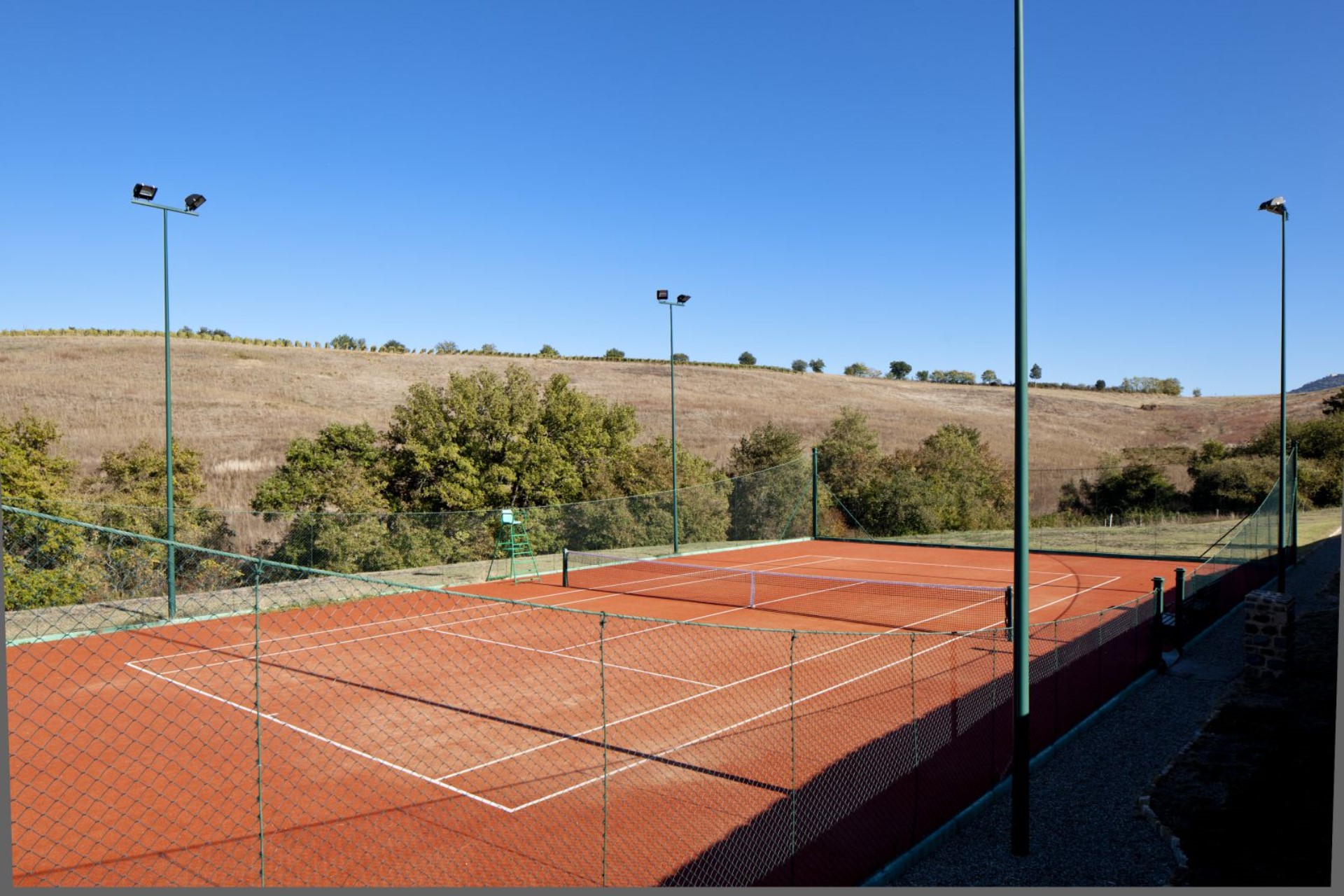 Villa del Fiume is one of 11 villas in the 5000-acre Rosewood Castiglion del Bosco estate. The estate offers two restaurants, a cooking school, a fitness and spa complex, tennis courts, a private golf course, and a chapel, all surrounded by 70 hectares of vineyards.