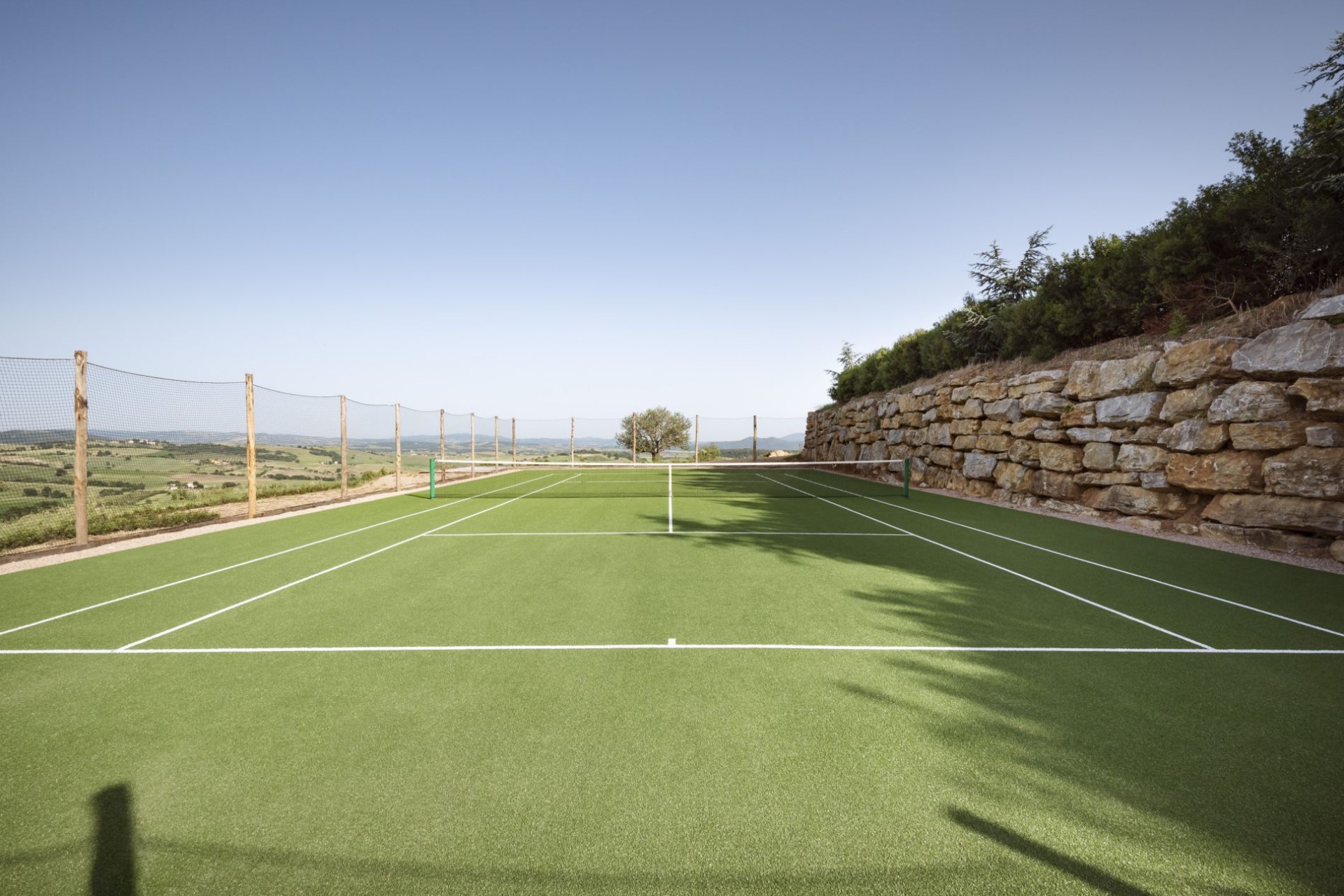 A 30-metre saltwater infinity pool extends out over lush green lawns and features a pool terrace flanked with sun loungers and deck chairs, ideal for soaking up the Tuscan sunshine. There’s also a tennis court, a motocross track and a children’s playground to keep all ages entertained.