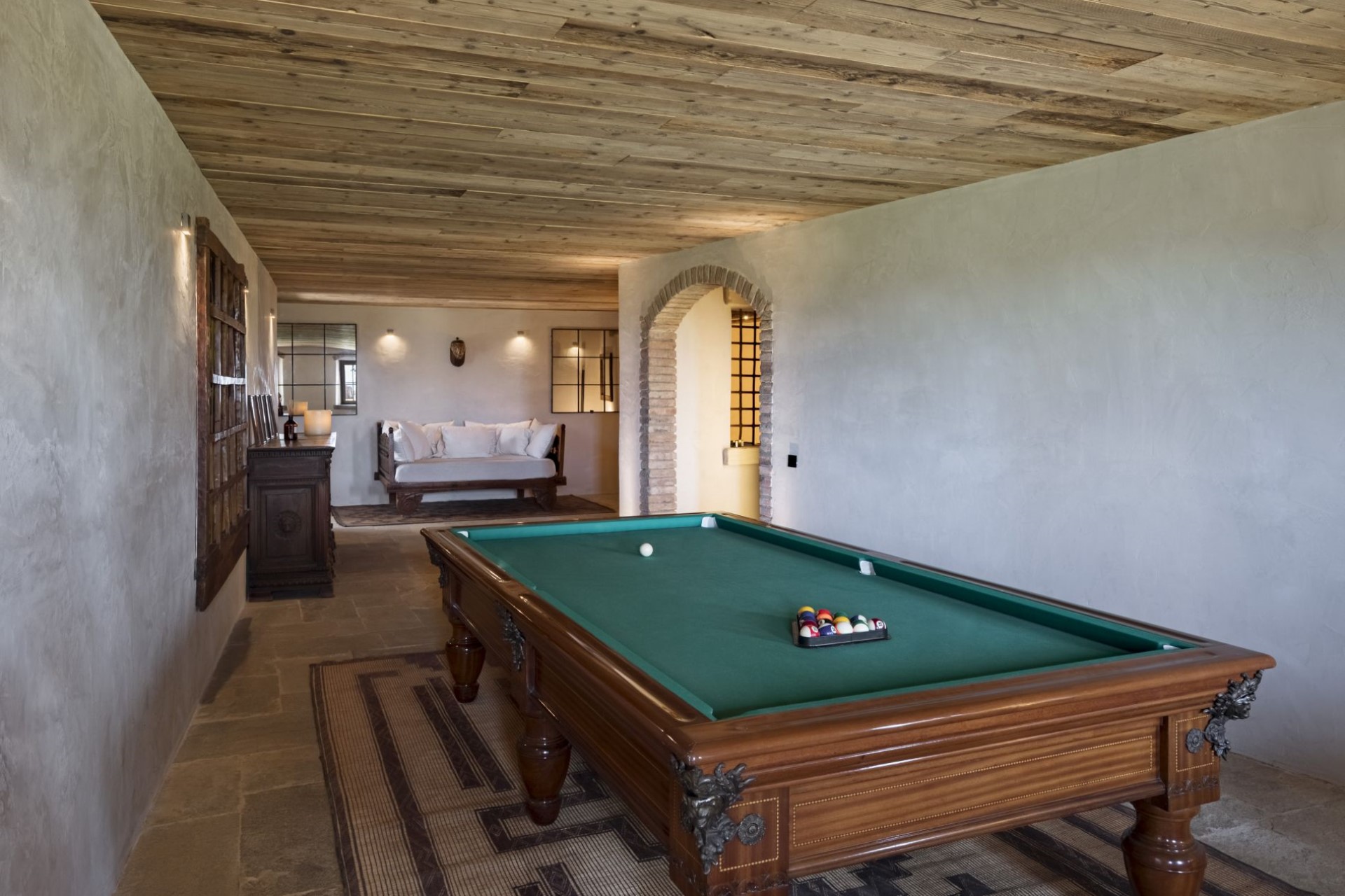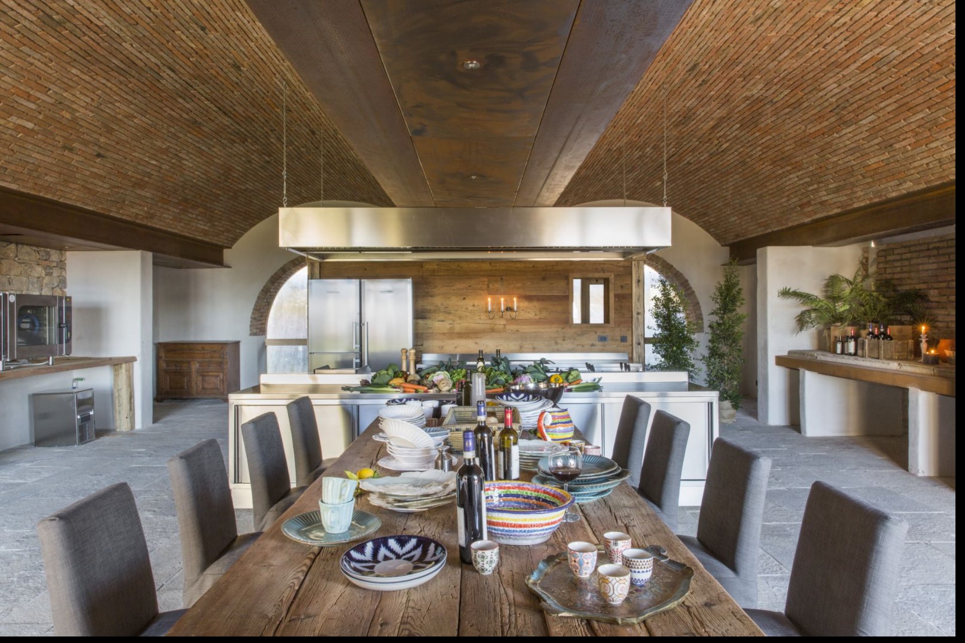 The open-plan professional kitchen features a spacious dining table for daily meals, whilst the 60-person dining room is ideal for larger gatherings and events. Wines and olive oil are produced on site and stored in the estate’s private cellar, ready to be enjoyed by guests.