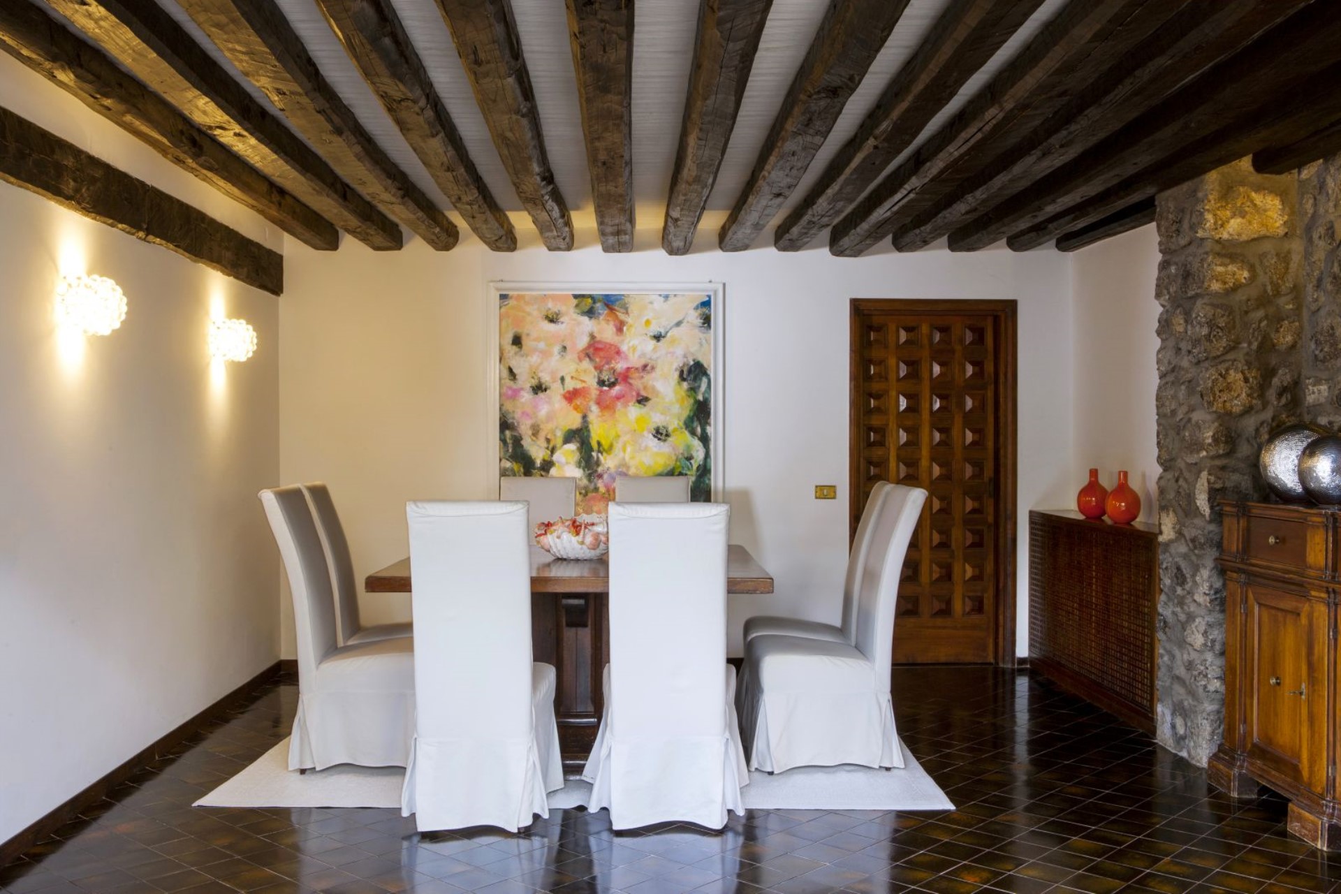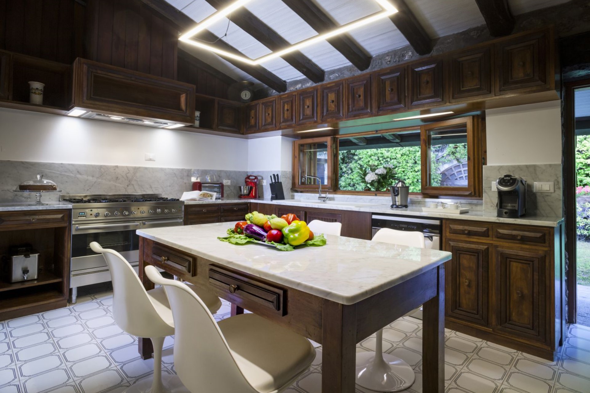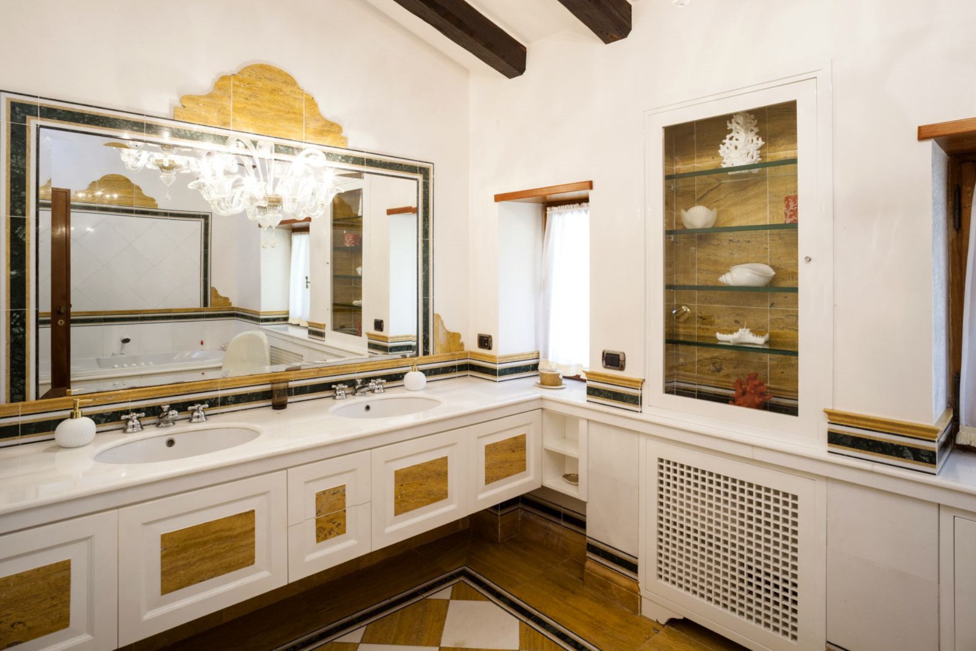 On the ground floor, the large living area, accessed through French windows, is divided into different areas: a lounge area furnished in perfect Italian style, a TV area with comfortable sofas, and a cosy parlour for card games.