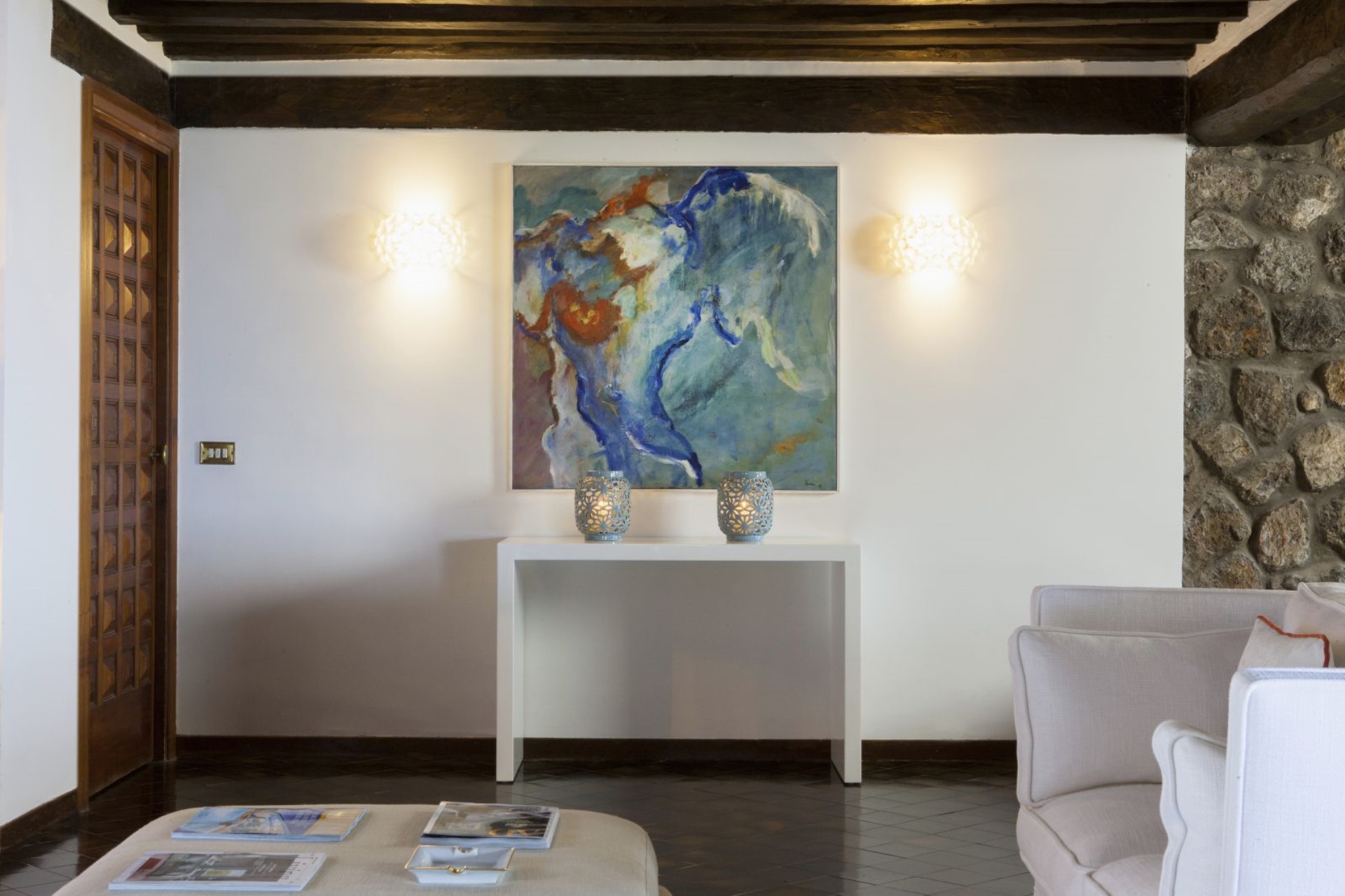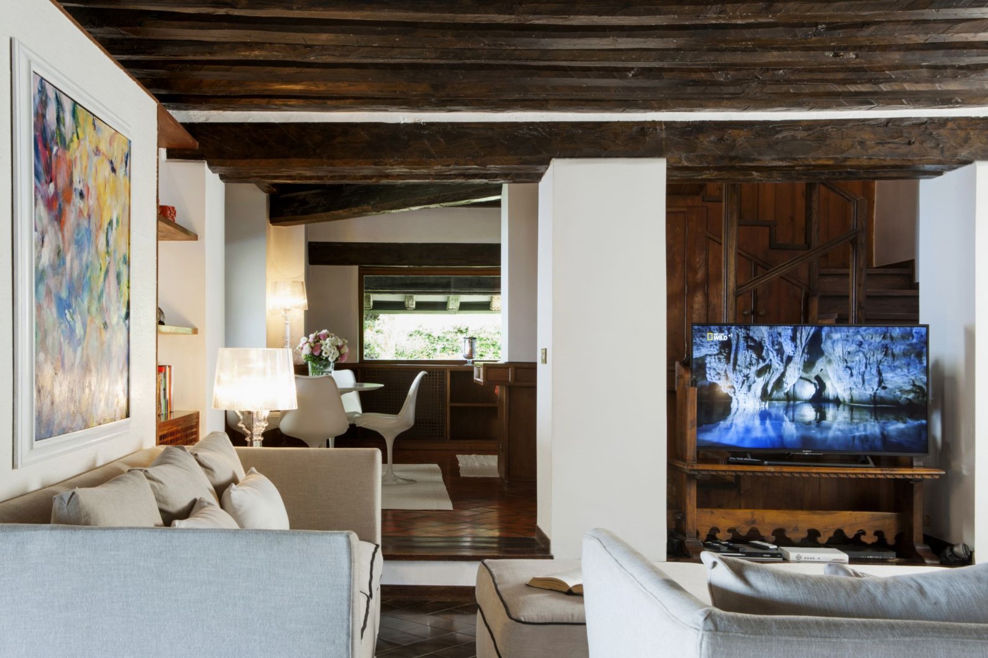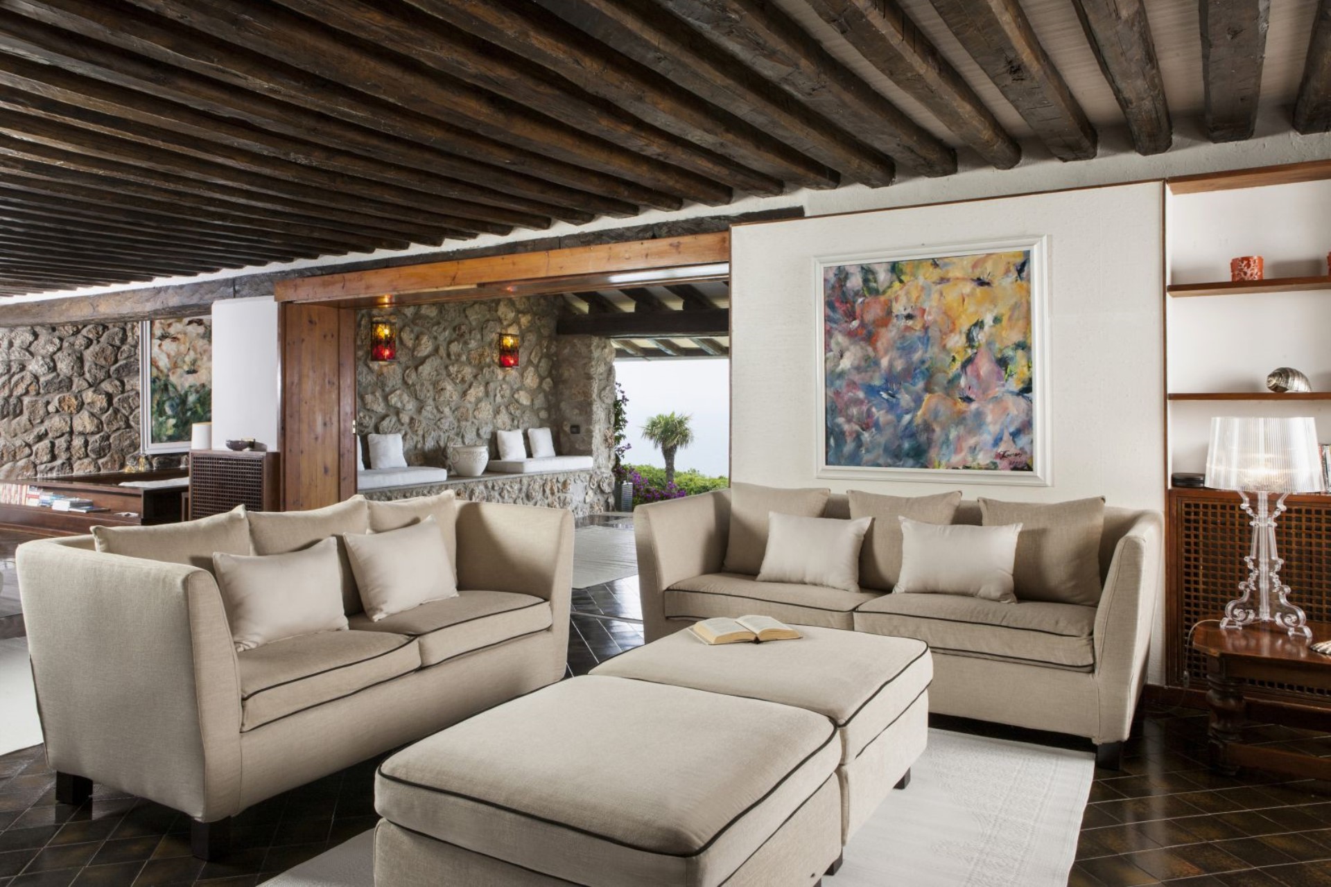 On the ground floor, the large living area, accessed through French windows, is divided into different areas: a lounge area furnished in perfect Italian style, a TV area with comfortable sofas, and a cosy parlour for card games.