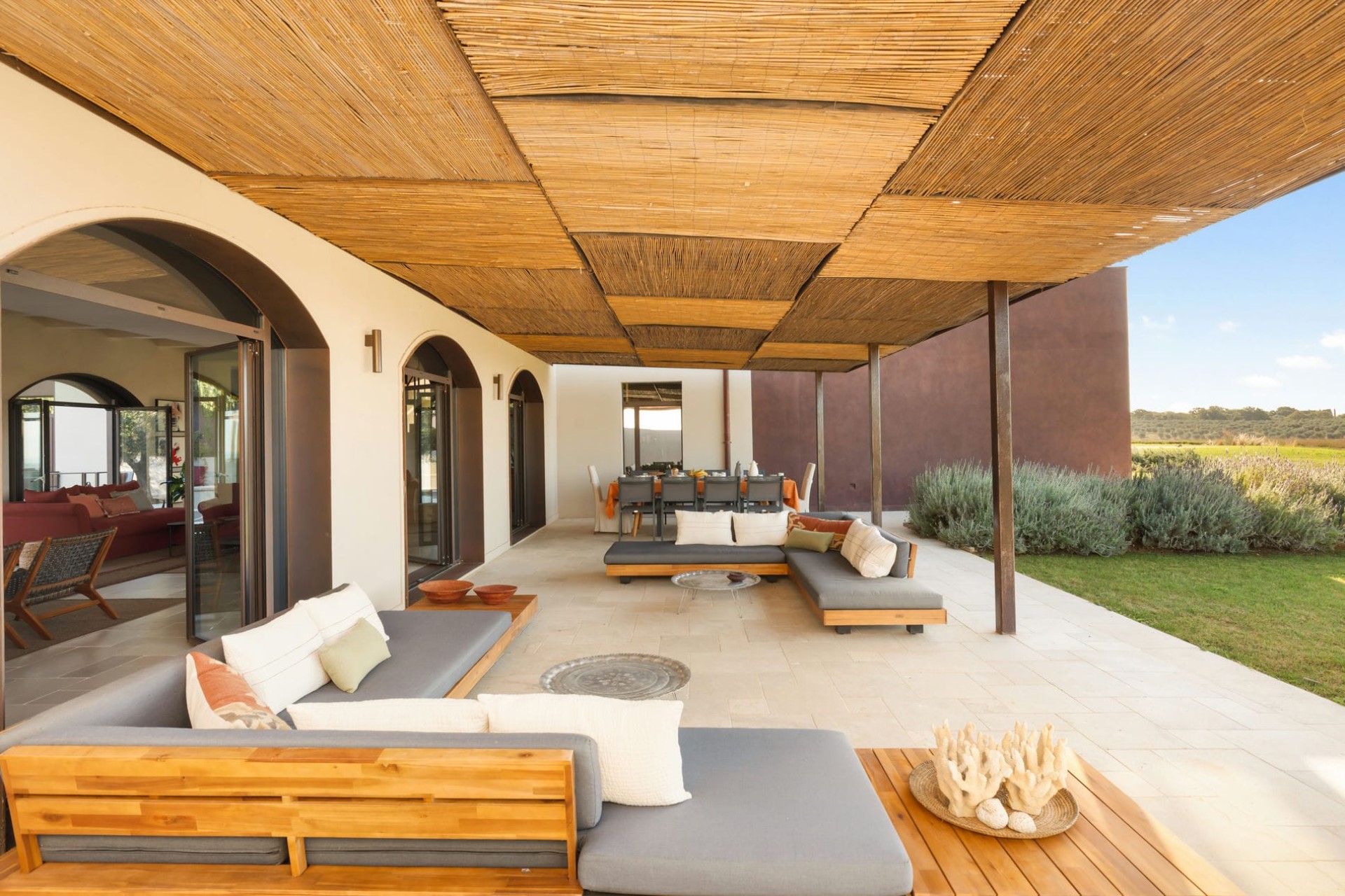 The sprawling grounds of this farm offer plenty of outdoor spaces to relax in nature. Surrounded by lush lawns, the swimming pool is the perfect place to enjoy the sunshine. Sun loungers line the pool, while a pergola shades an outdoor living area with plush lounge seating, a bar, and an al fresco dining table perfect for relaxed barbecues and poolside drinks.