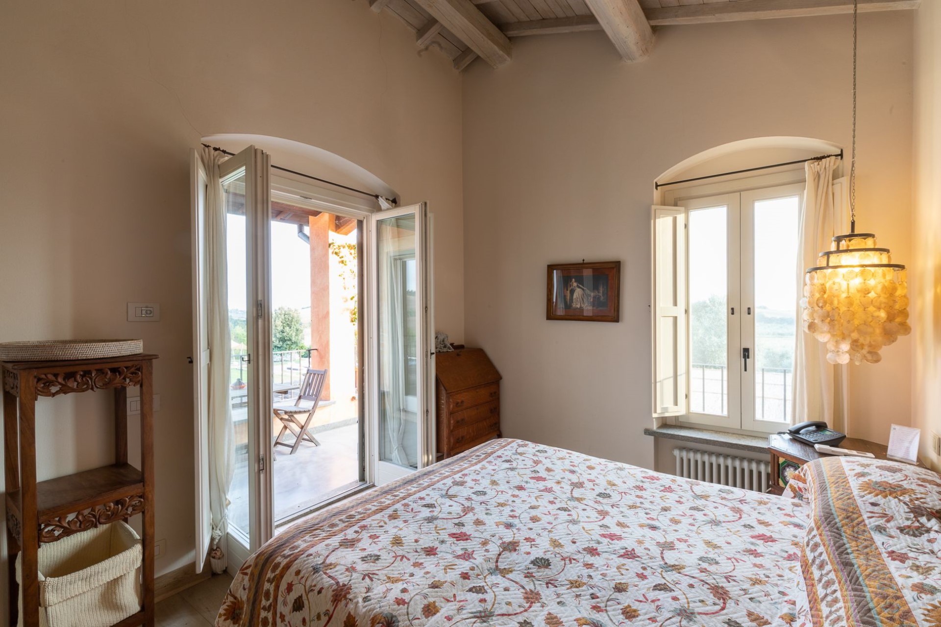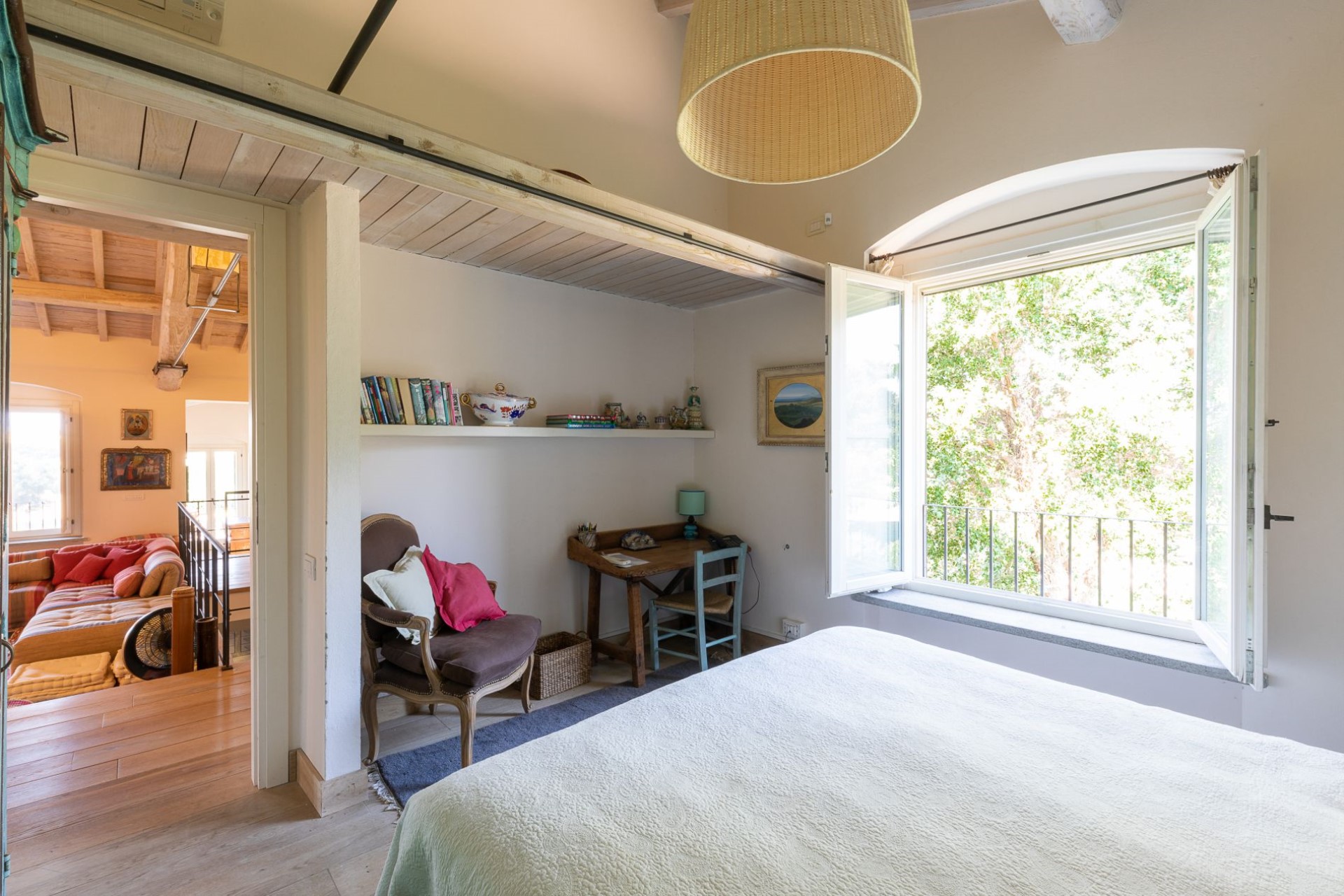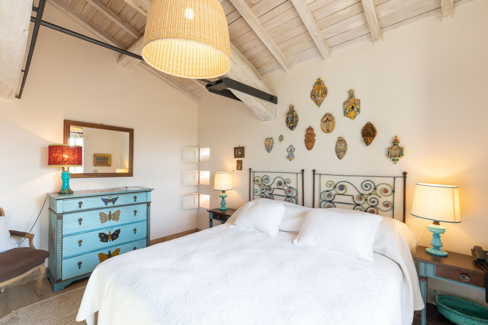 Each of the five double bedrooms is stylishly decorated and offers panoramic views. The three rooms on the upper floor all feature high oak ceilings, with one also boasting a private, furnished balcony. The two bedrooms on the ground floor both have verandas and direct access to the gardens.