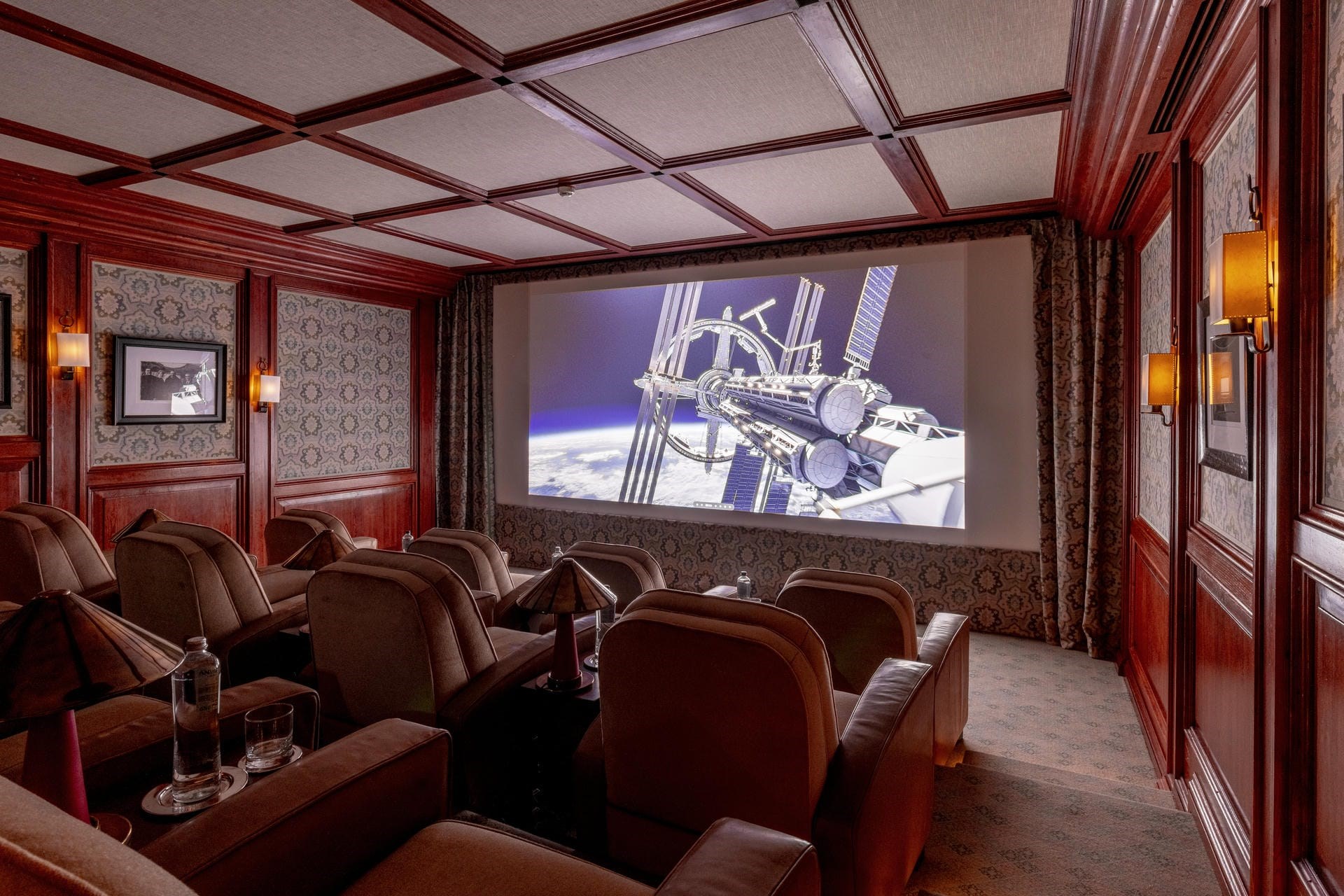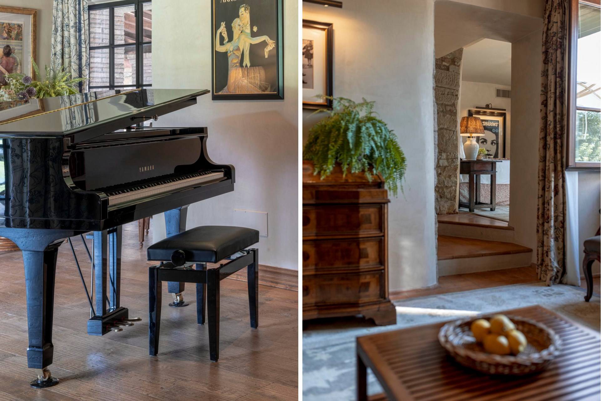 The villa is set over three floors and offers multiple living areas including a main sitting room with fireplace, a piano room with grand piano, a games room with billiards, shuffleboard, and card tables, a cinema room with film library and PlayStation, and a cosy reading room. Guests can enjoy wine tasting in the cellar, and relax in the spa which includes a sauna, hammam, and massage treatment room.