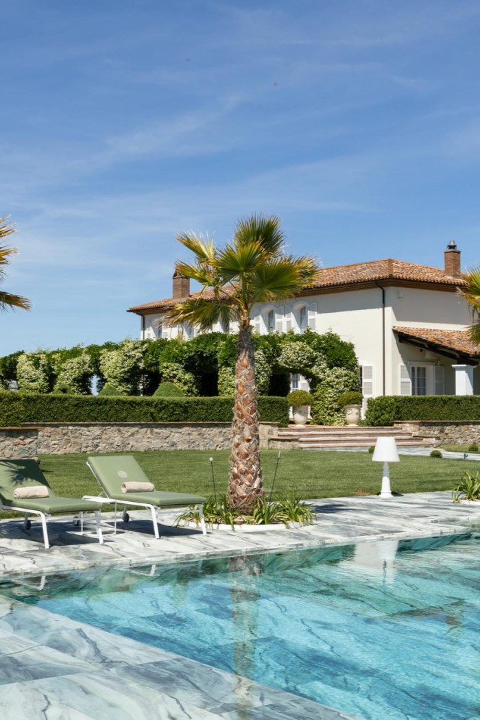 In the main villa, guests can relax in a spacious, open-plan living area. Plush sofas surround a crackling fireplace, an elegant 10-seater dining table is perfect for social meals, and large windows allow for views of the gardens and beyond on all sides. There is also a modern, fully-equipped kitchen for preparing tasty Italian feasts.