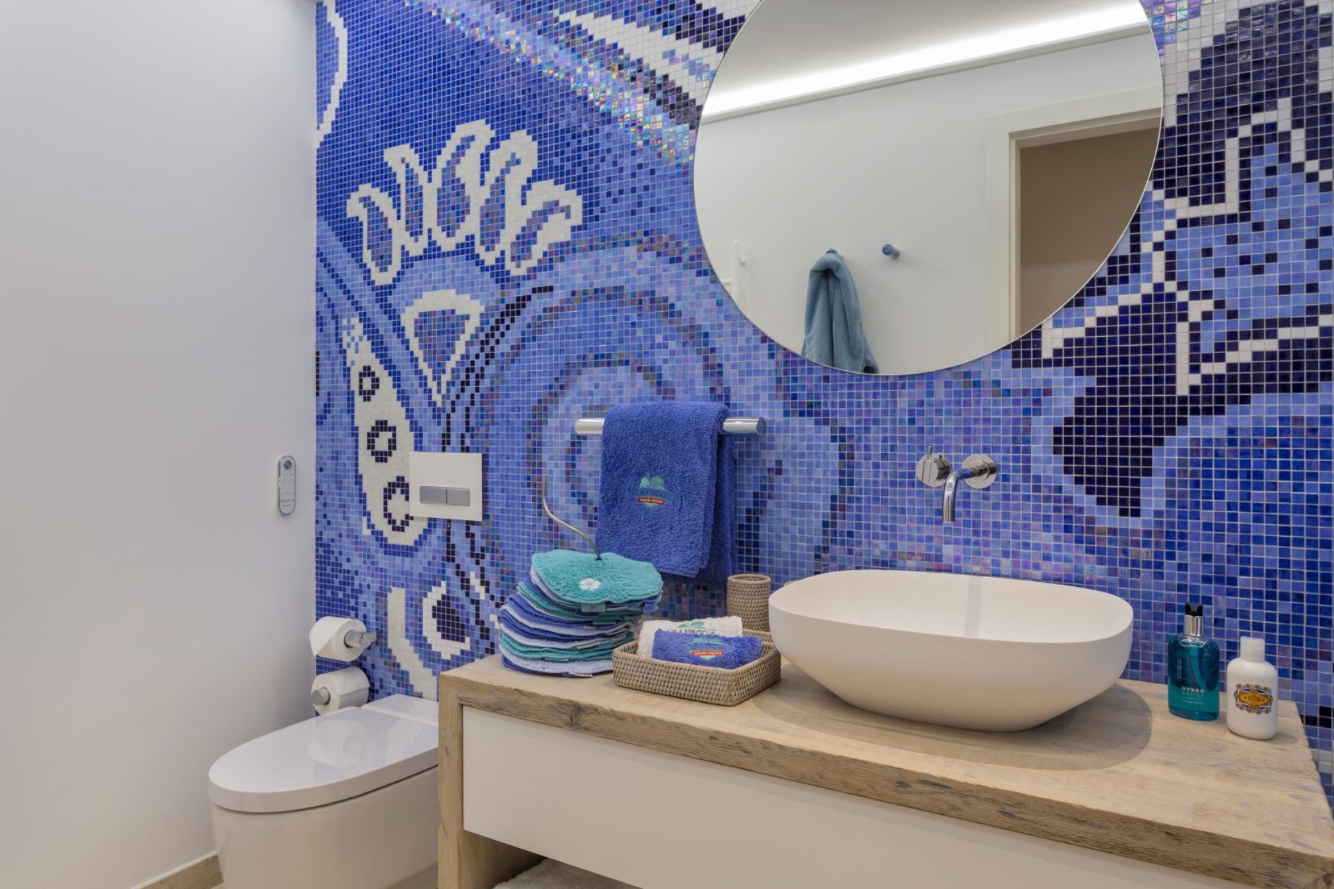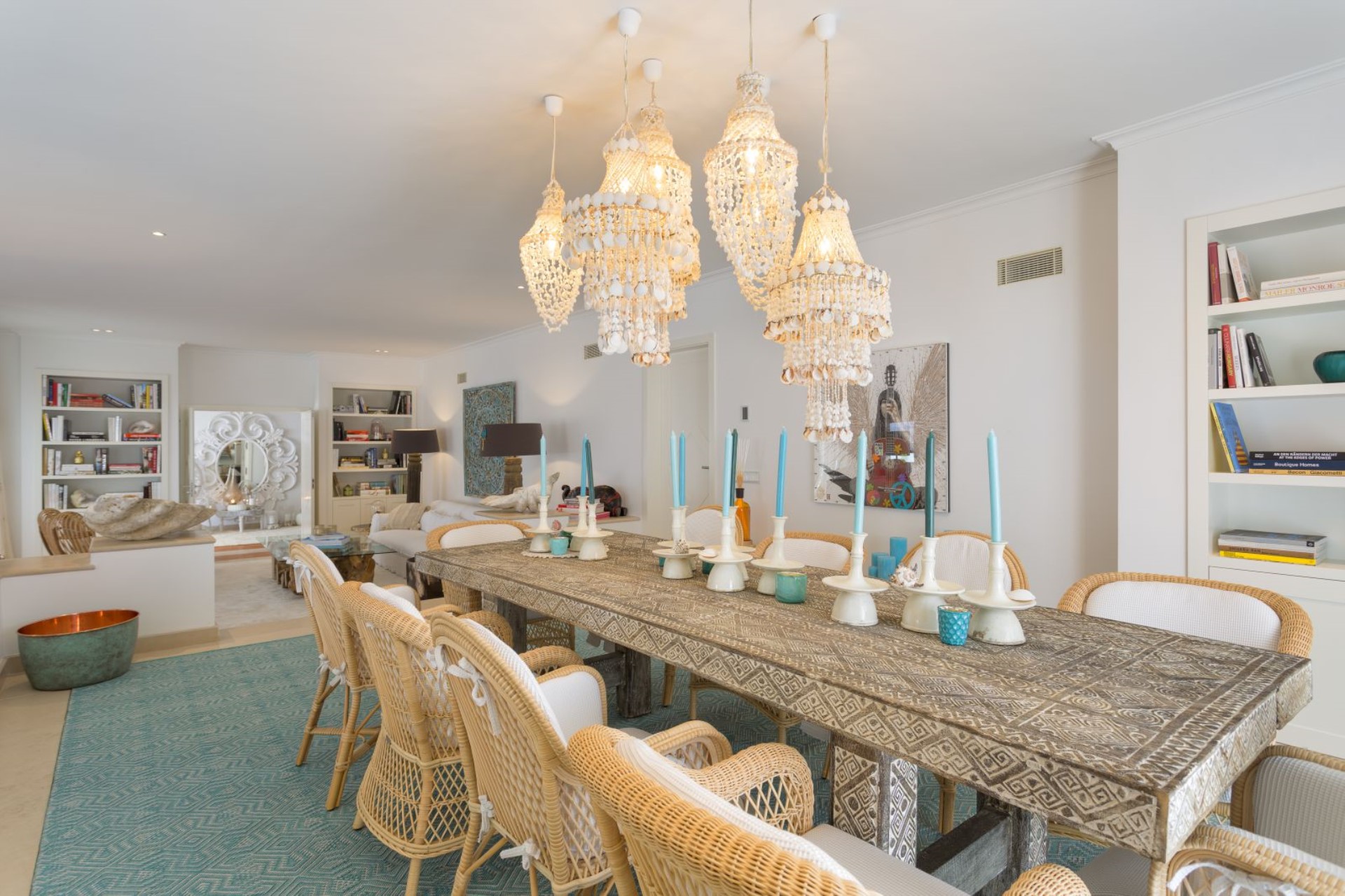 The interior of the 600 sq. m villa features a natural colour palette with marine accents. It has a boho-chic feel, decorated and furnished with unique items sources from around the globe, from hand-carved Buddha statues and handmade artisan furniture, to colourful bed throws and batik textiles.