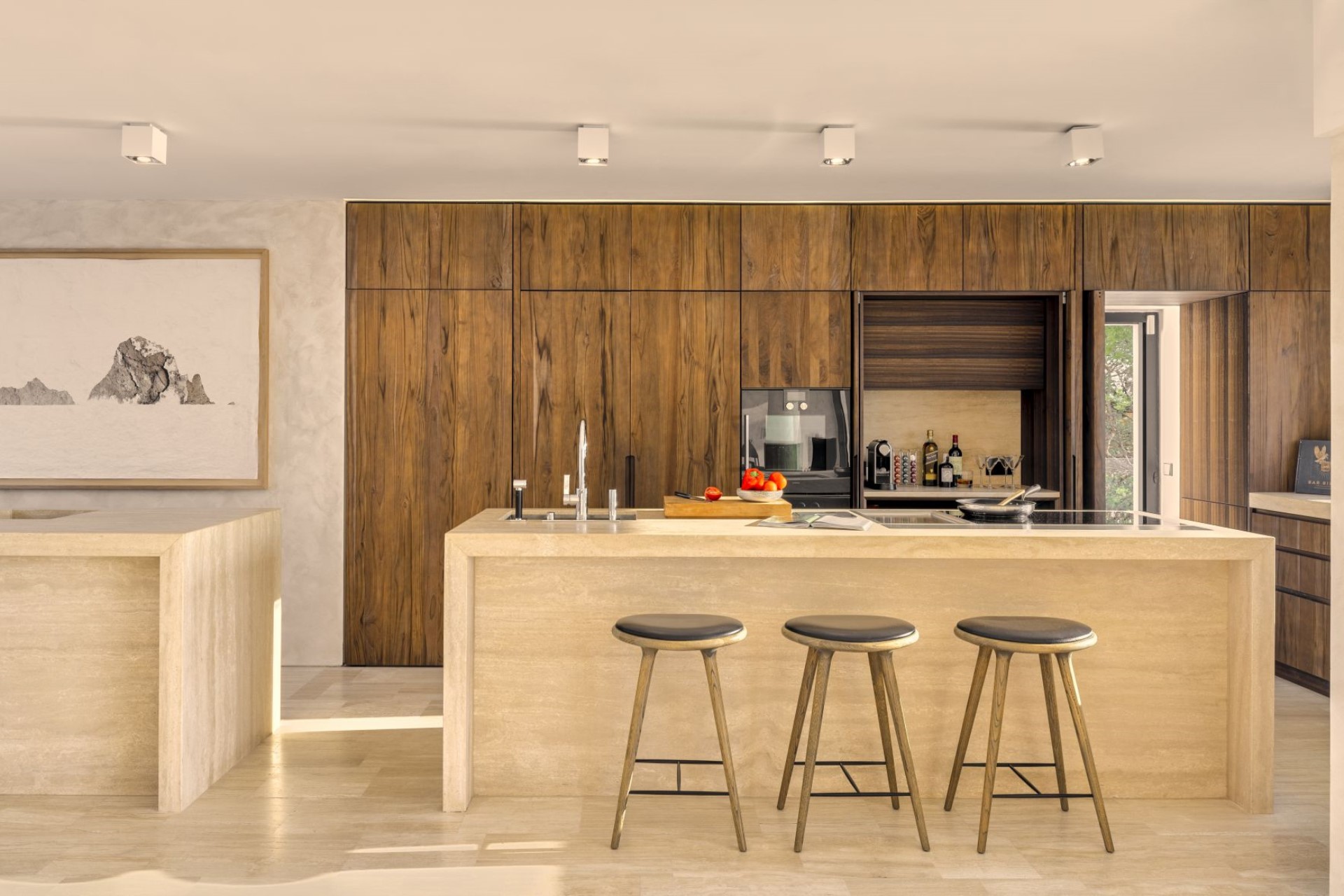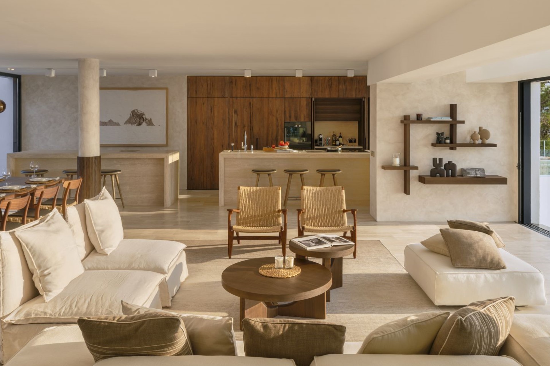 The contemporary style is evident throughout the villa, particularly in the open-plan living and dining areas, which are minimalist yet inviting. The living area opens onto one of the terraces, offering stunning views of the surrounding landscape. The villa also includes a fully equipped modern kitchen as well as a professional-grade kitchen suitable for catering.