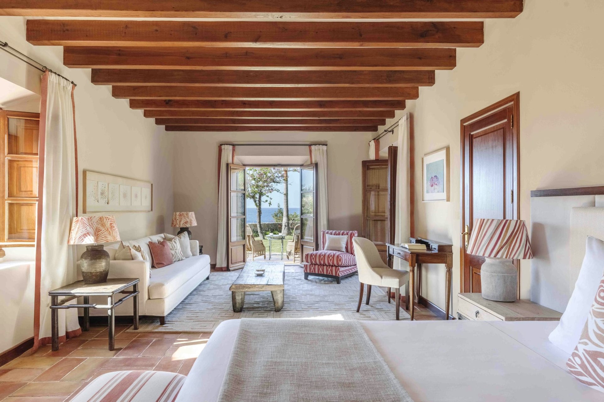 Bedroom 3 – king-size bed (or twins), lounge area with sofa bed, walk-in wardrobe, en-suite bathroom with bathtub & separate shower, and private terrace with sea views