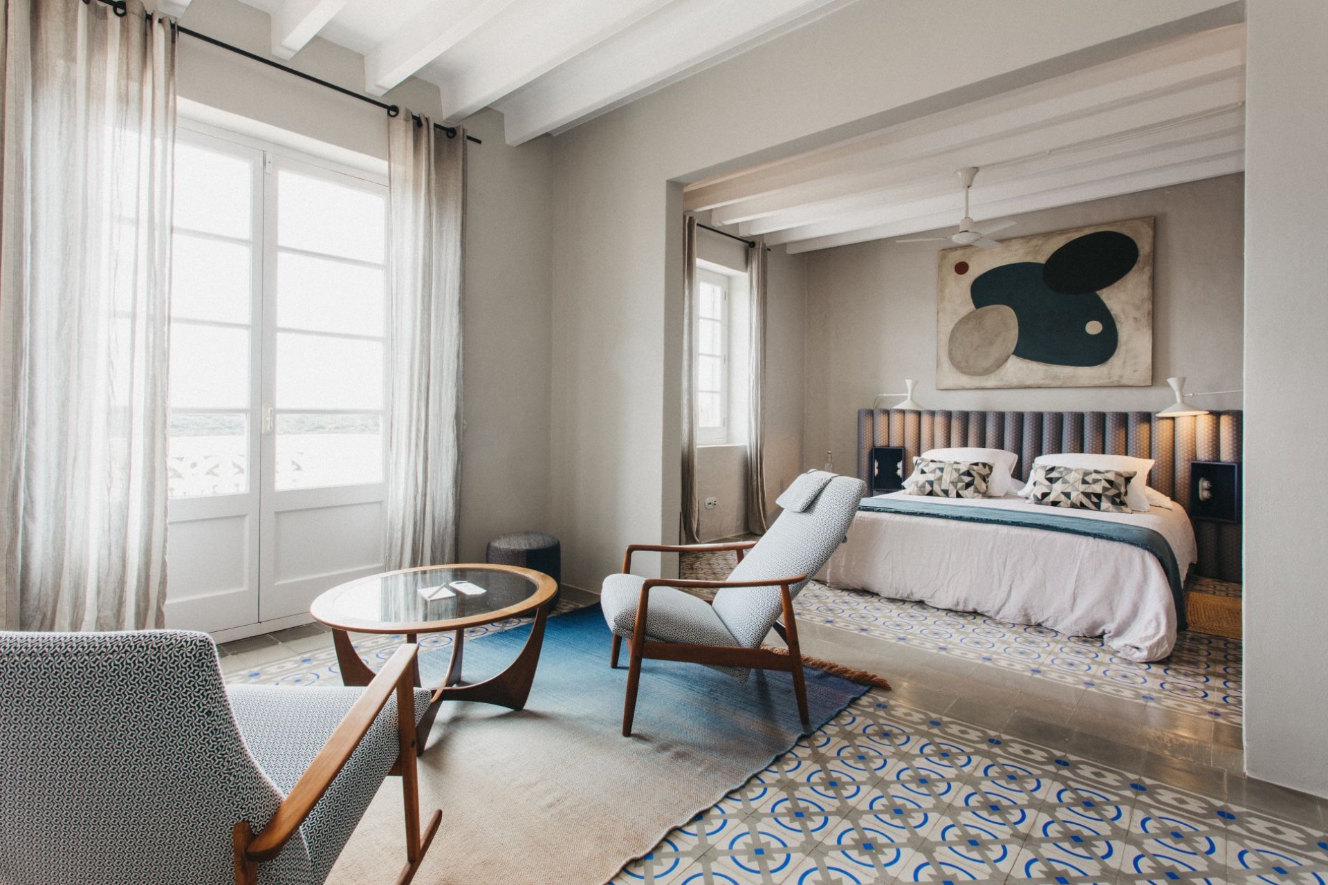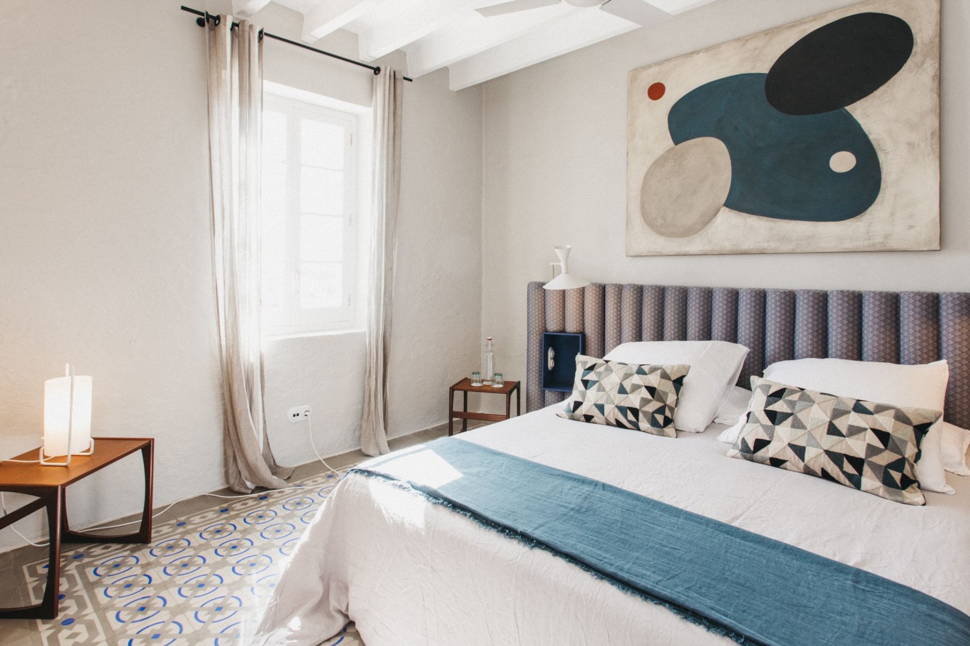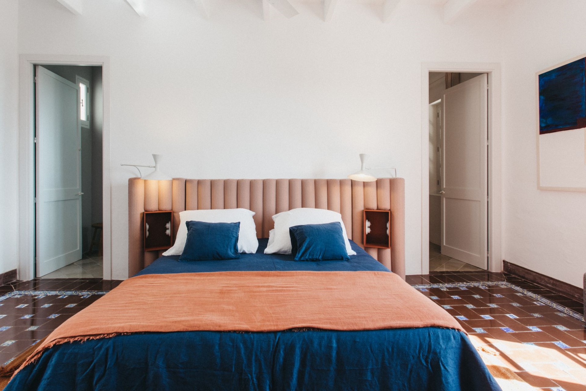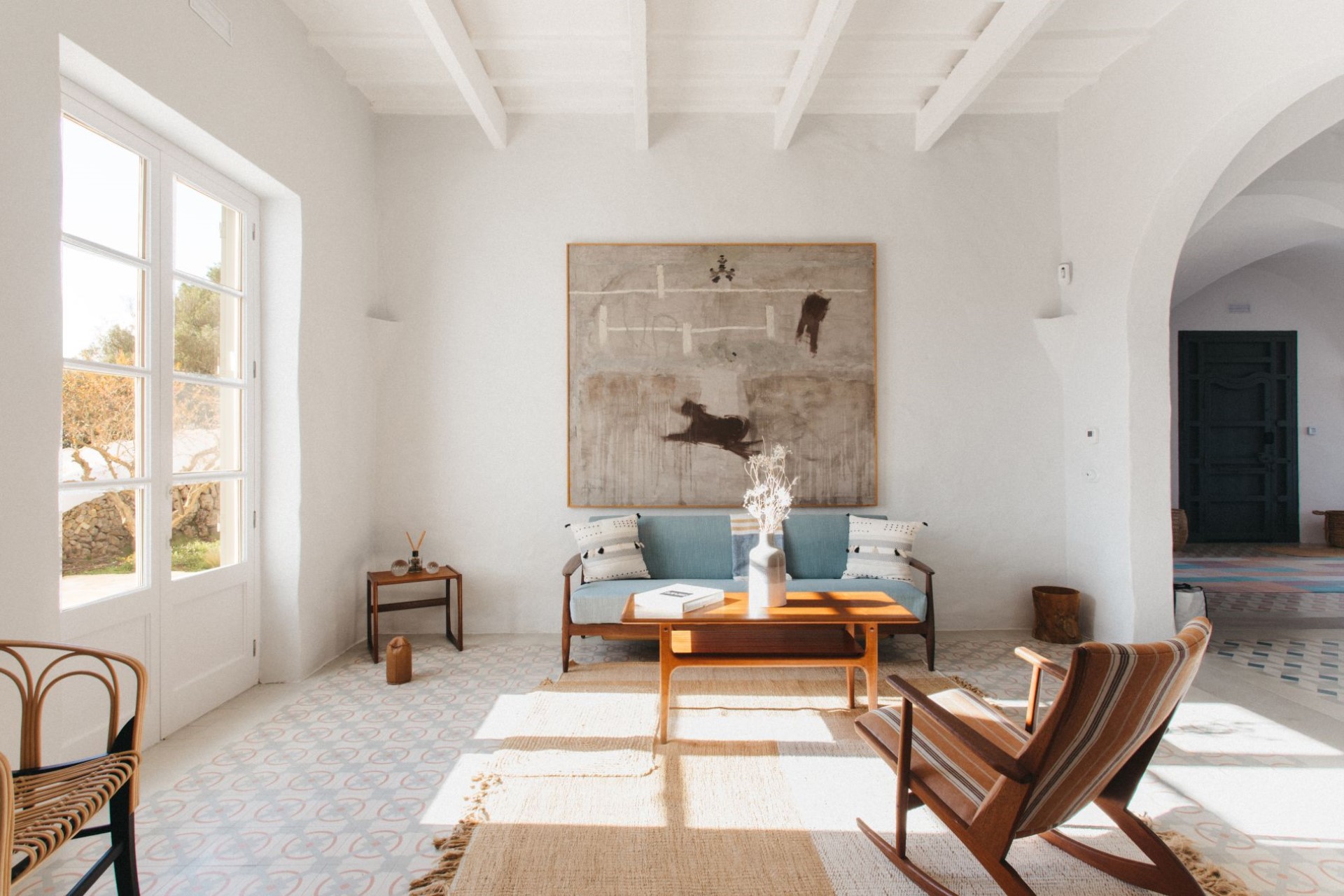 The villa’s interior exudes Menorcan style with white-washed walls and vaulted ceilings. It is beautifully-decorated with bespoke geometric tiling, mid-century furniture, and a mix of modern art and timeless photos of the original farm workers lining the walls.