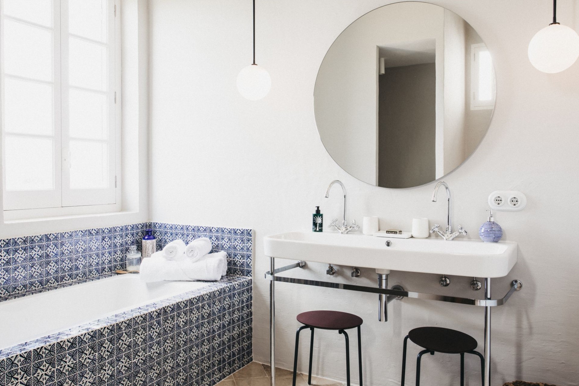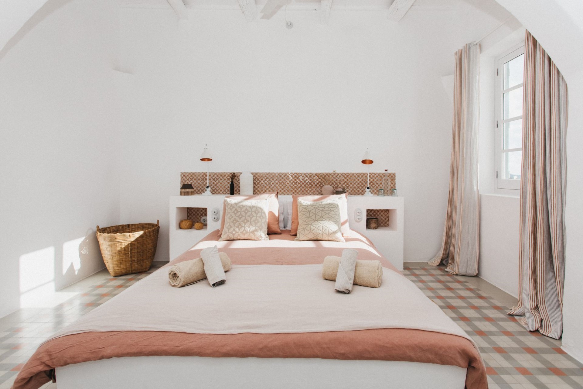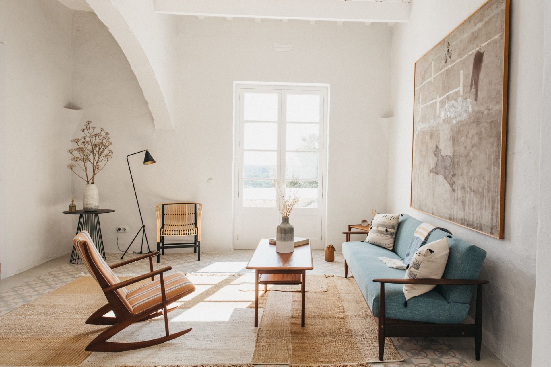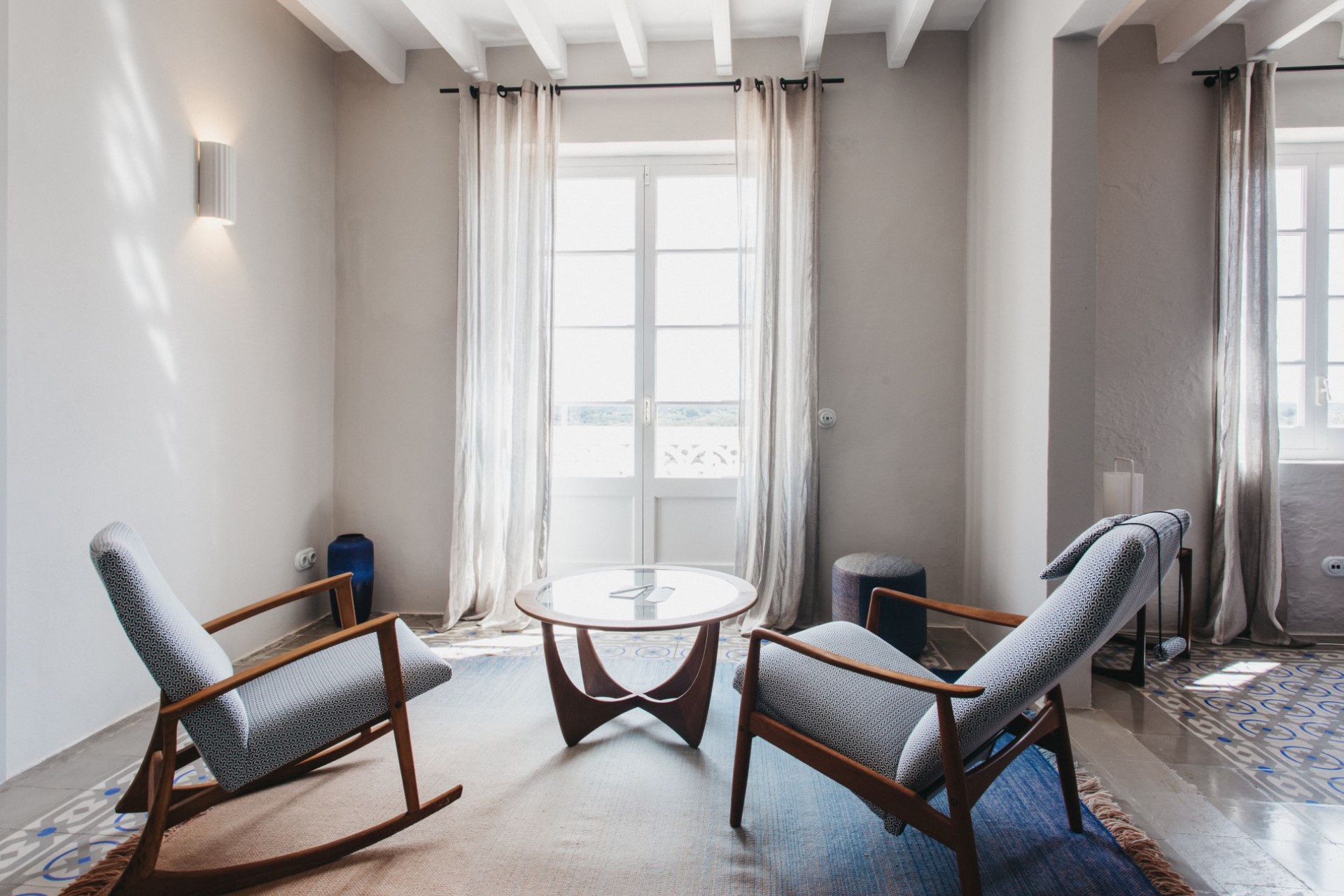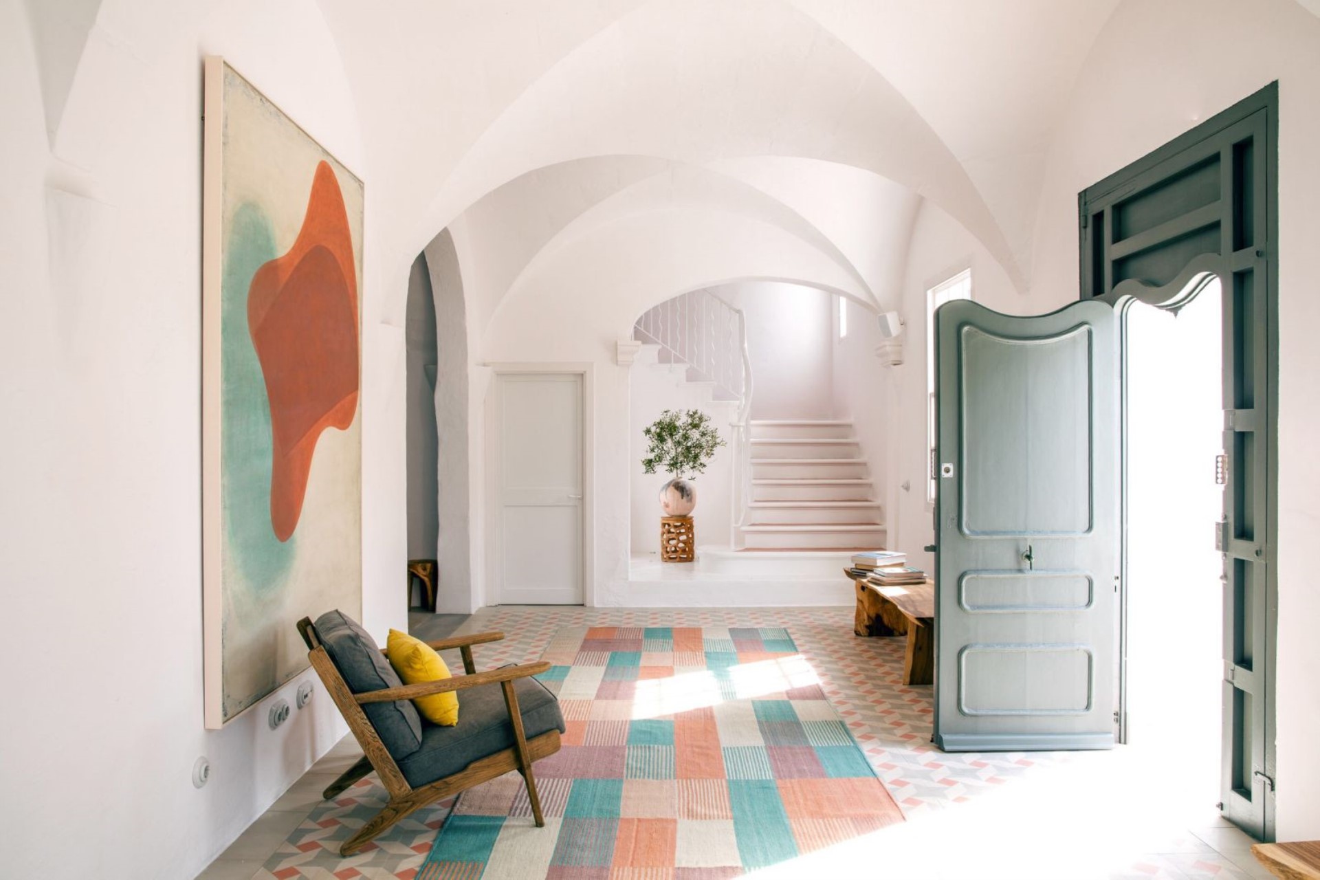 The villa’s interior exudes Menorcan style with white-washed walls and vaulted ceilings. It is beautifully-decorated with bespoke geometric tiling, mid-century furniture, and a mix of modern art and timeless photos of the original farm workers lining the walls.