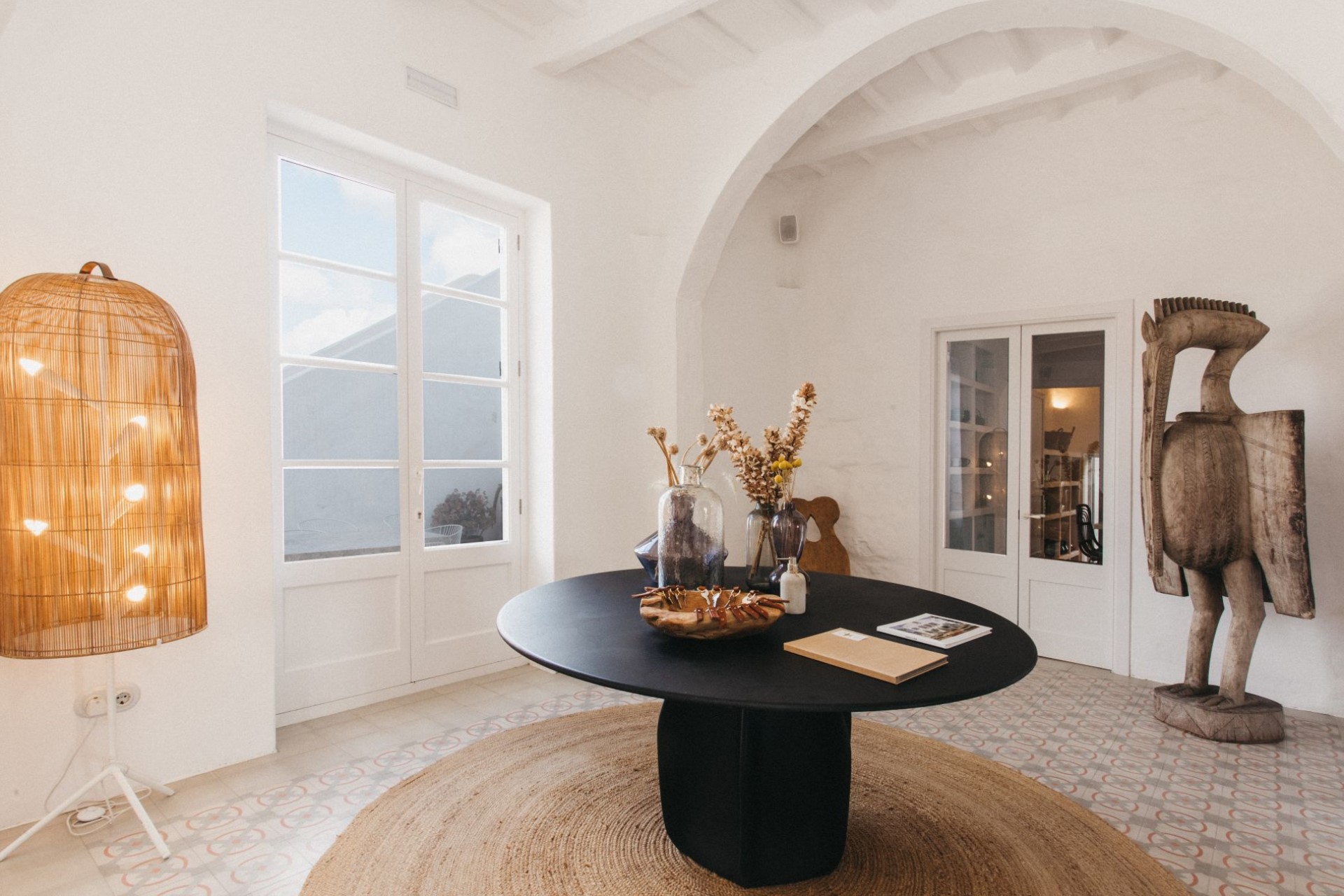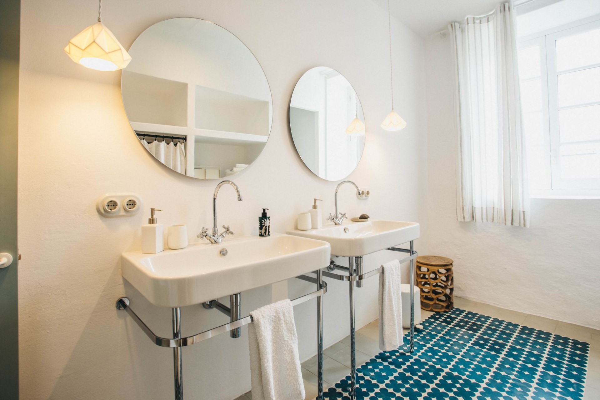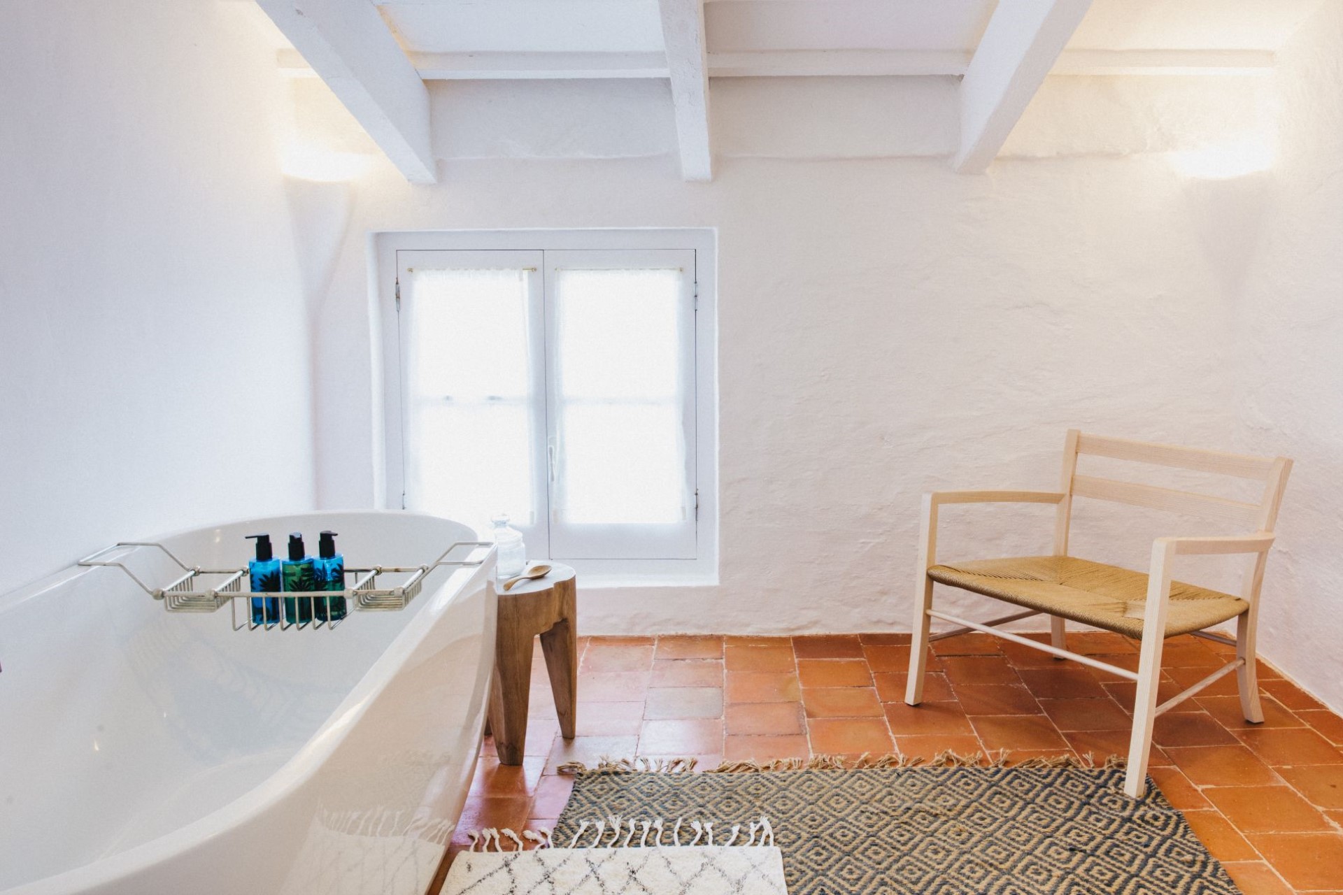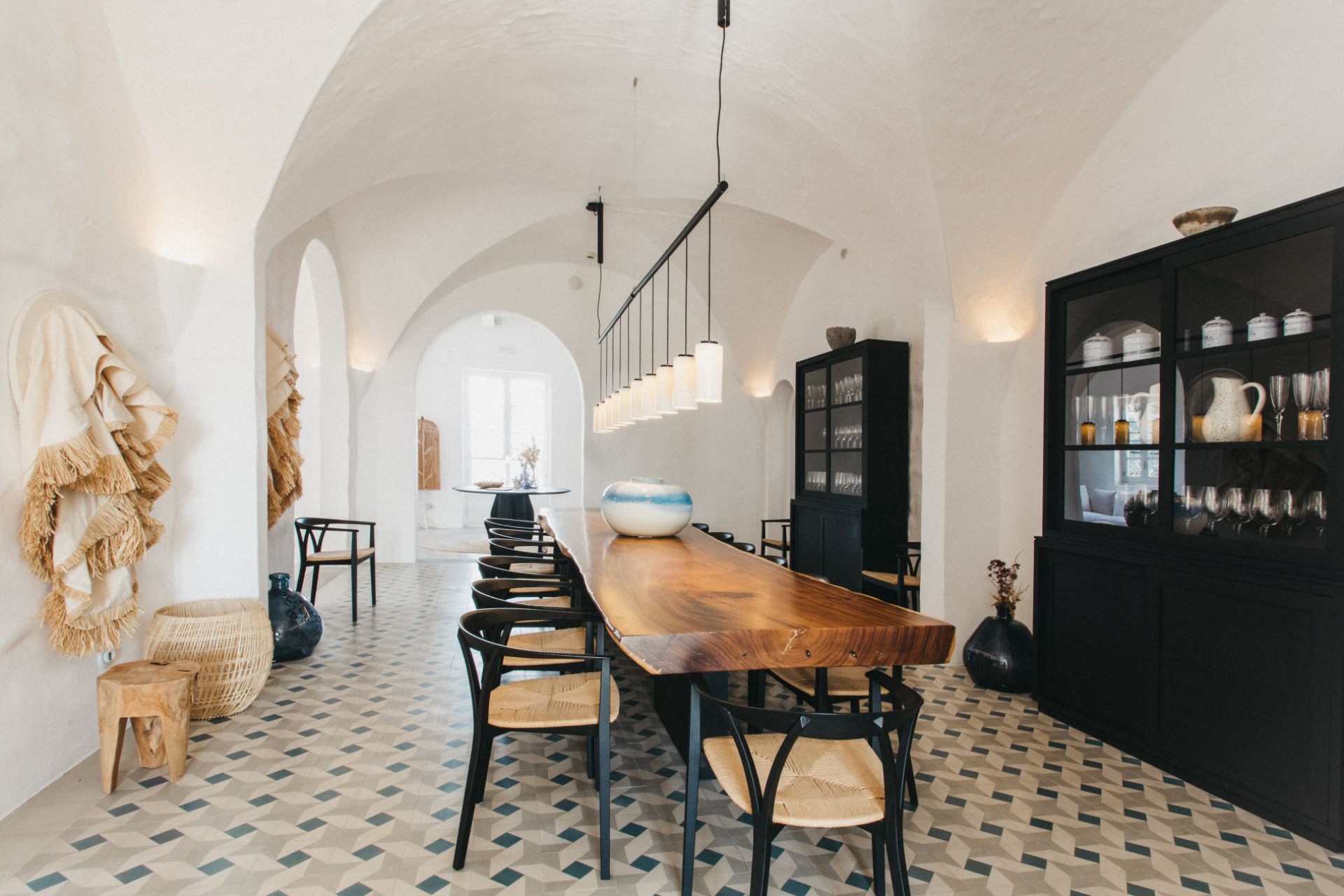 The villa’s interior exudes Menorcan style with white-washed walls and vaulted ceilings. It is beautifully-decorated with bespoke geometric tiling, mid-century furniture, and a mix of modern art and timeless photos of the original farm workers lining the walls.
