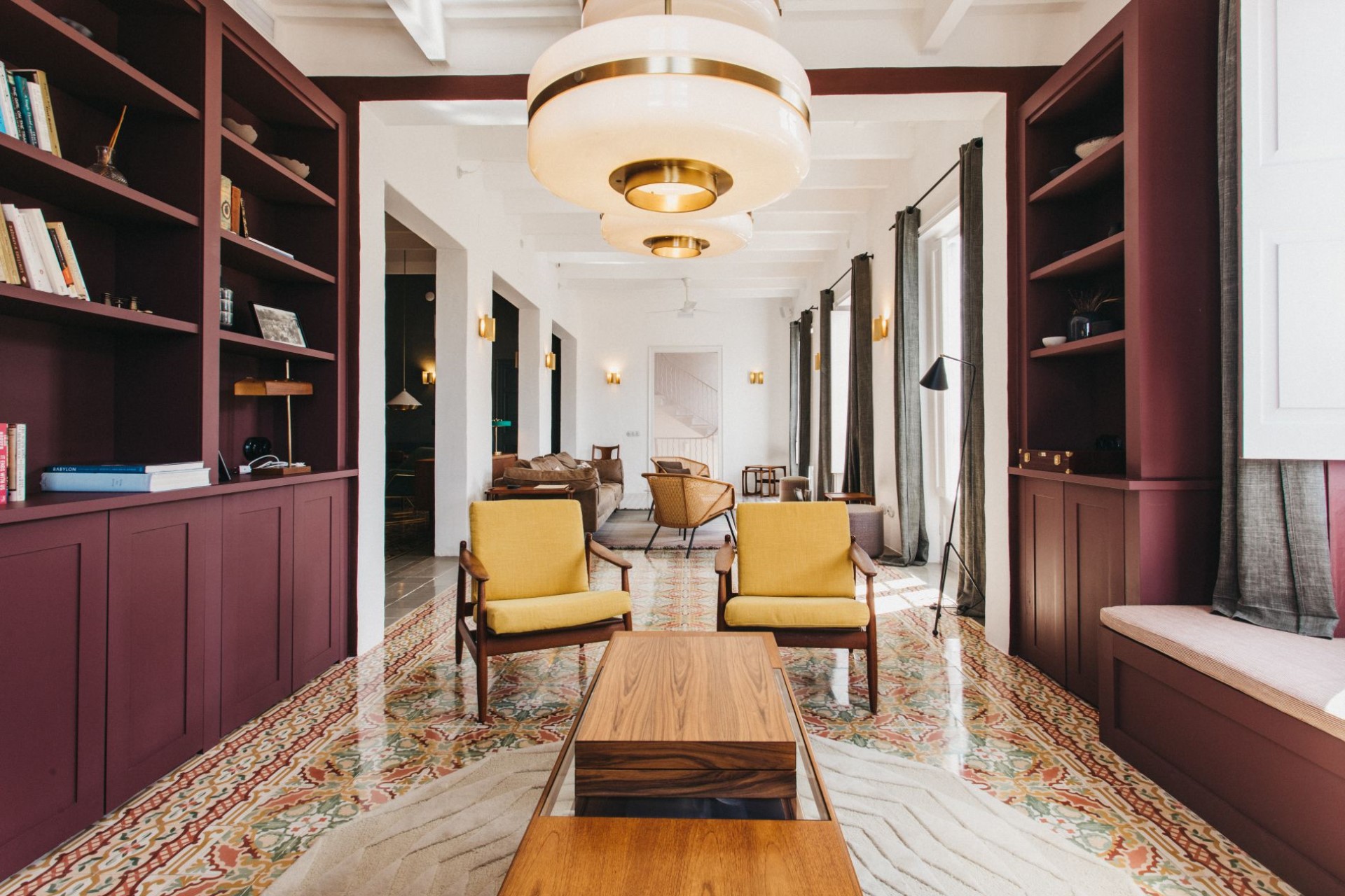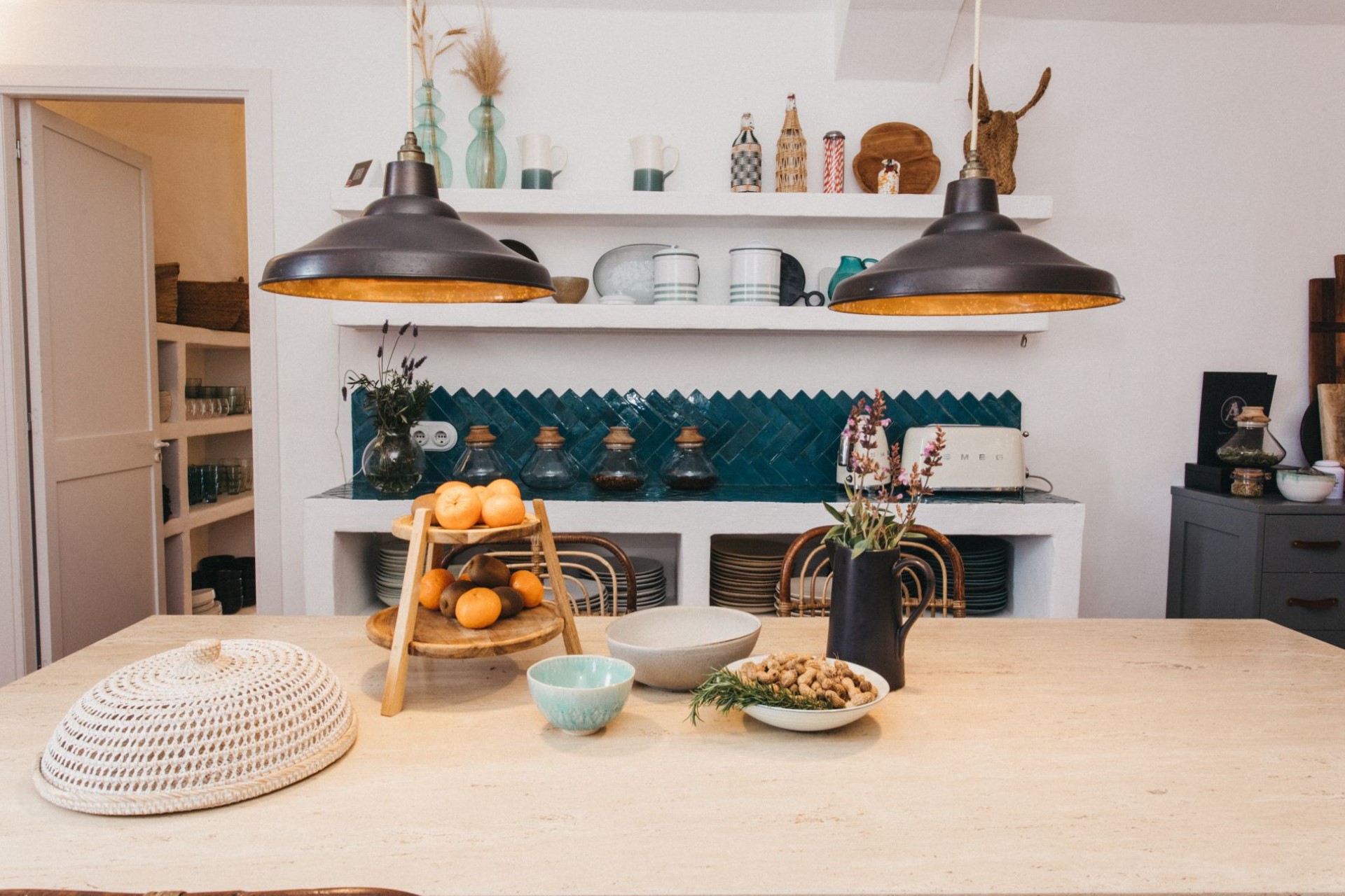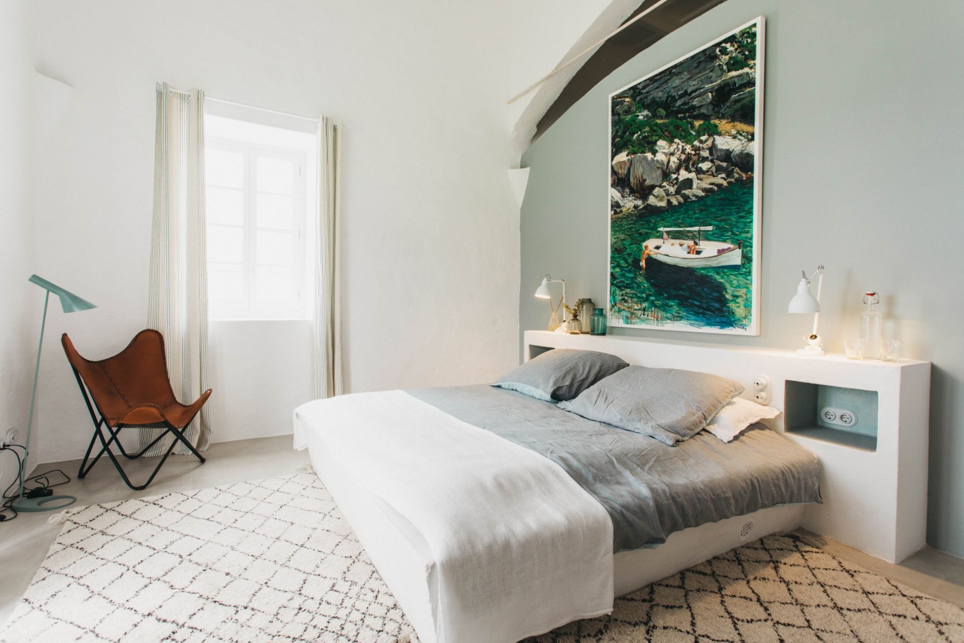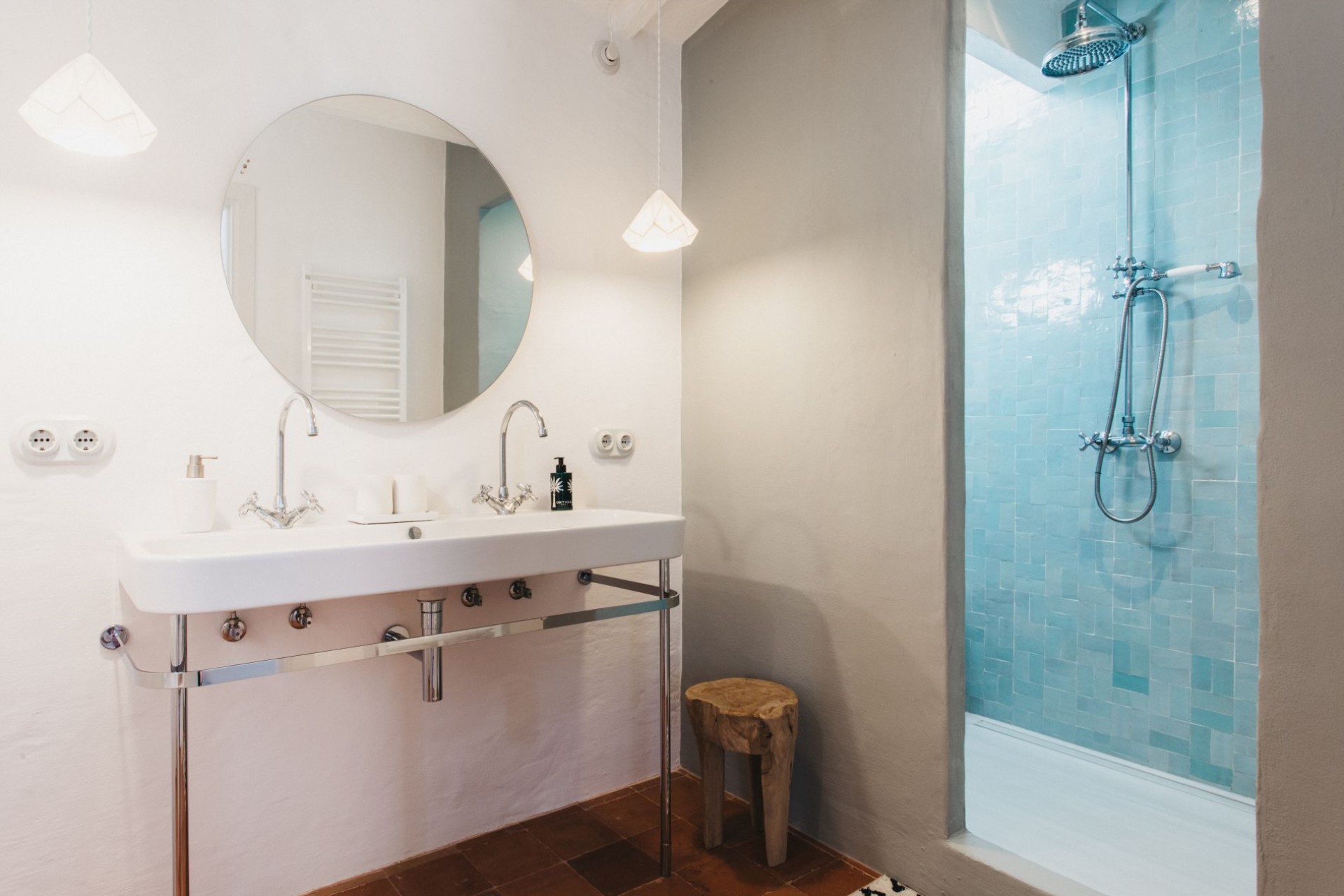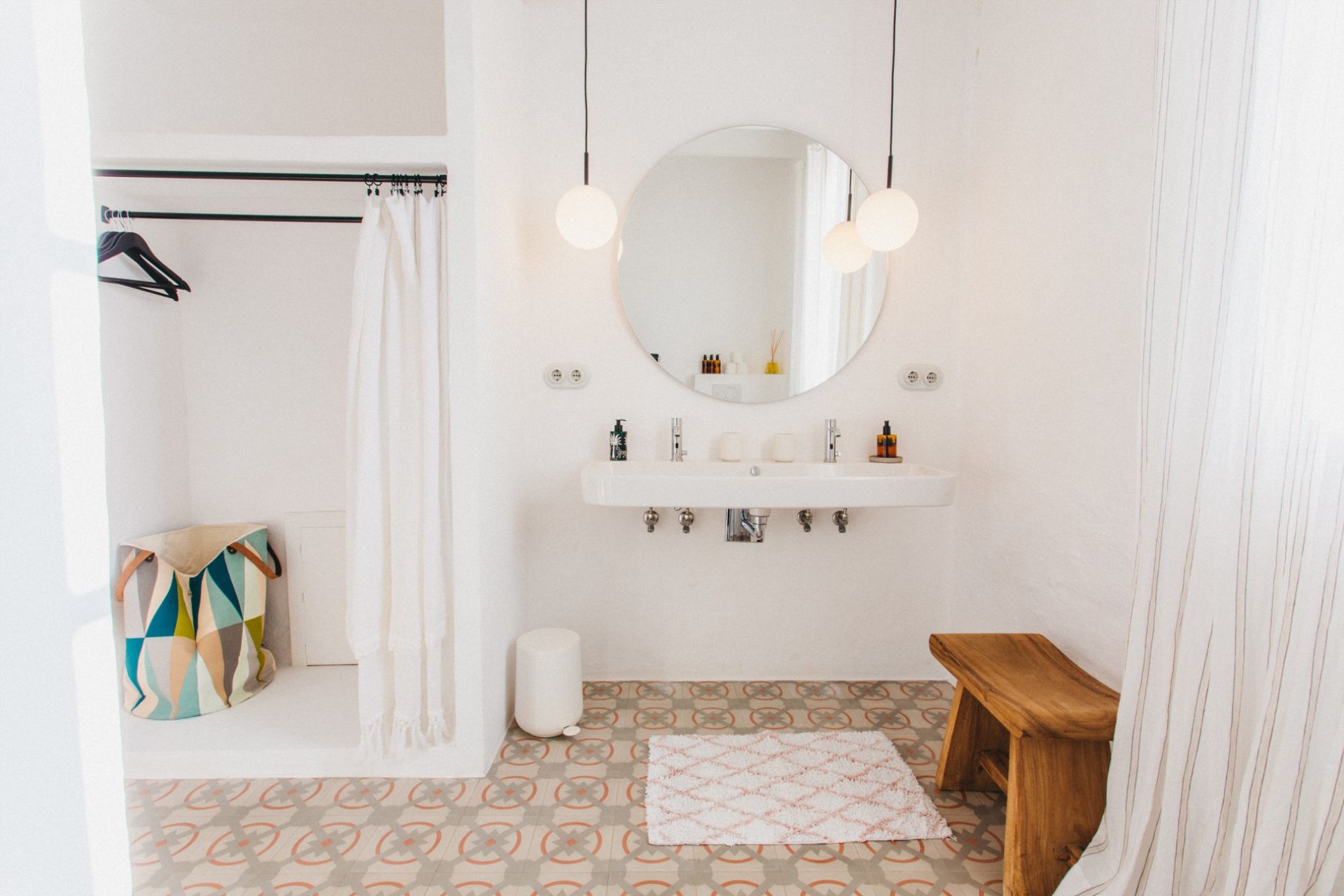 The villa’s interior exudes Menorcan style with white-washed walls and vaulted ceilings. It is beautifully-decorated with bespoke geometric tiling, mid-century furniture, and a mix of modern art and timeless photos of the original farm workers lining the walls.