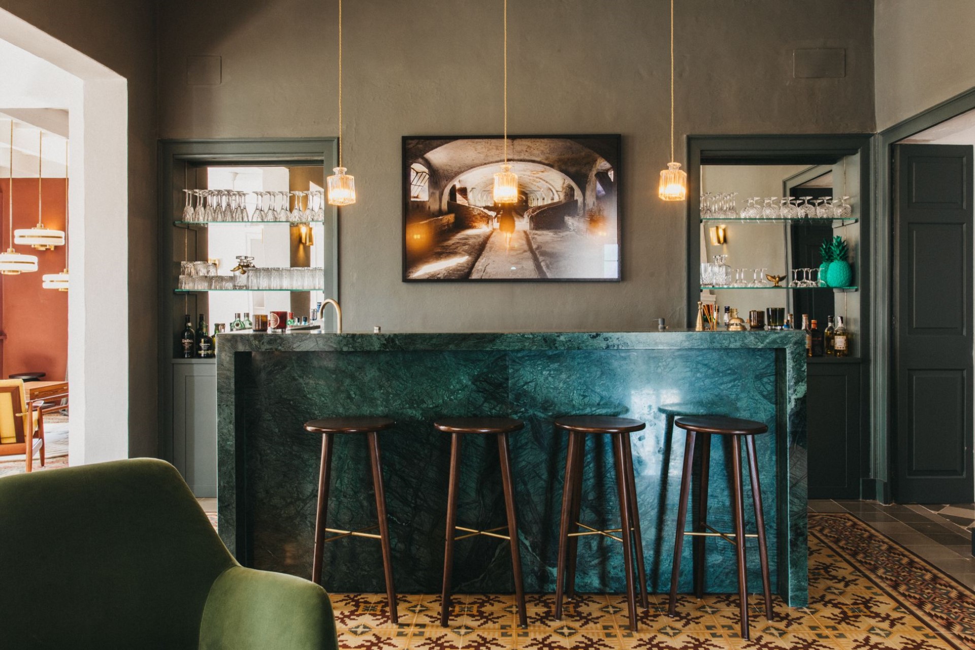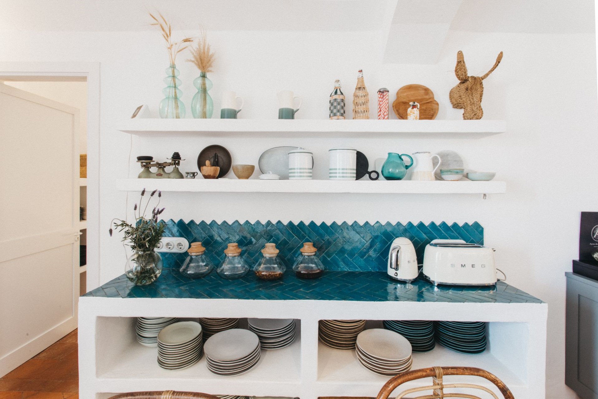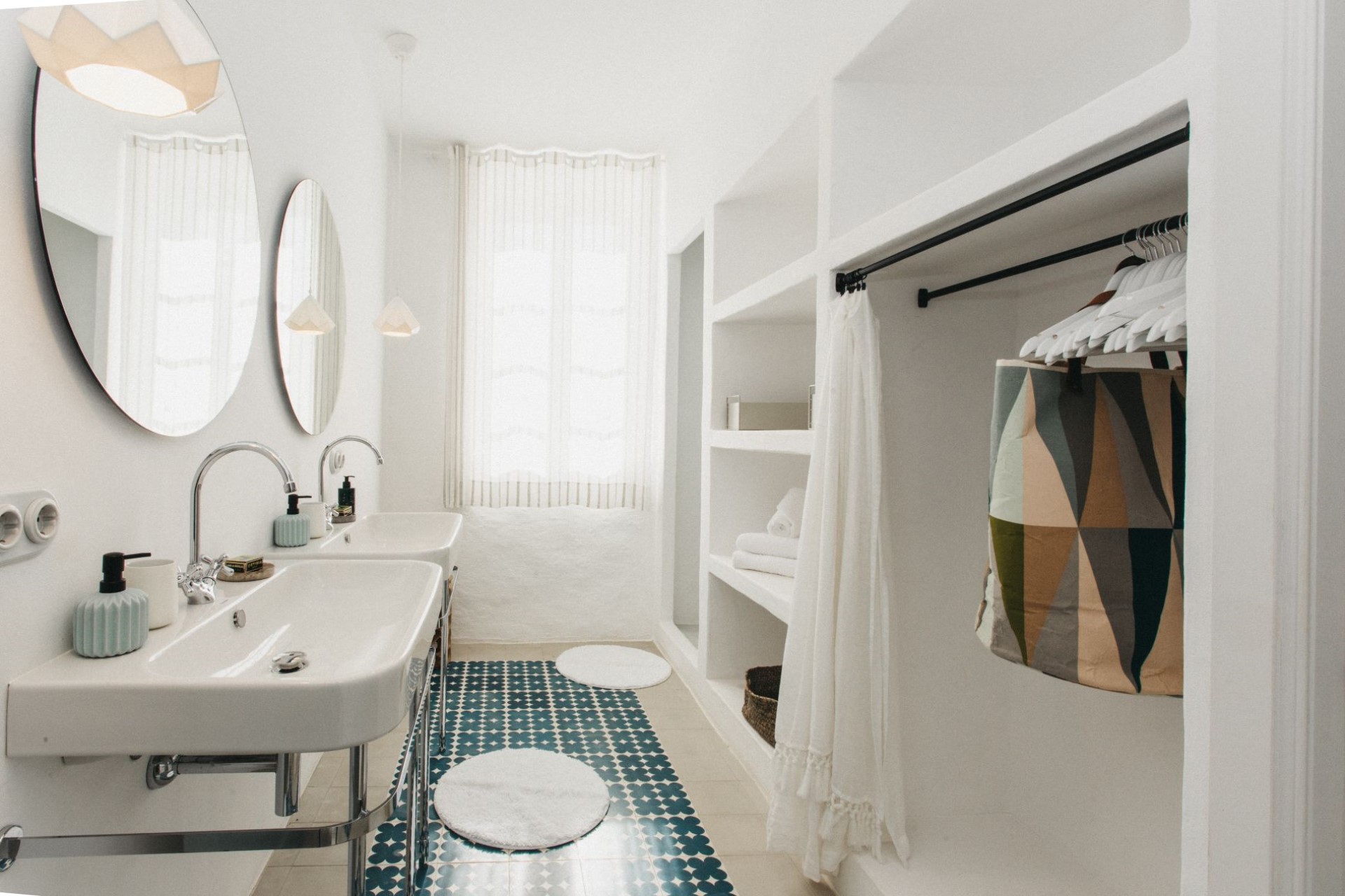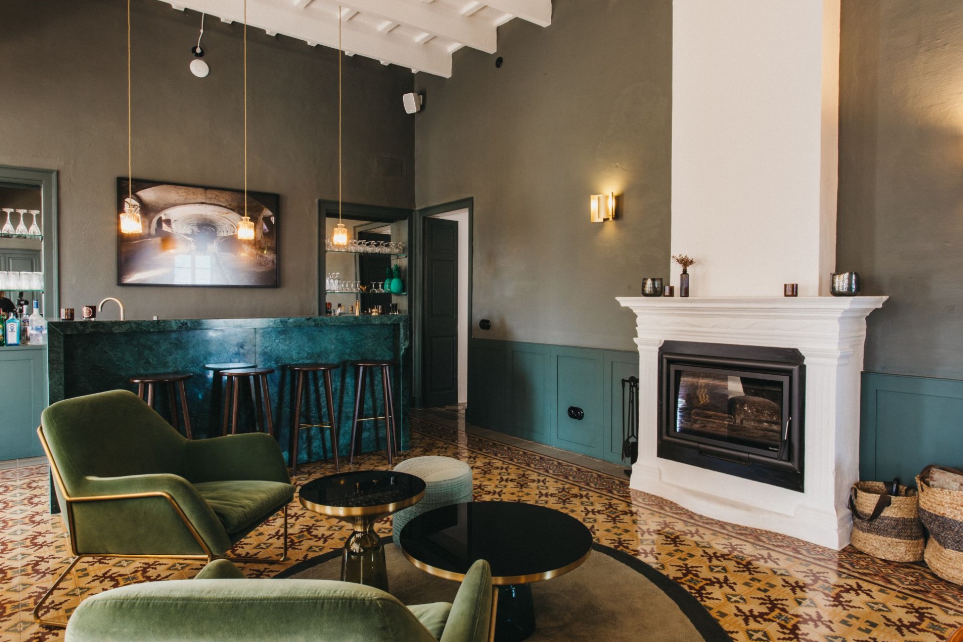 The villa’s interior exudes Menorcan style with white-washed walls and vaulted ceilings. It is beautifully-decorated with bespoke geometric tiling, mid-century furniture, and a mix of modern art and timeless photos of the original farm workers lining the walls.