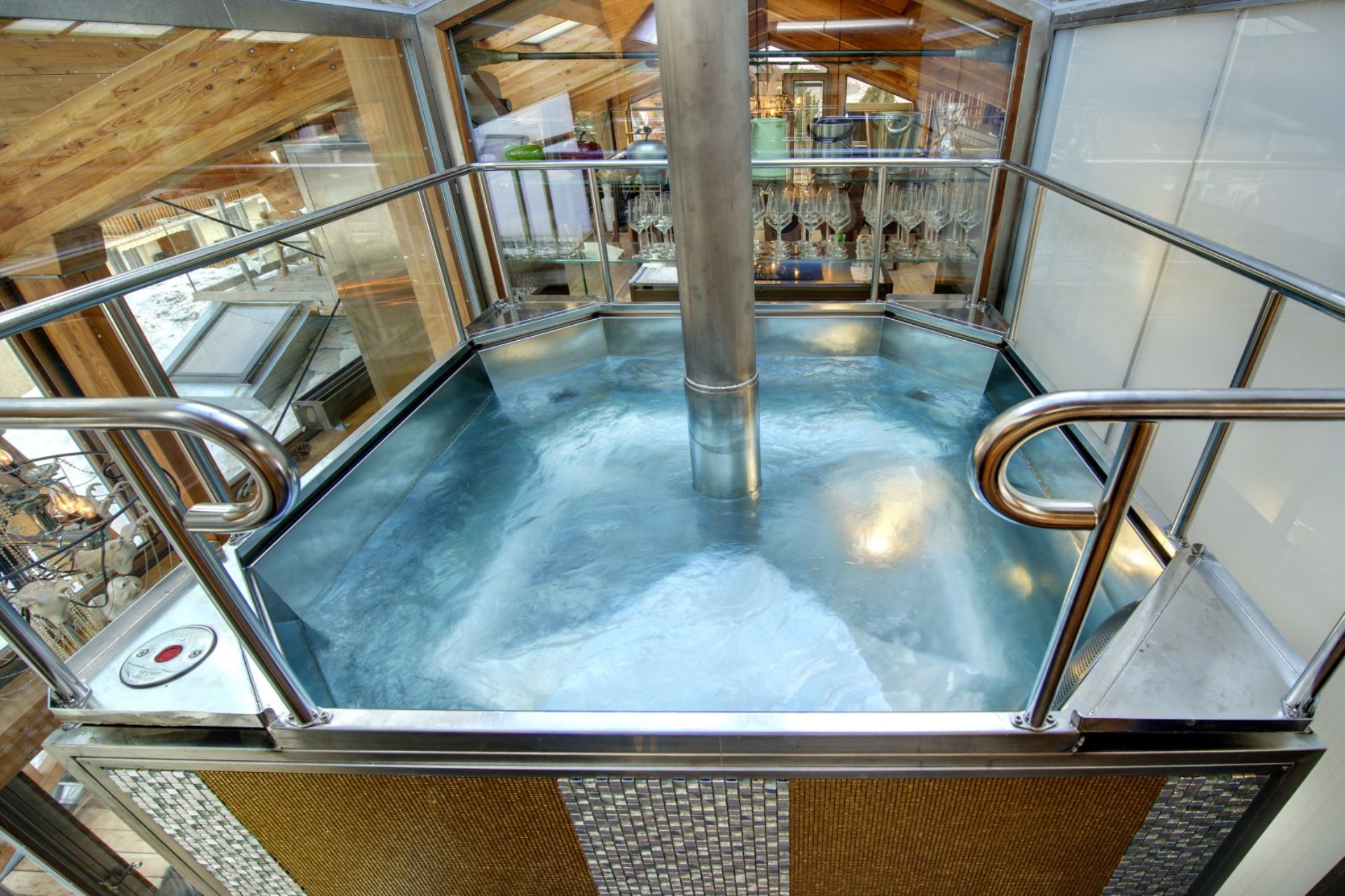 The standout feature of this property is its hydraulic Jacuzzi, which rises to the rooftop with a click of a button, affording guests the luxury of enjoying a rejuvenating soak under Zermatt’s moonlit sky.