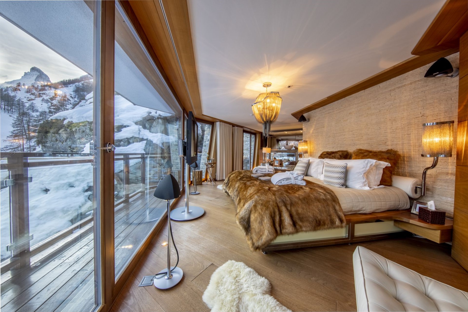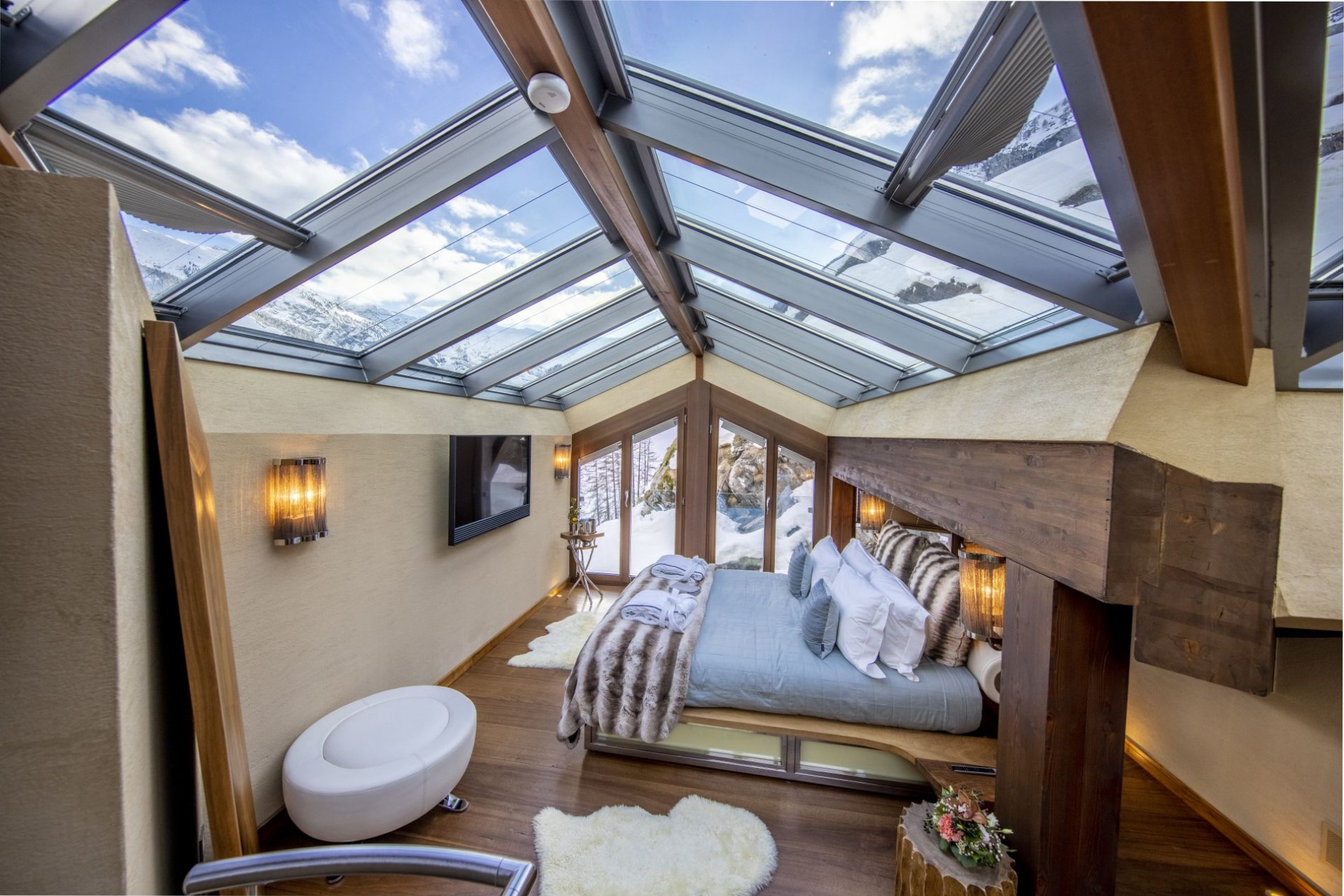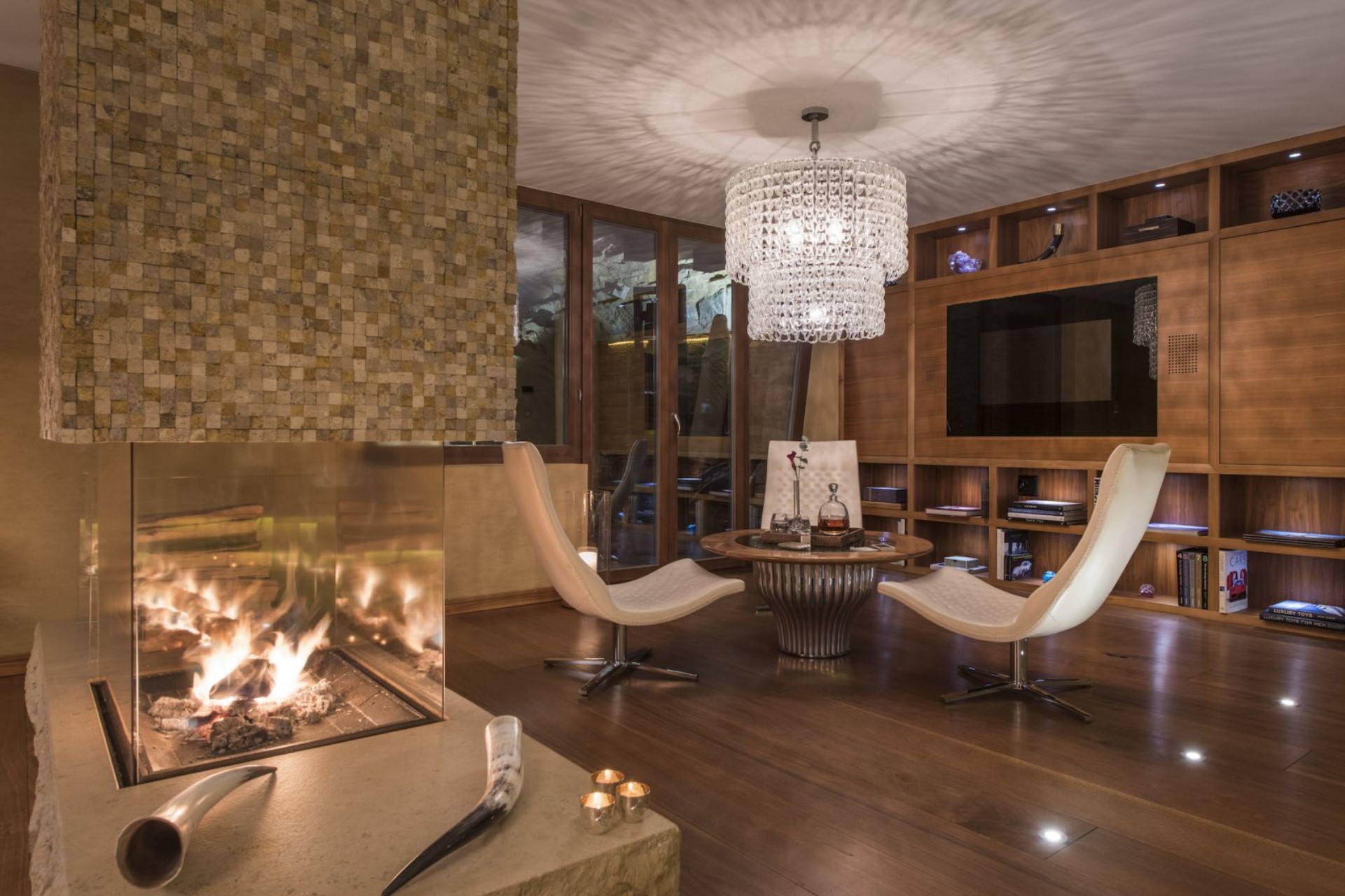 The entire second floor living and dining area has floor to ceiling windows, affording panoramic views over the village and with an uninterrupted view of the Matterhorn. The modern lounge has a double height glass ceiling, allowing light to flood through the chalet. The library area features a cosy fireplace, perfect for relaxing with a good book or enjoying afternoon tea and drinks.