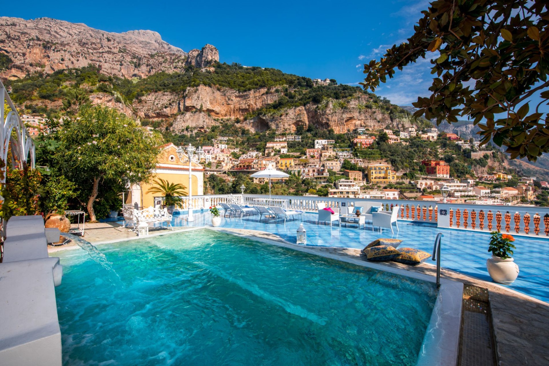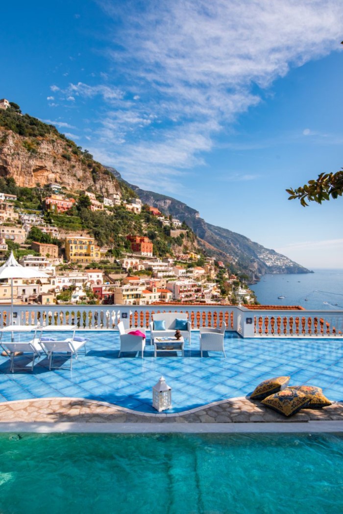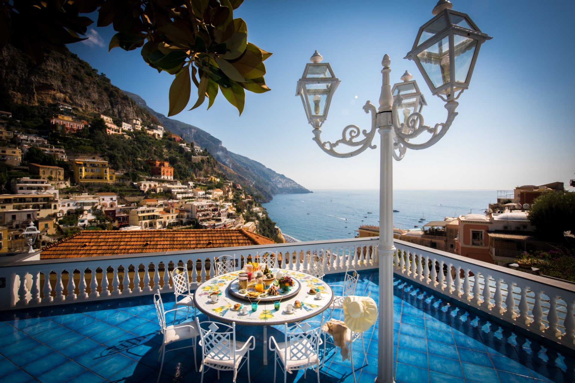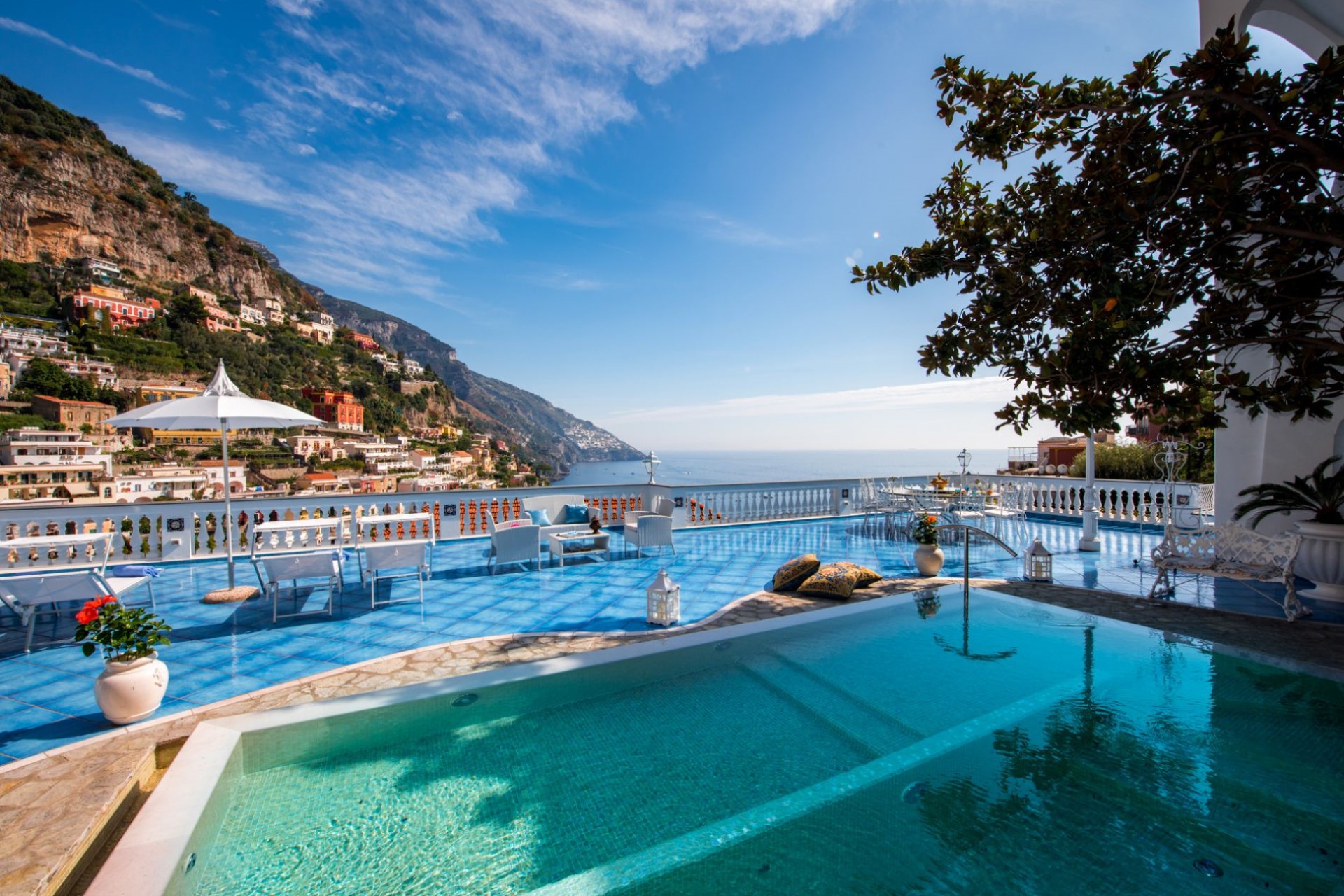 The extensive terrace offers some of the most impressive views of the sea and Positano which guests can enjoy from benches, chairs or sun loungers found by the pool.
